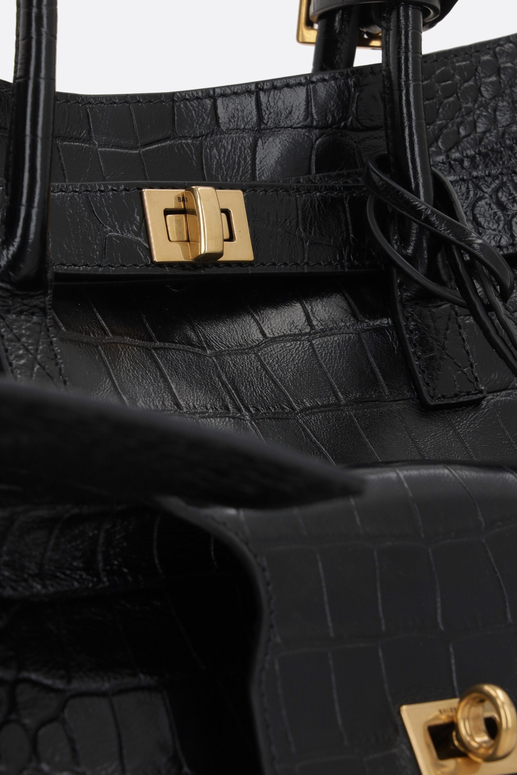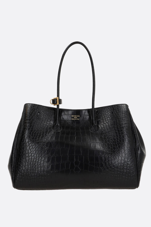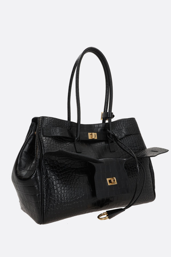 Balenciaga handbag crafted from black crocodile-embossed leather with embossed logo lettering on the back. Featuring antiqued gold-tone hardware, double handles, metal protective feet, and side snap buttons to adjust capacity. The black leather-lined interior includes a zipped pocket. The design is completed with a large front pocket with decorative flaps, two keyring loops with leather case, and a front strap with turn-lock closure.
