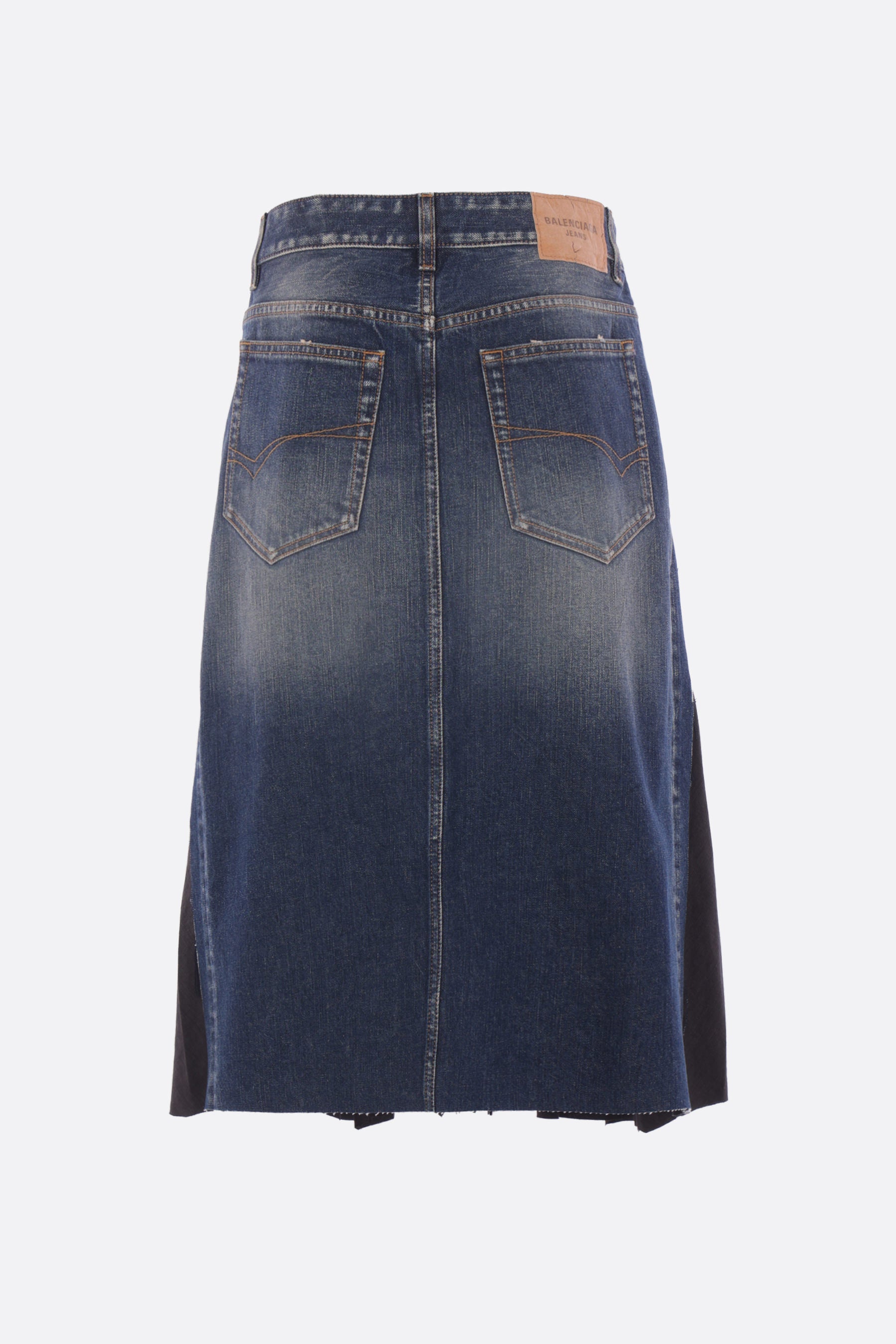 Balenciaga deconstructed midi skirt crafted from black washed linen-cotton twill at the front and blue cotton denim at the back. Featuring a side invisible zip closure, rear patch pockets, pleated design at the front, asymmetrical hem with raw edge, and unlined interior.