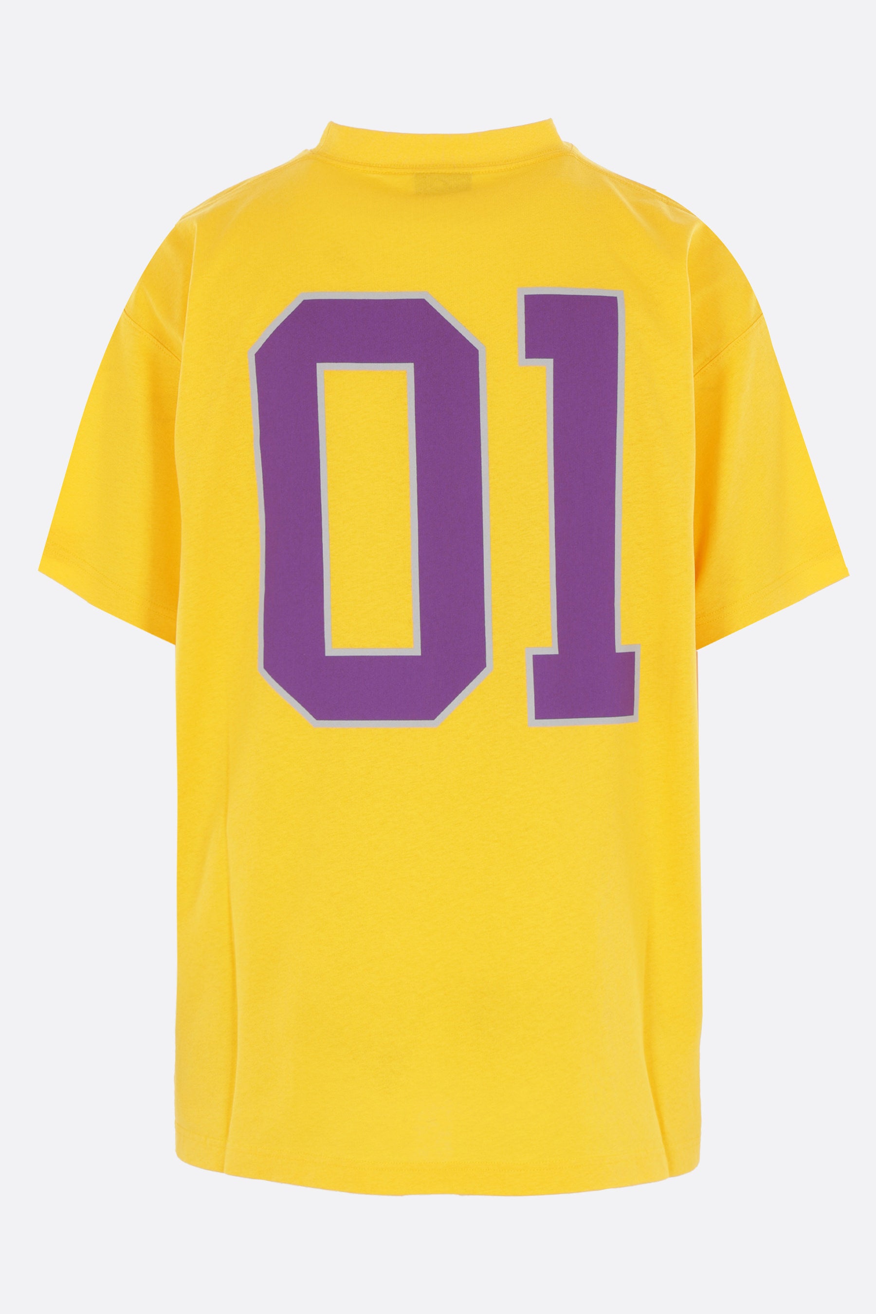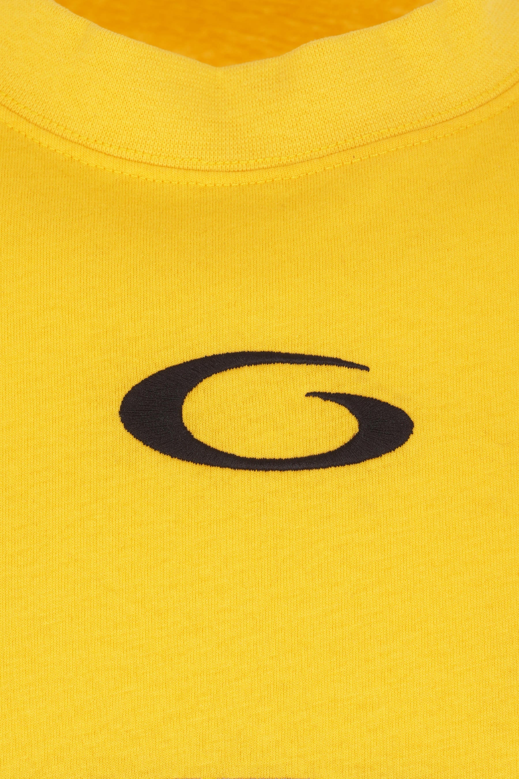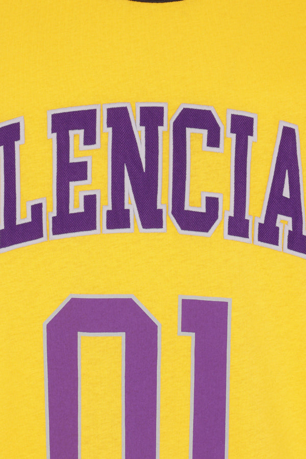 Balenciaga oversized t-shirt crafted from yellow cotton jersey, featuring embroidered basketball motif on the front and back. Designed with a crew neckline, short sleeves, and straight hem.