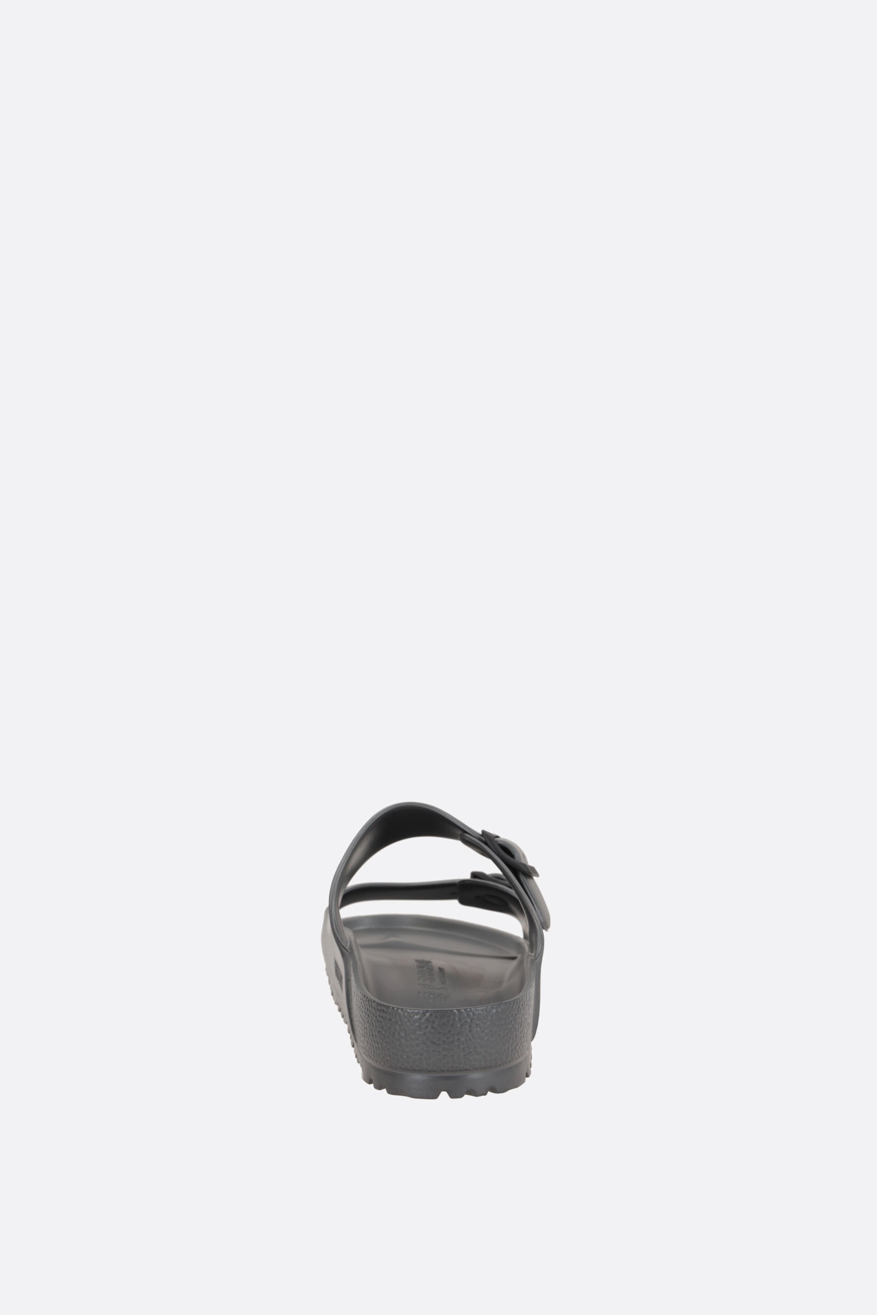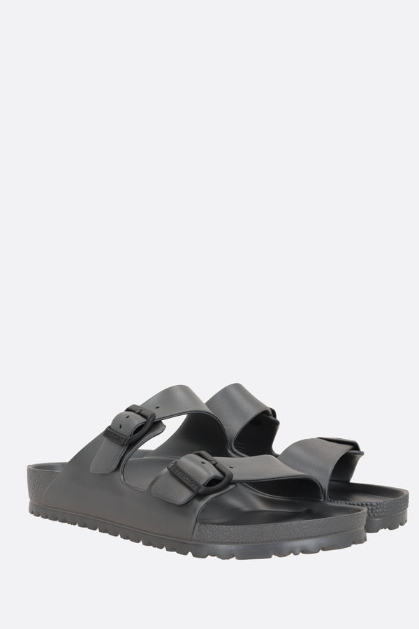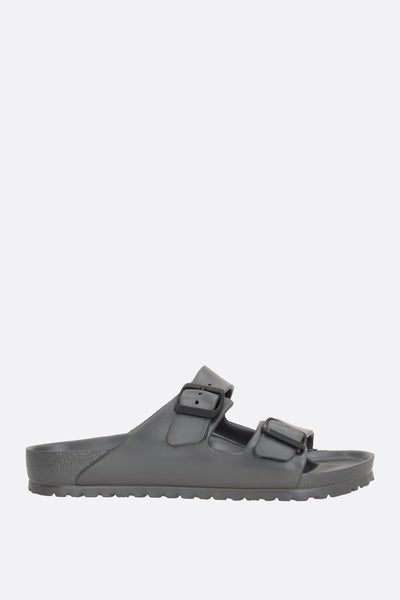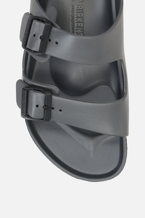 Birkenstock flat sandals entirely crafted from anthracite grey EVA rubber. Featuring a round toe, adjustable straps with buckles, and an anatomical footbed. The design is completed with the iconic embossed side logo.