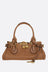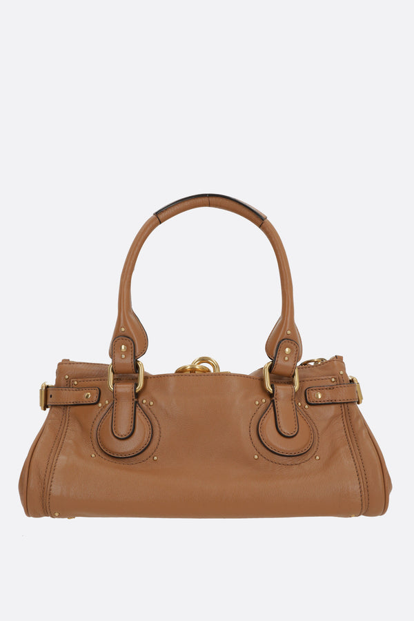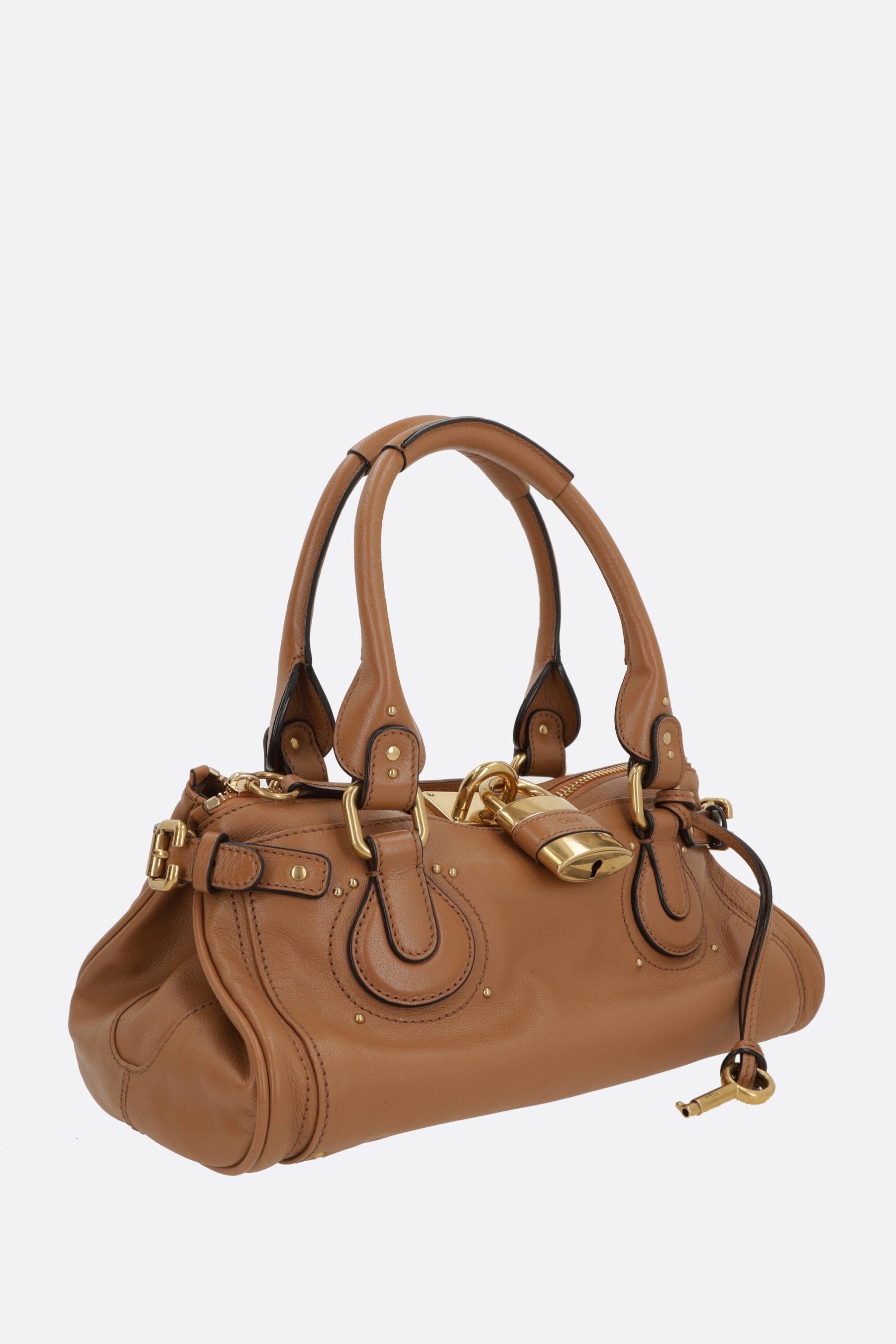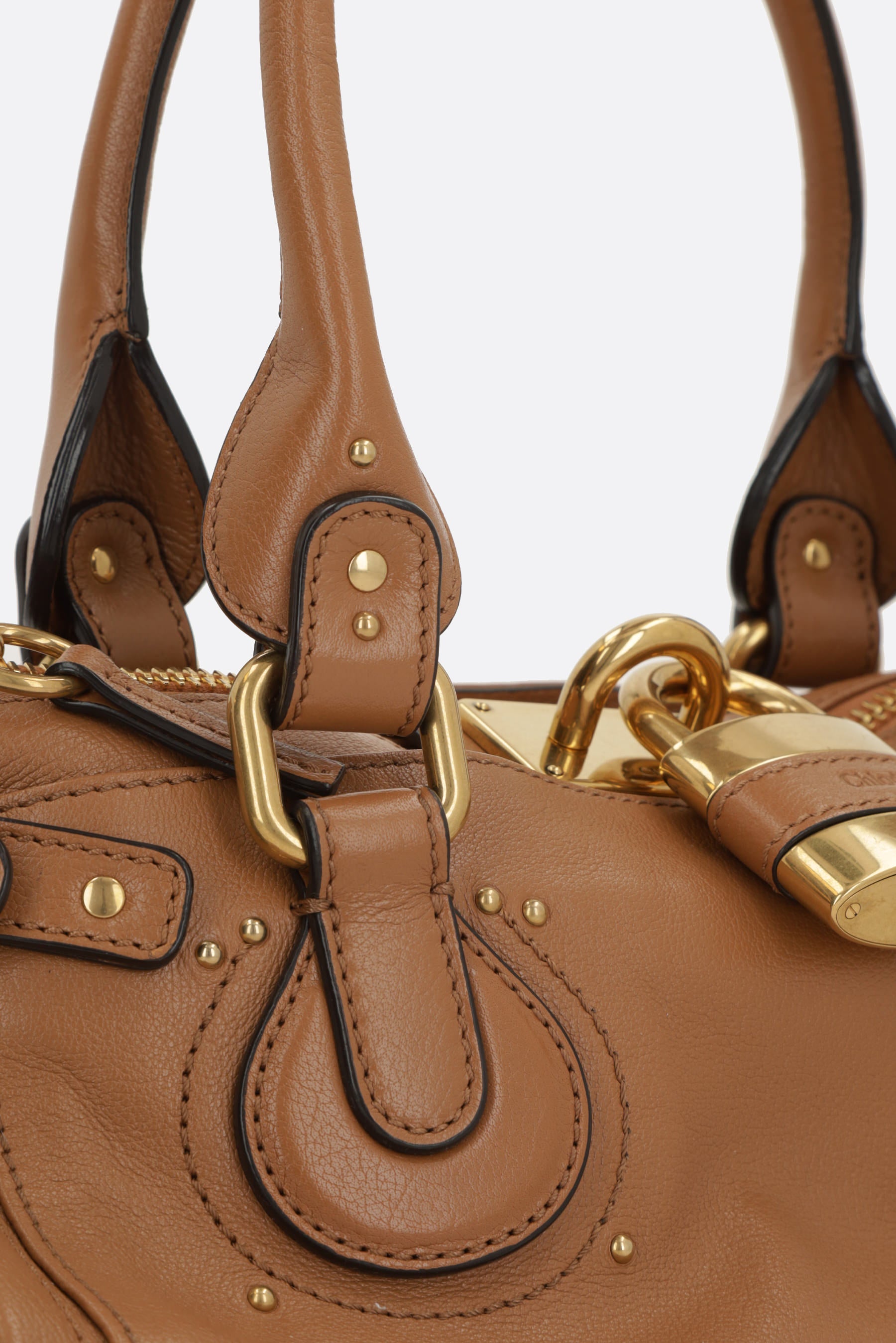 Shoulder bag by Chloé crafted from grained brown leather. Featuring antique gold-tone hardware, zip closure, and double shoulder straps. The black canvas-lined interior includes a flat pocket. The design is completed with two external pockets, a decorative padlock with embossed logo, and side straps to adjust the width.