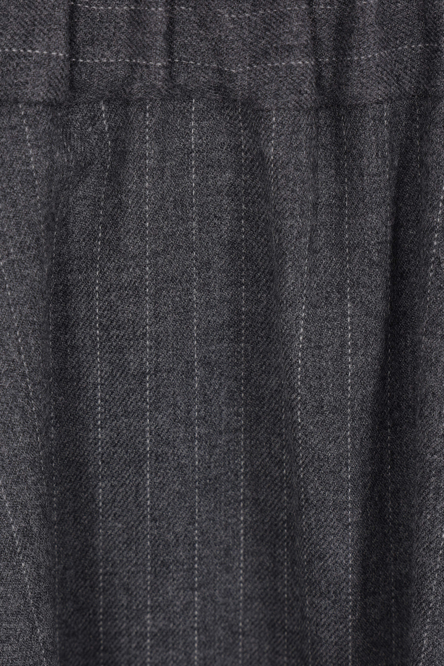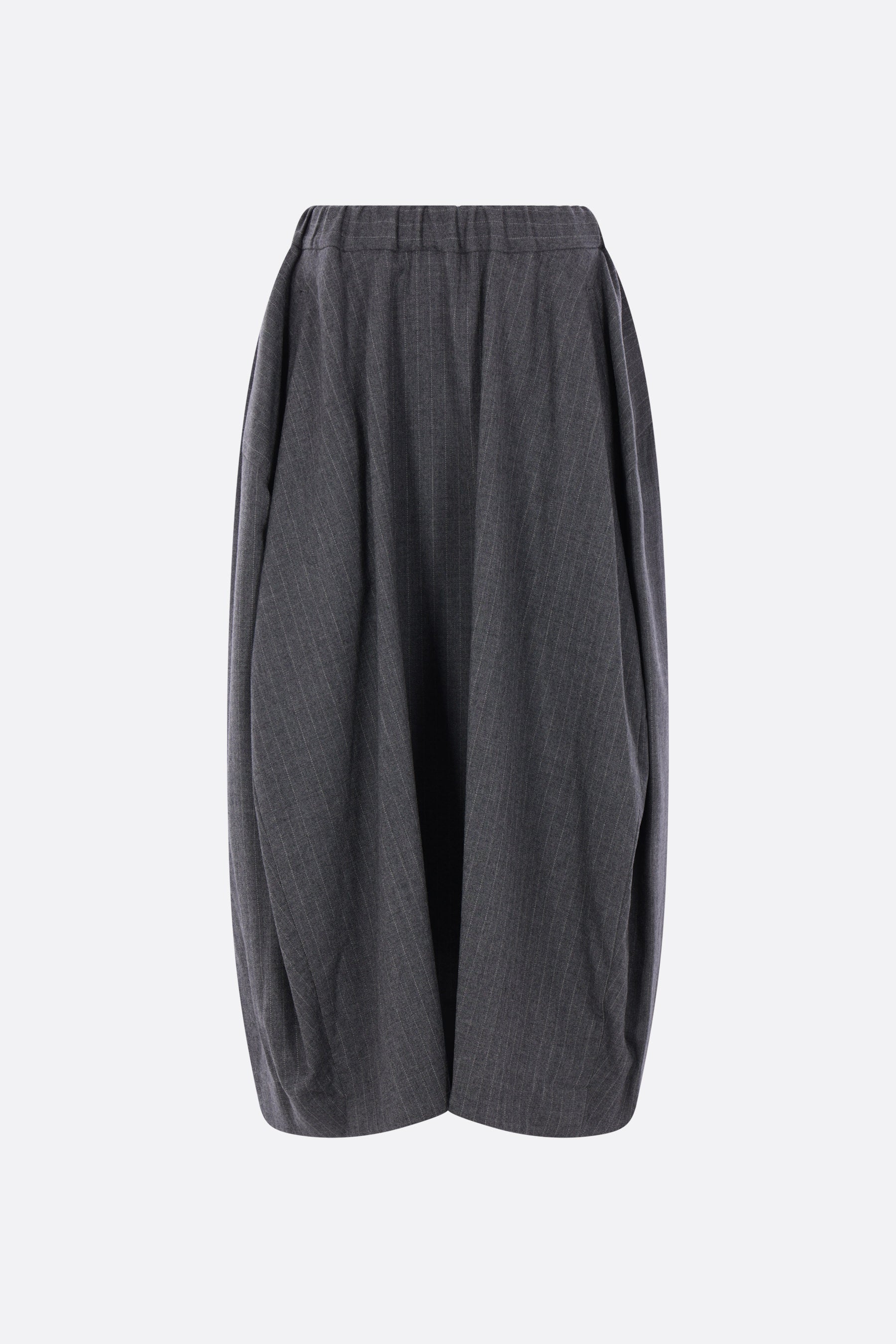 Comme des Garçons wide skirt crafted from grey pinstriped wool. Features an elasticized waistband with drawstring, welt pockets, and an unlined interior.