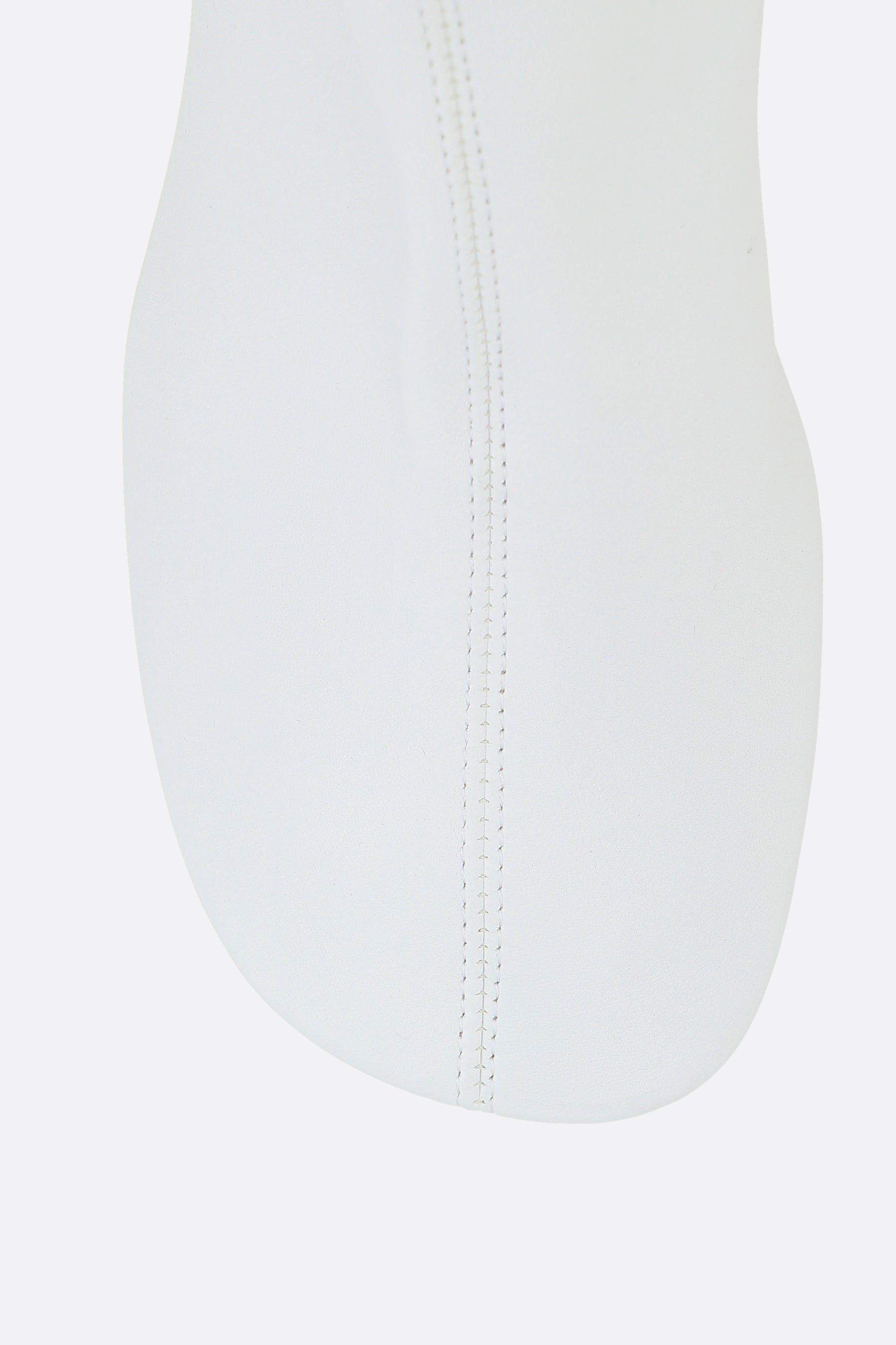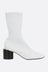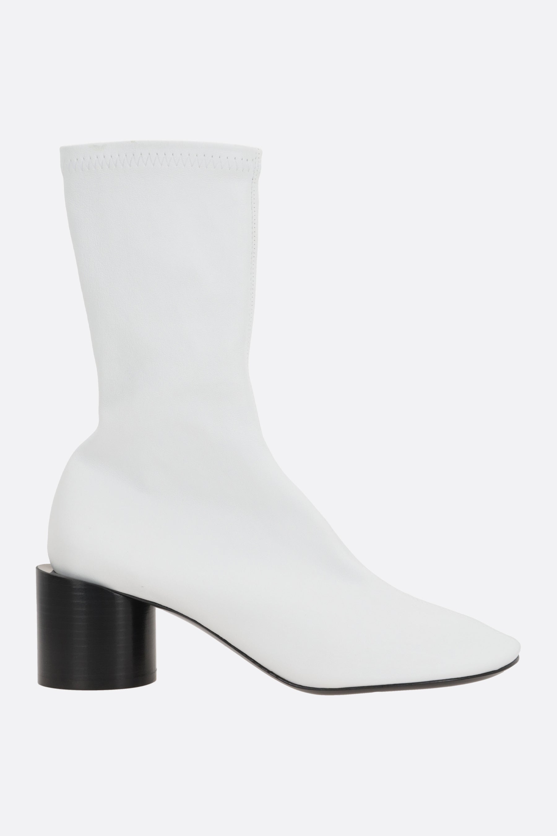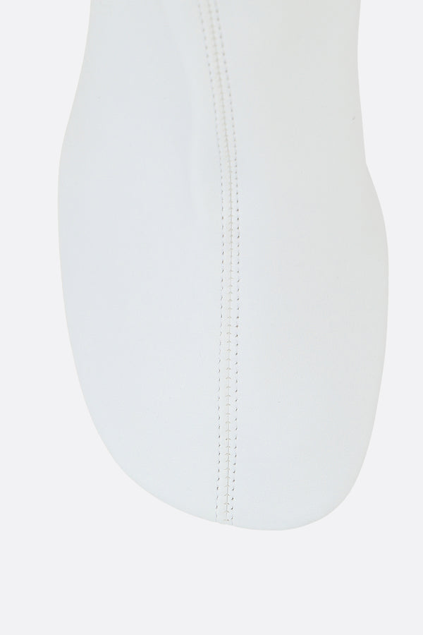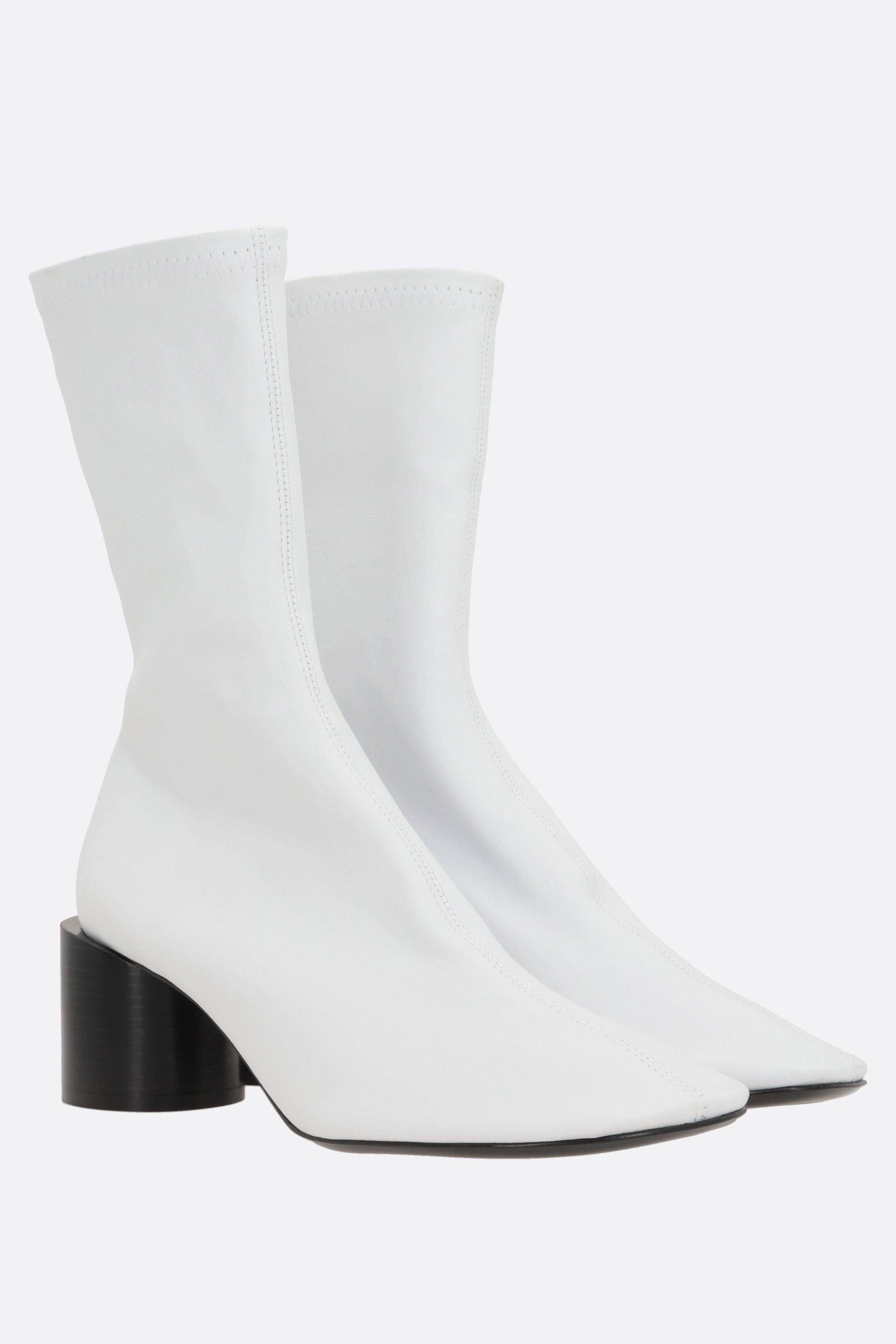 Jil Sander ankle boots made of white stretch nappa leather. Features a round toe, leather/fabric lining, and a leather/rubber sole. The design is completed by a round wooden heel.