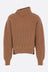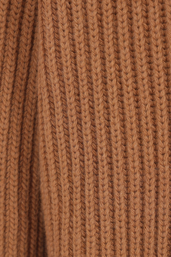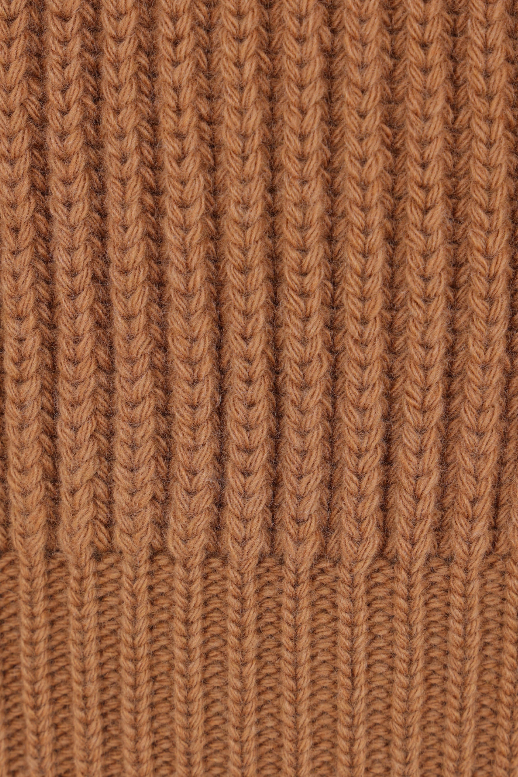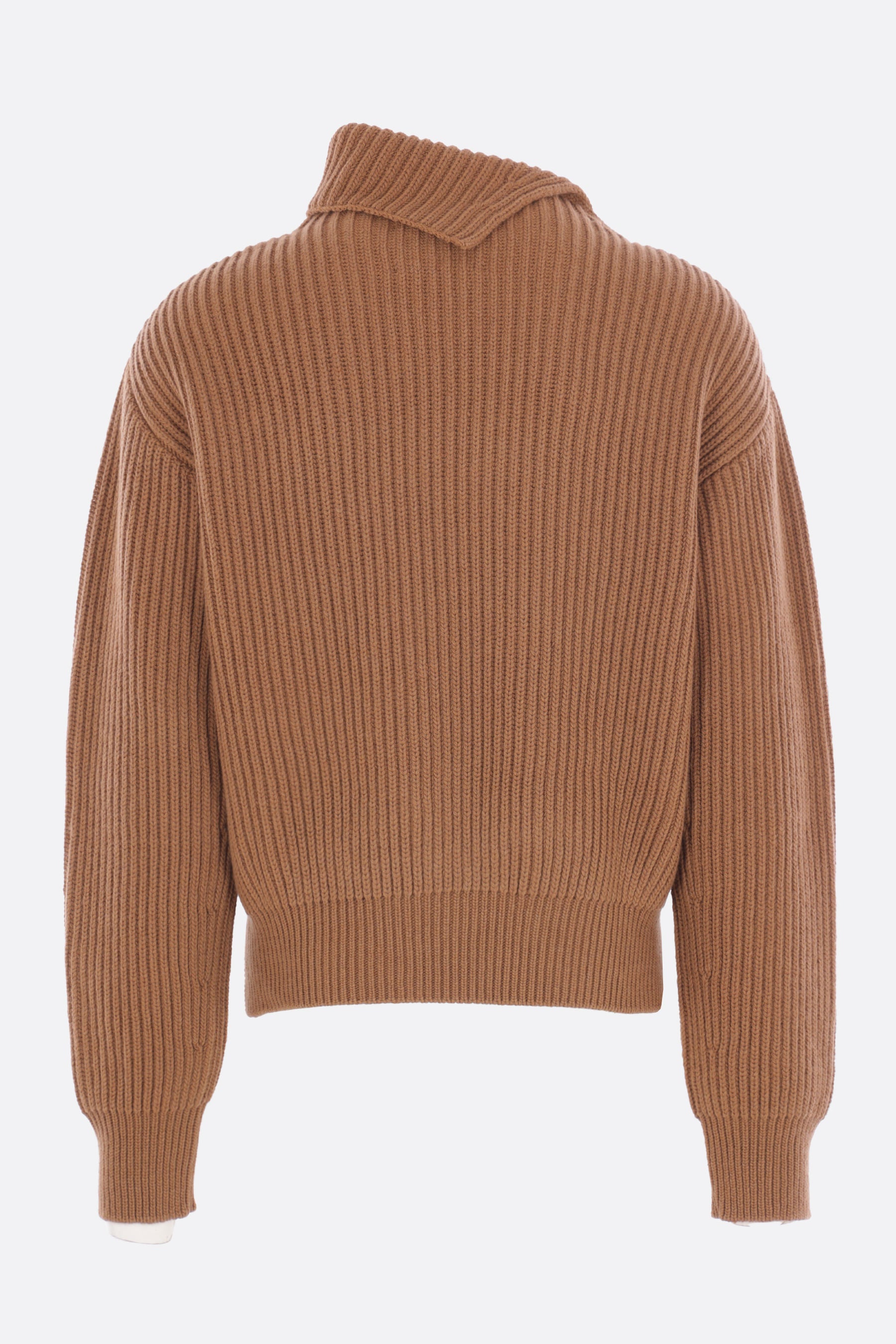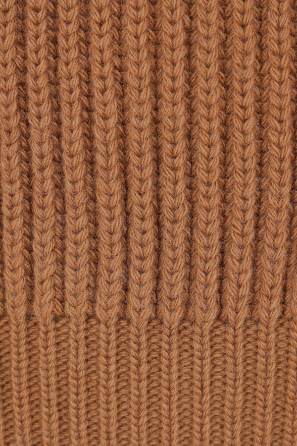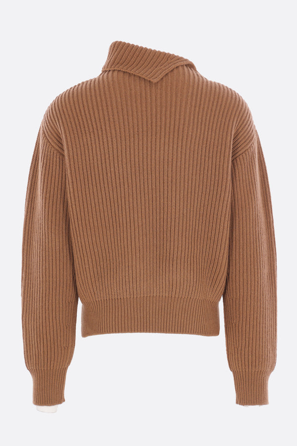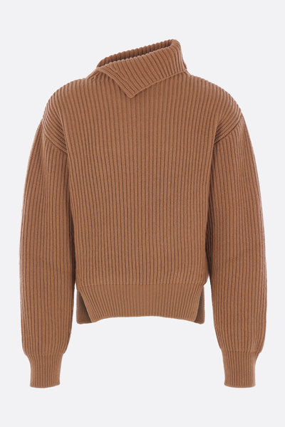 Jil Sander sweater crafted from light brown ribbed wool knit. Featuring an asymmetrical neck, long sleeves, and a straight hem with small side slits.