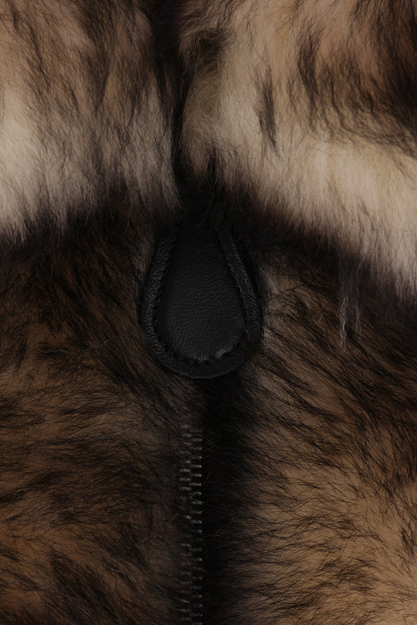 Jil Sander jacket crafted from brown-toned shearling. Featuring a pointed collar, two-way zip closure, concealed side pockets, long sleeves, and a straight hem with drawstring. Finished with a leather interior.
