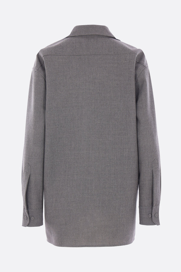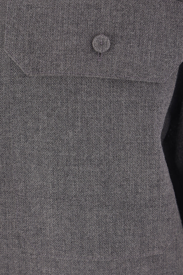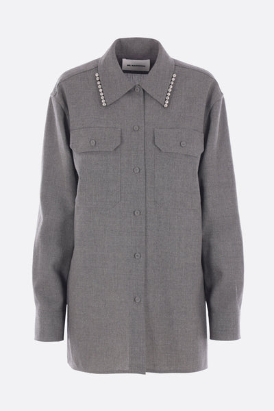 Jil Sander shirt made of gray wool. Featuring a classic collar with metal bead detailing along the edge, front button closure, flap chest pockets, long sleeves with buttoned cuffs, and a straight hem.