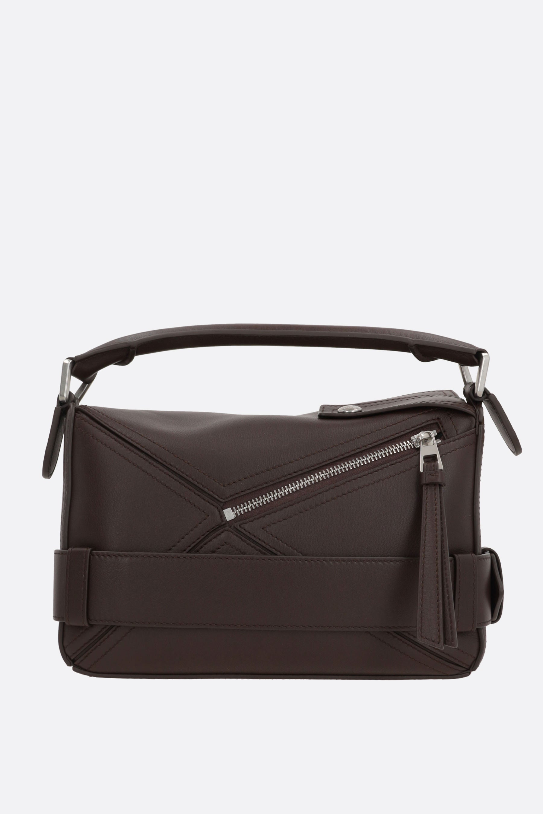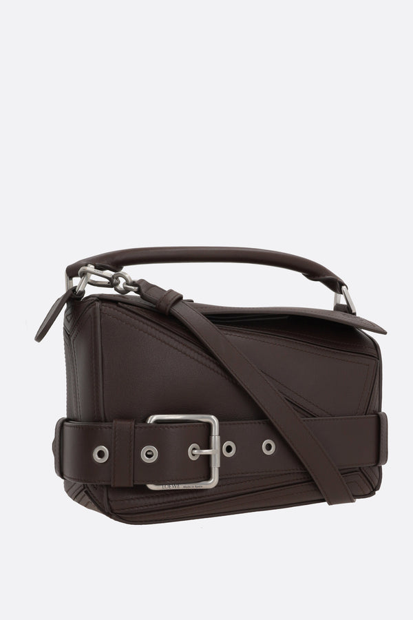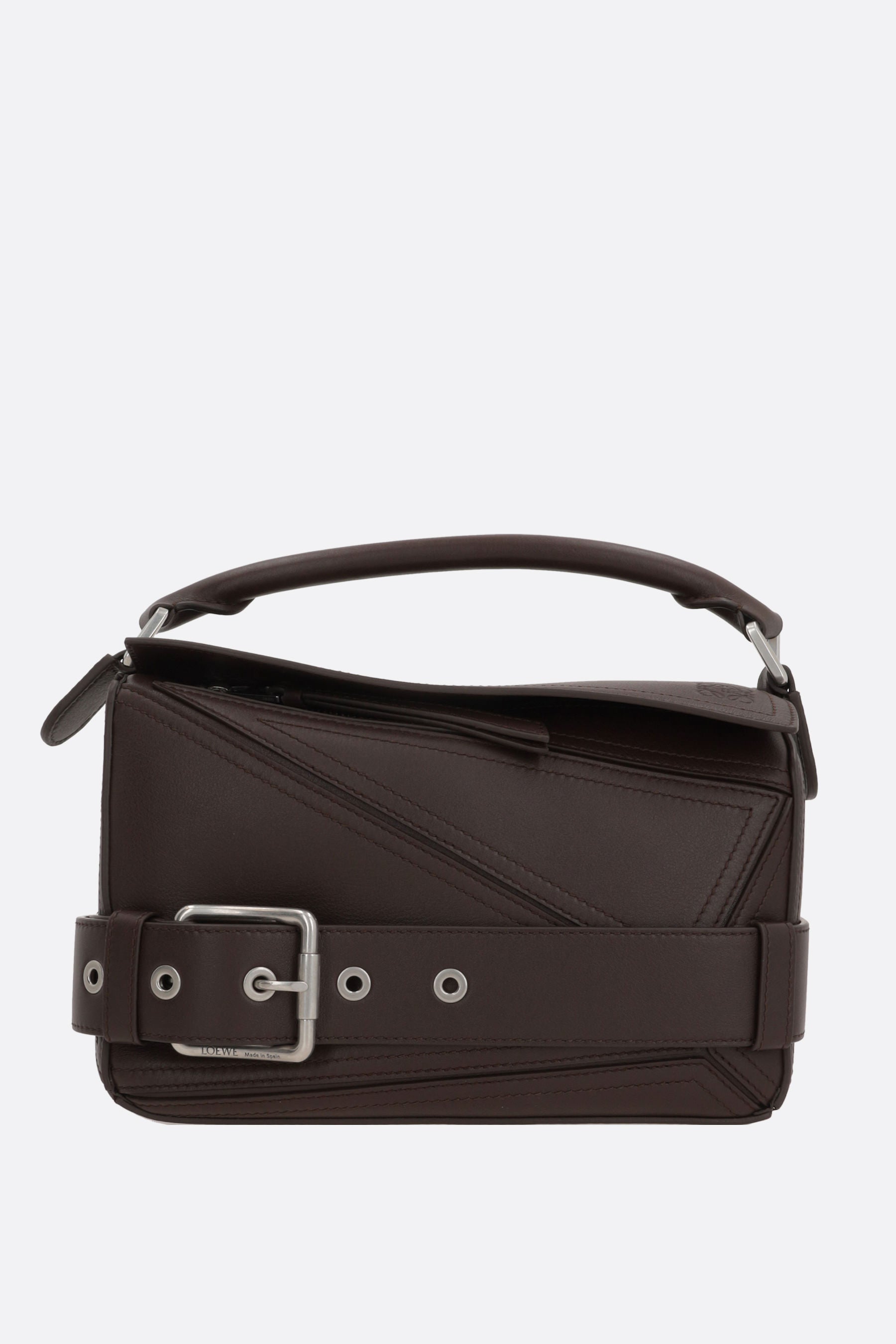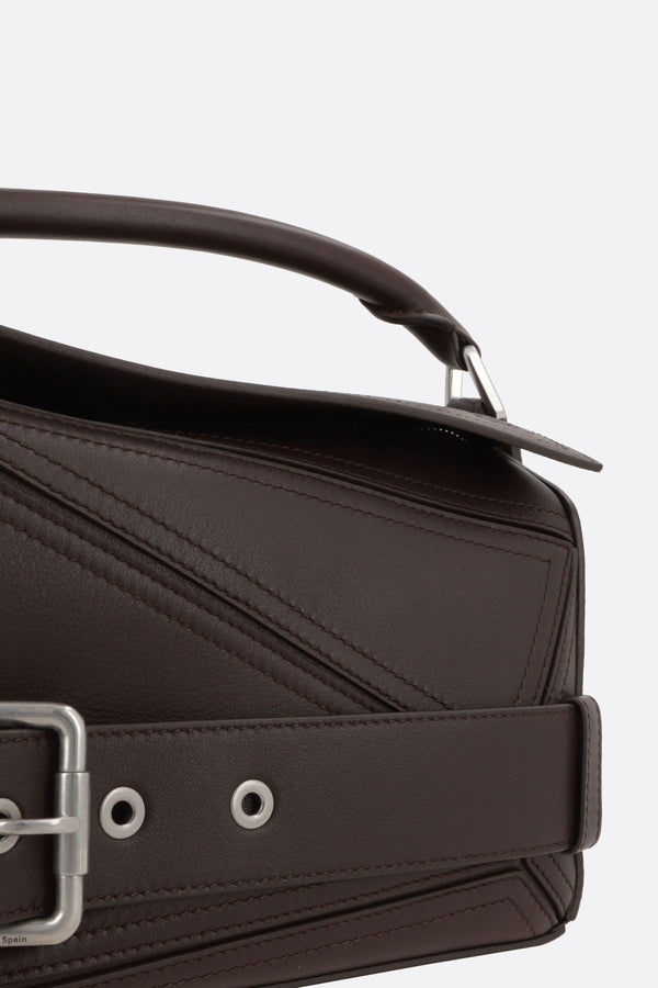 Loewe handbag crafted from shiny brown leather with biker-inspired details. Featuring silver-tone hardware, concealed zip closure, top handle, and a removable strap. The interior, lined in black canvas, includes a flat pocket. The design is finished with the signature embossed Anagram logo on the flap and a back zip pocket.
