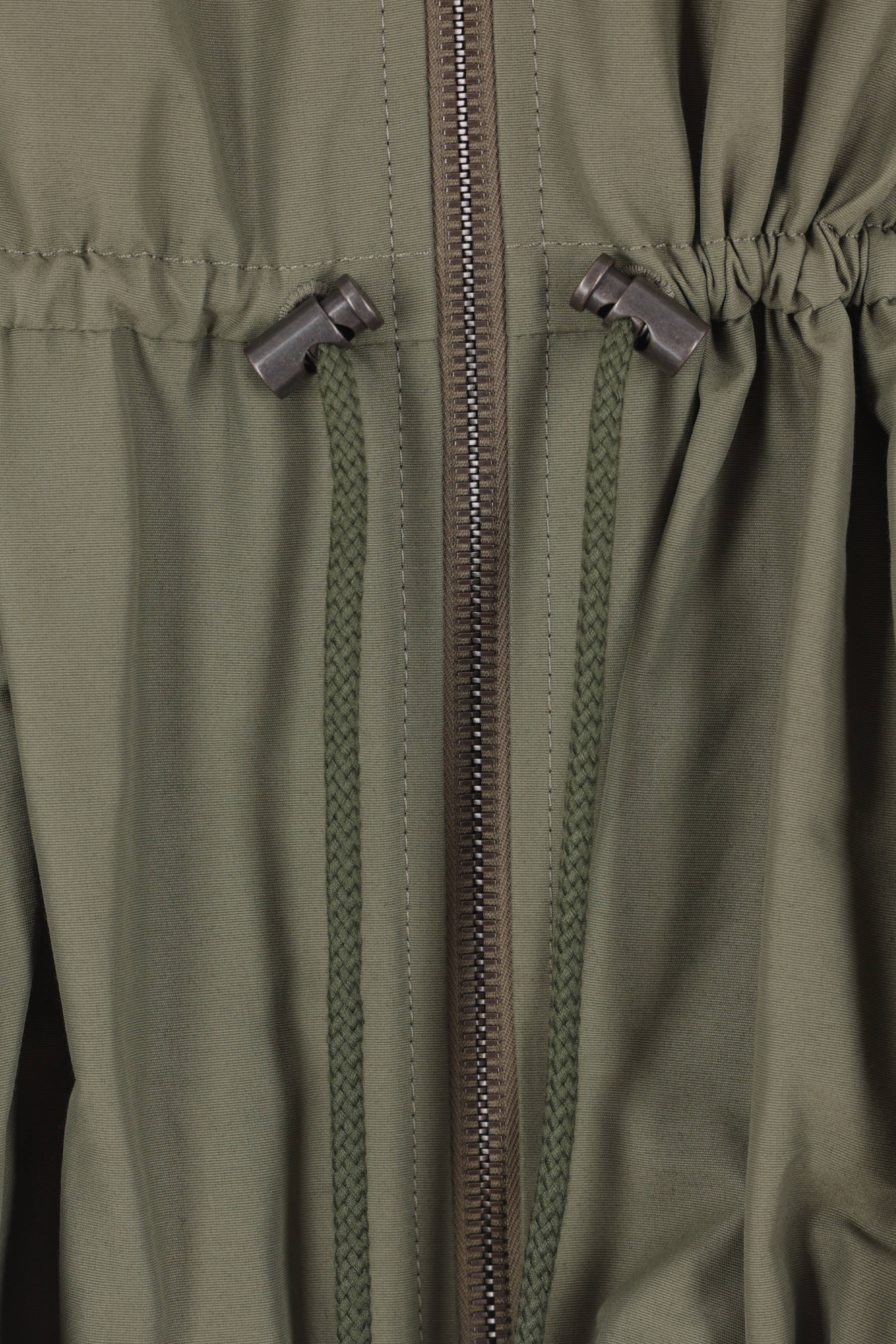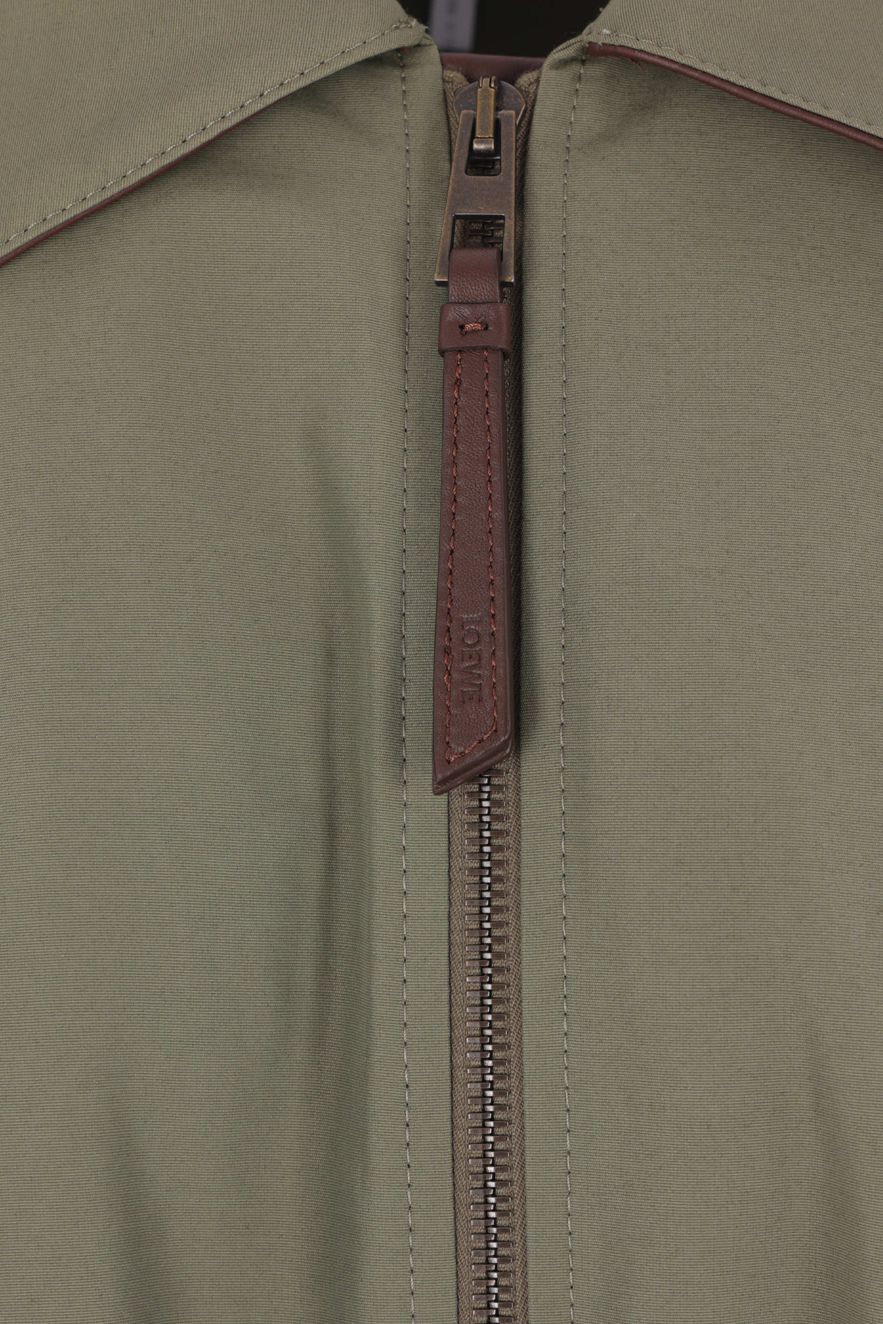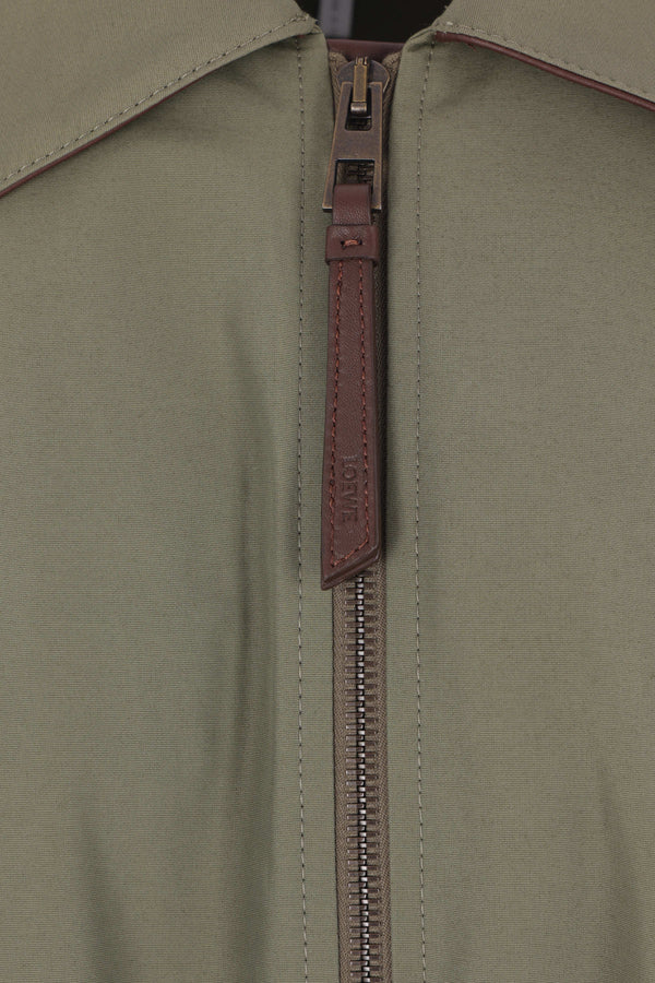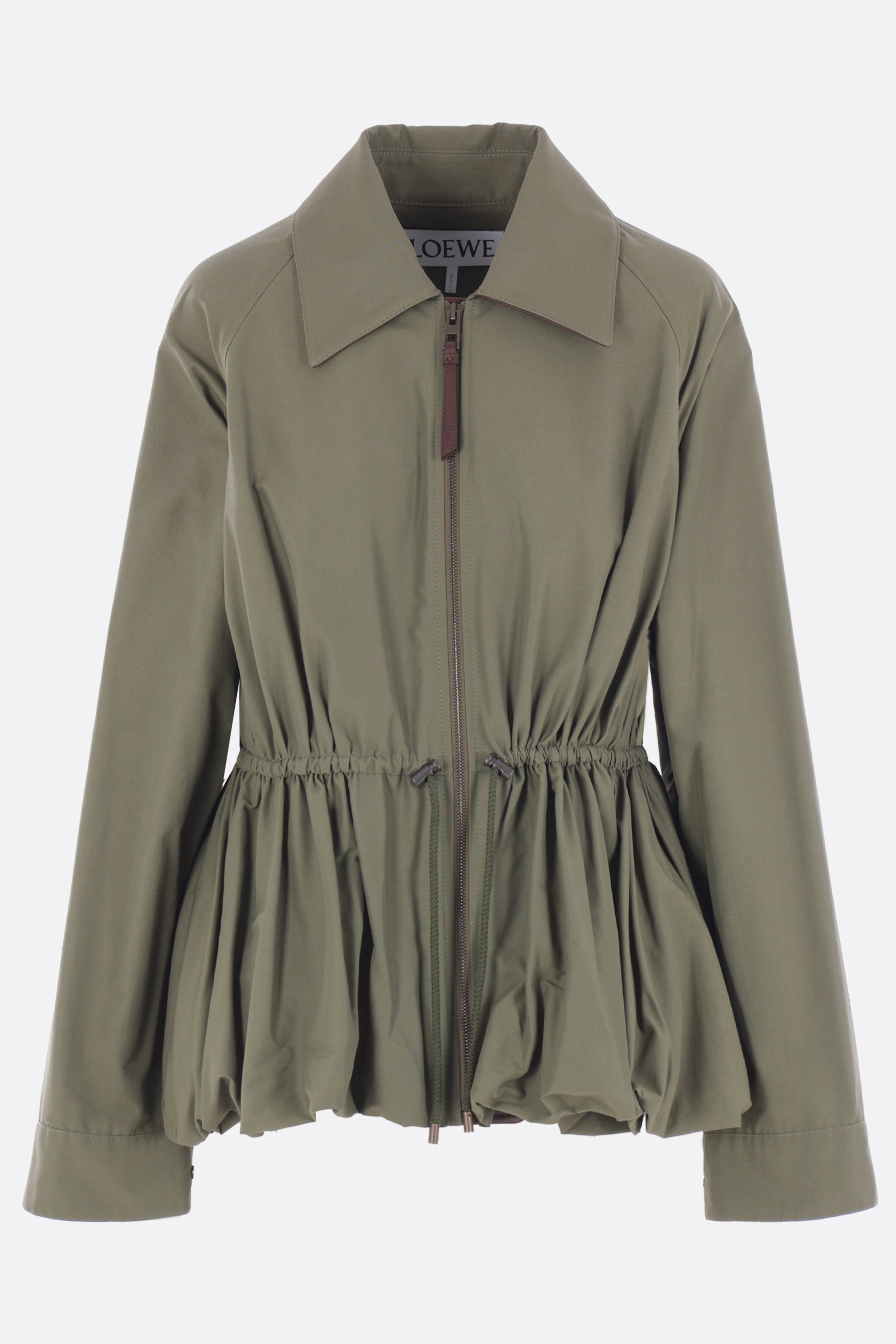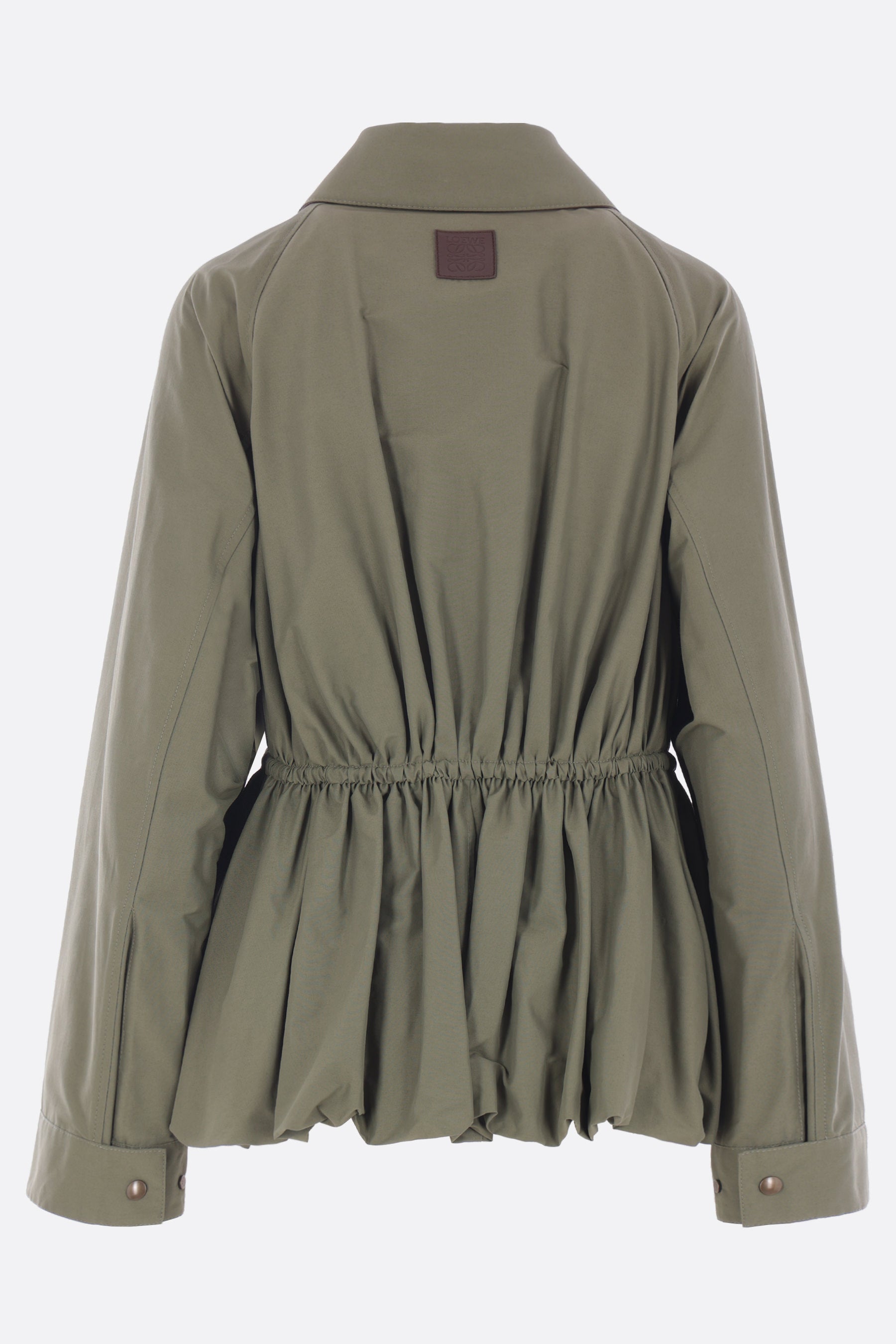 Loewe jacket crafted from khaki green Ottoman cotton blend. Featuring a pointed collar, front zip closure, drawstring waist, long sleeves with buttoned cuffs, invisible side pockets, and a puffed hem. Lined interior. The design is completed by the leather Anagram patch applied on the back.