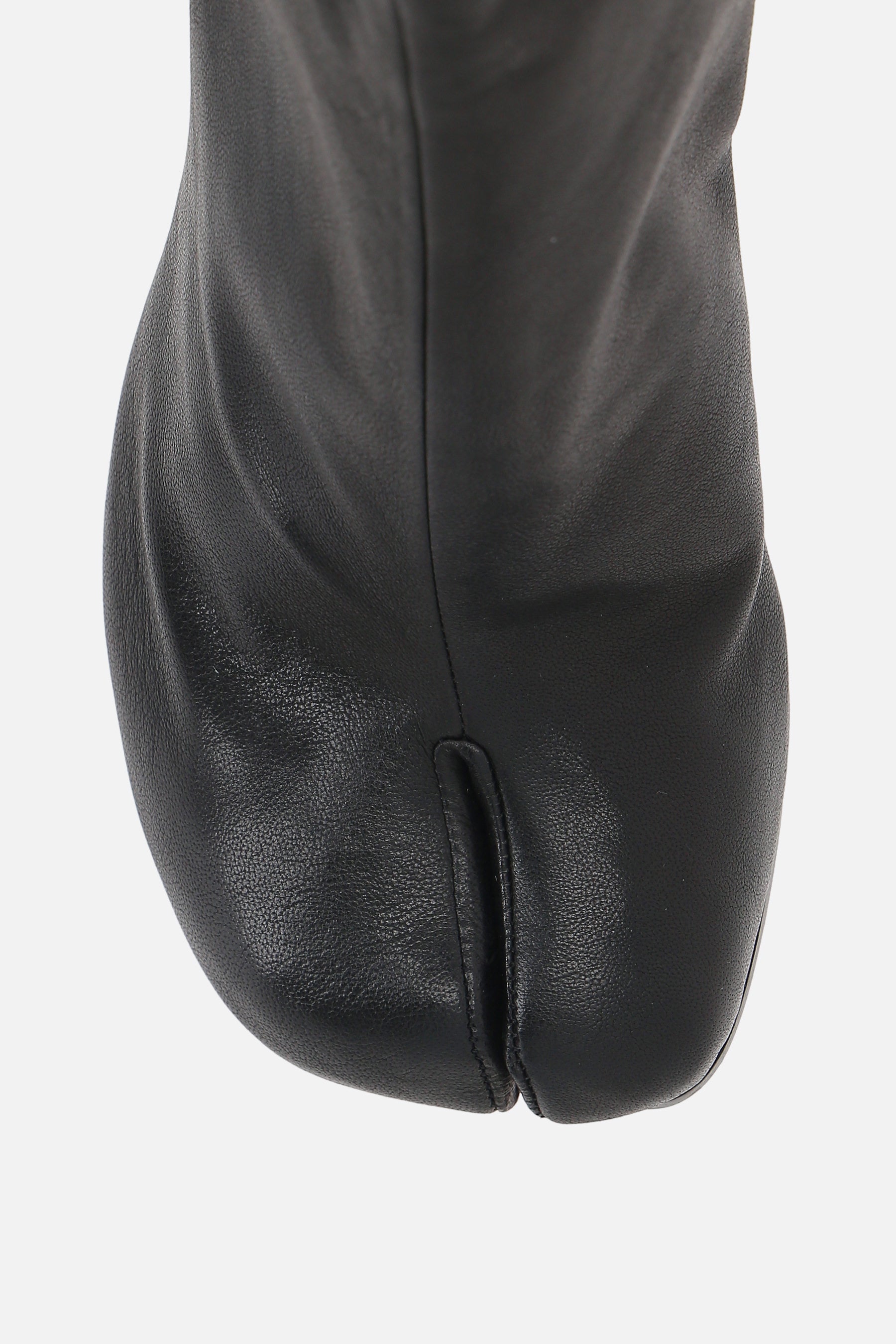 Maison Margiela ankle boots made of black nappa leather. Featuring side hook closures, a split-toe design, leather linings, and a leather sole. The design is completed with a rounded wooden heel and a straight white stitch on the back.