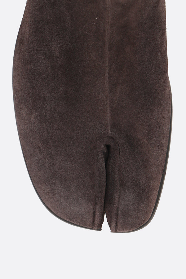 Maison Margiela slip-on shoes crafted from brown suede. Featuring a signature Tabi split toe, leather lining, and leather sole. The design is completed with the Maison's straight white stitch detail on the back.