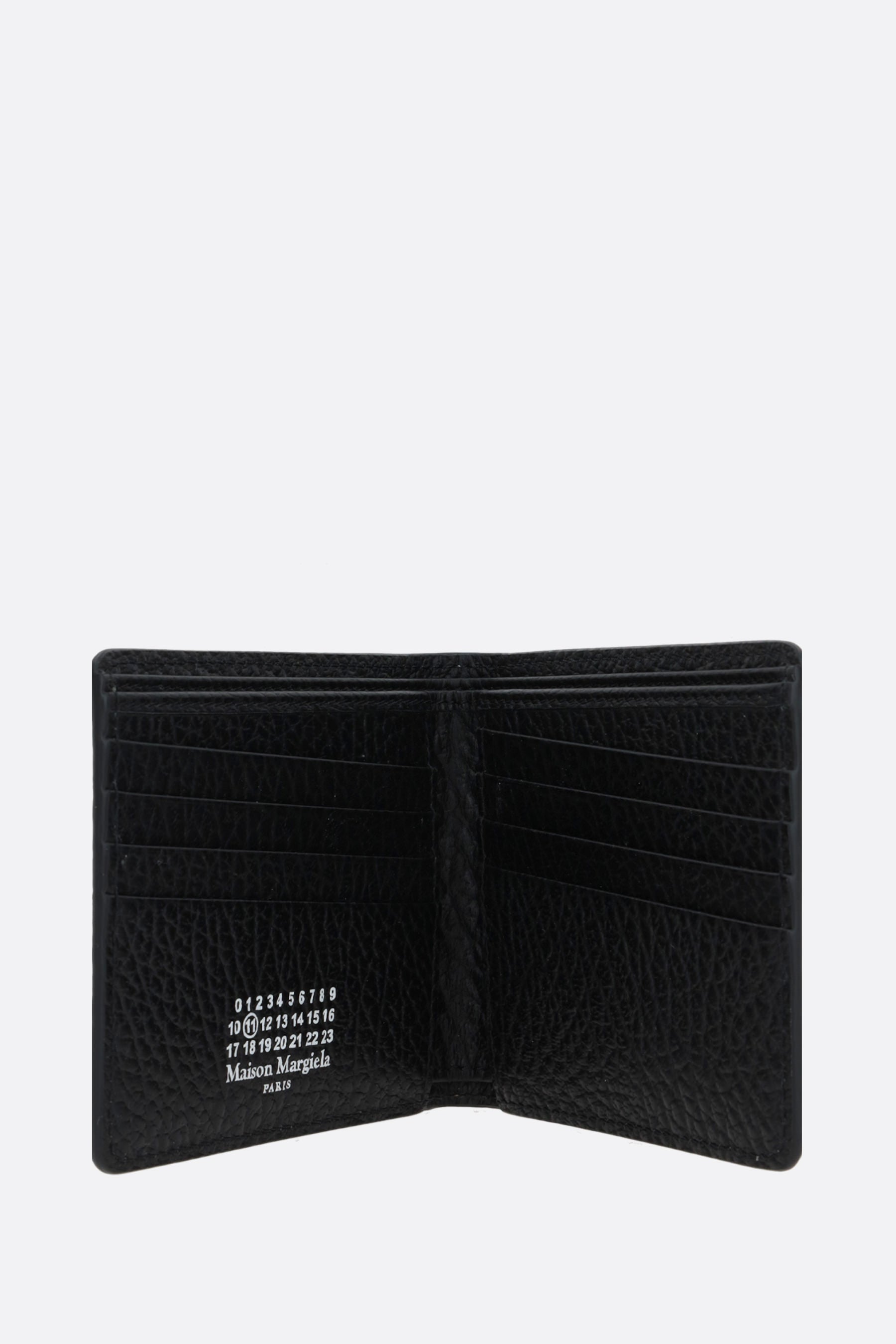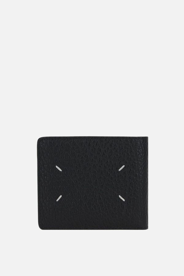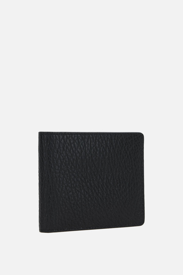 Maison Margiela billfold wallet crafted in black grained leather. Fabric / leather-lined interior with two bill compartments, two slip pockets and eight card slots. The design is completed by the Maison's contrast white stitch moniker at back.