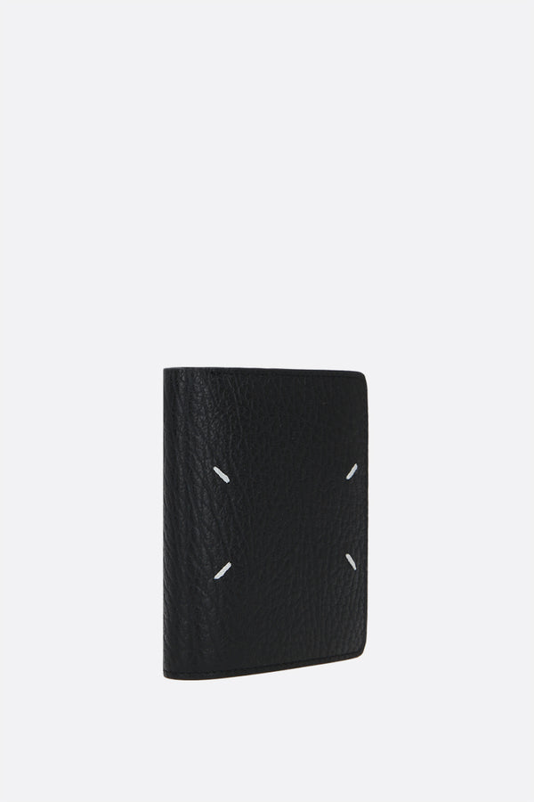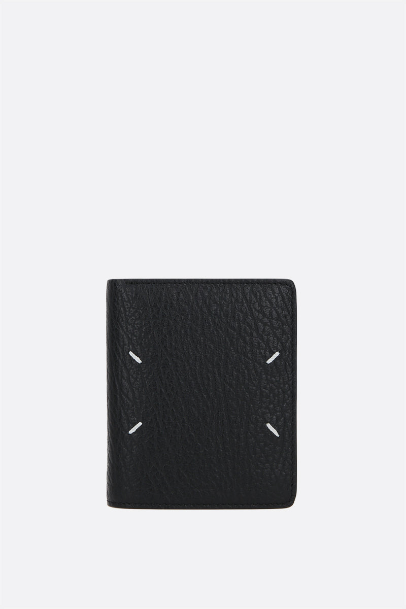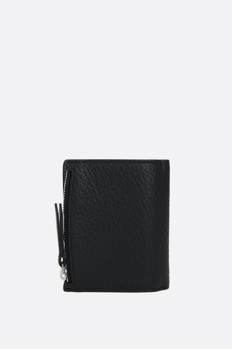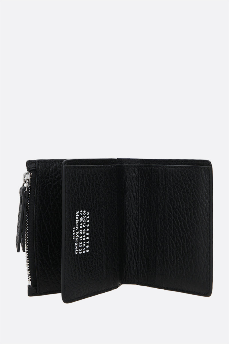 Maison Margiela compact wallet crafted in black grainy leather. Fabric / leather-lined interior with bill compartment, zipped coin pocket, two slip pockets and six card slots. The design is completed by the Maison's contrast white stitch moniker at back.