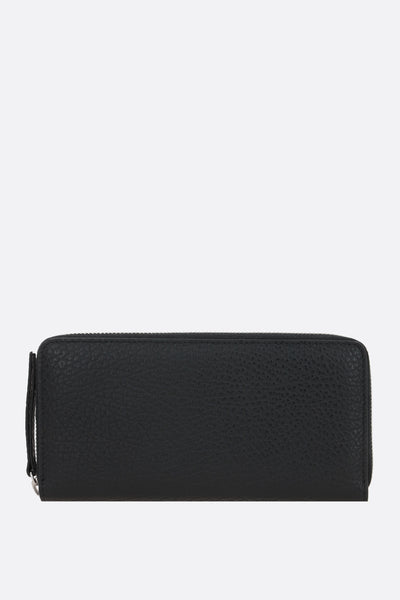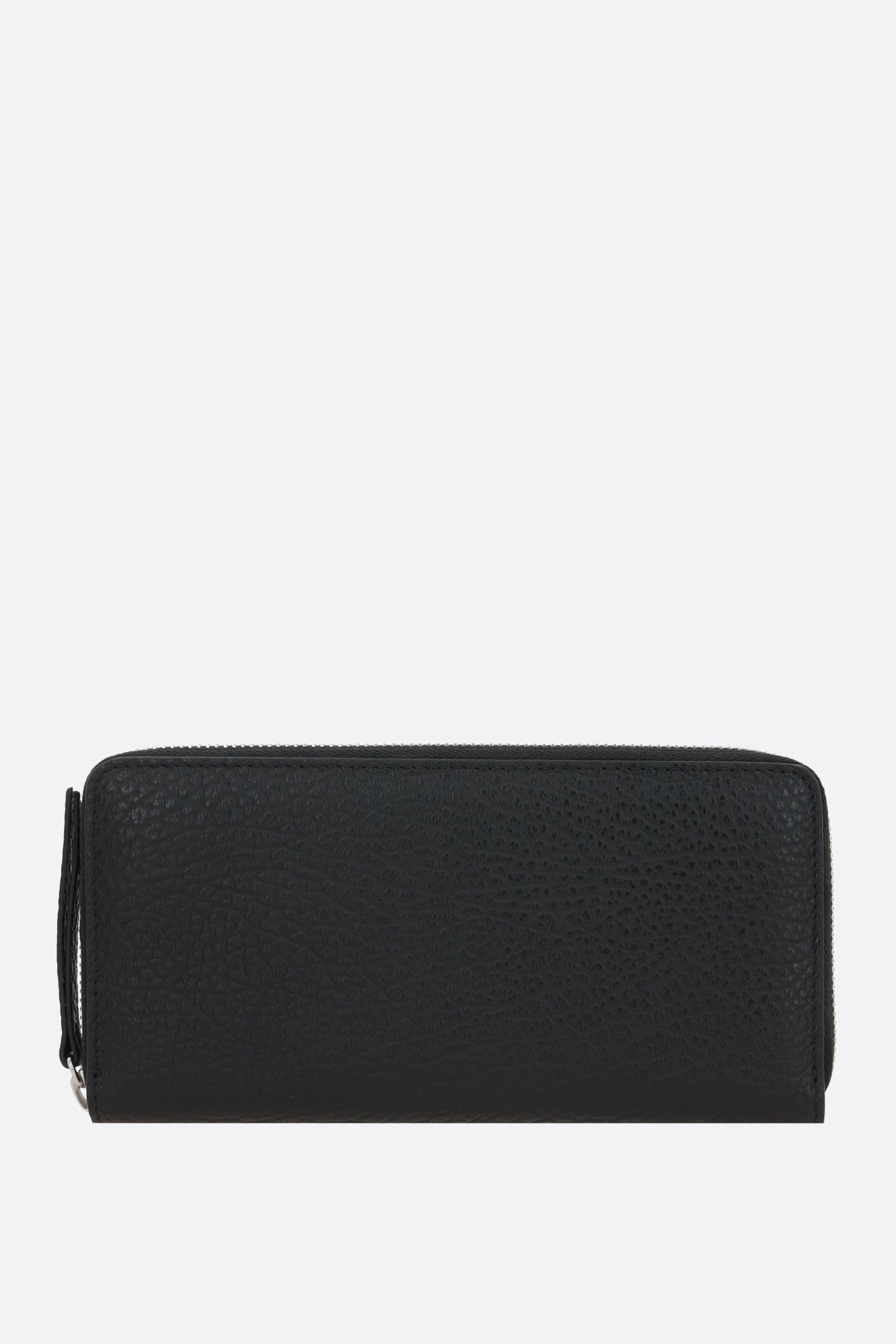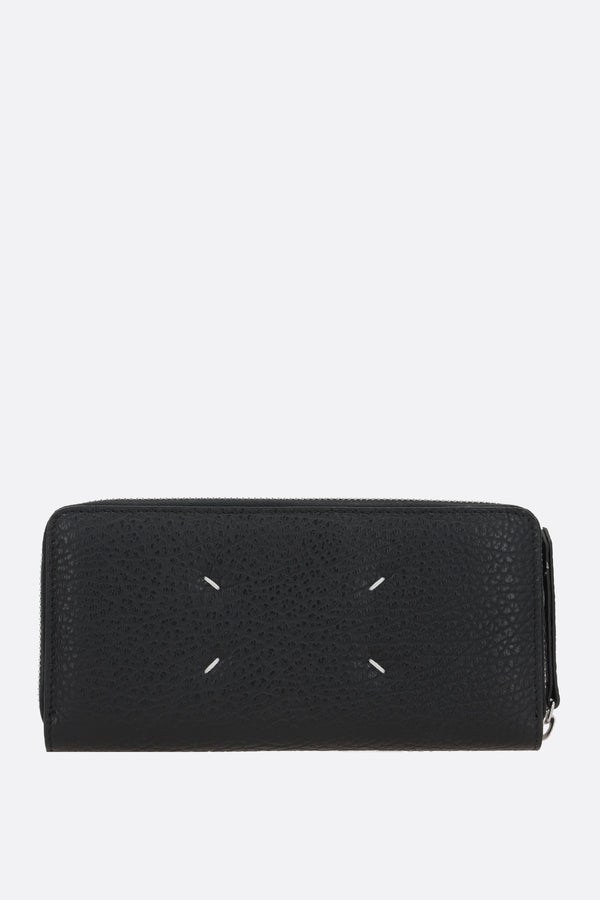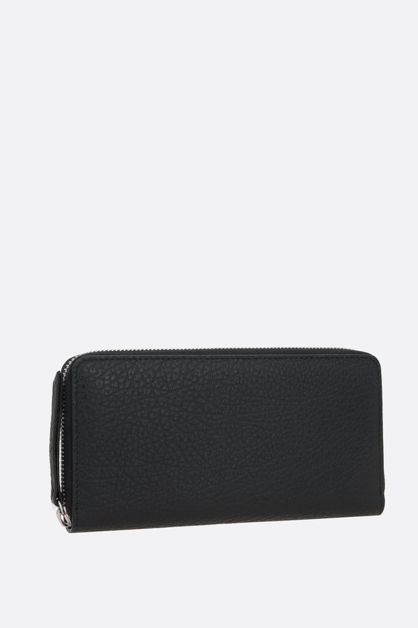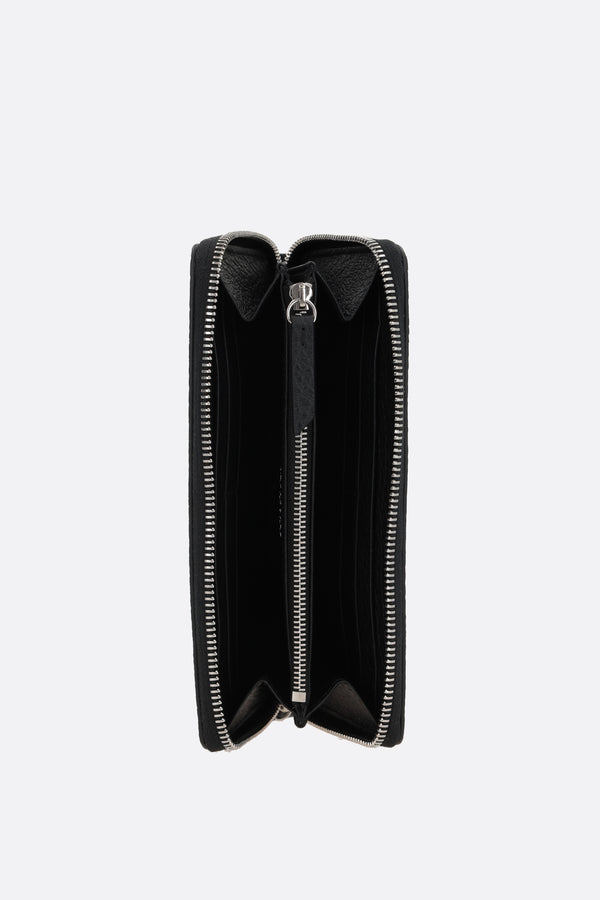 Maison Margiela wallet crafted in black grained leather. It features silver-tone hardware and zip-around closure. Leather / fabric-lined interior with two compartments separated by zip coin pocket, two flat pockets and eight card slots. The design is completed by the Maison's contrast white stitch moniker at back.
