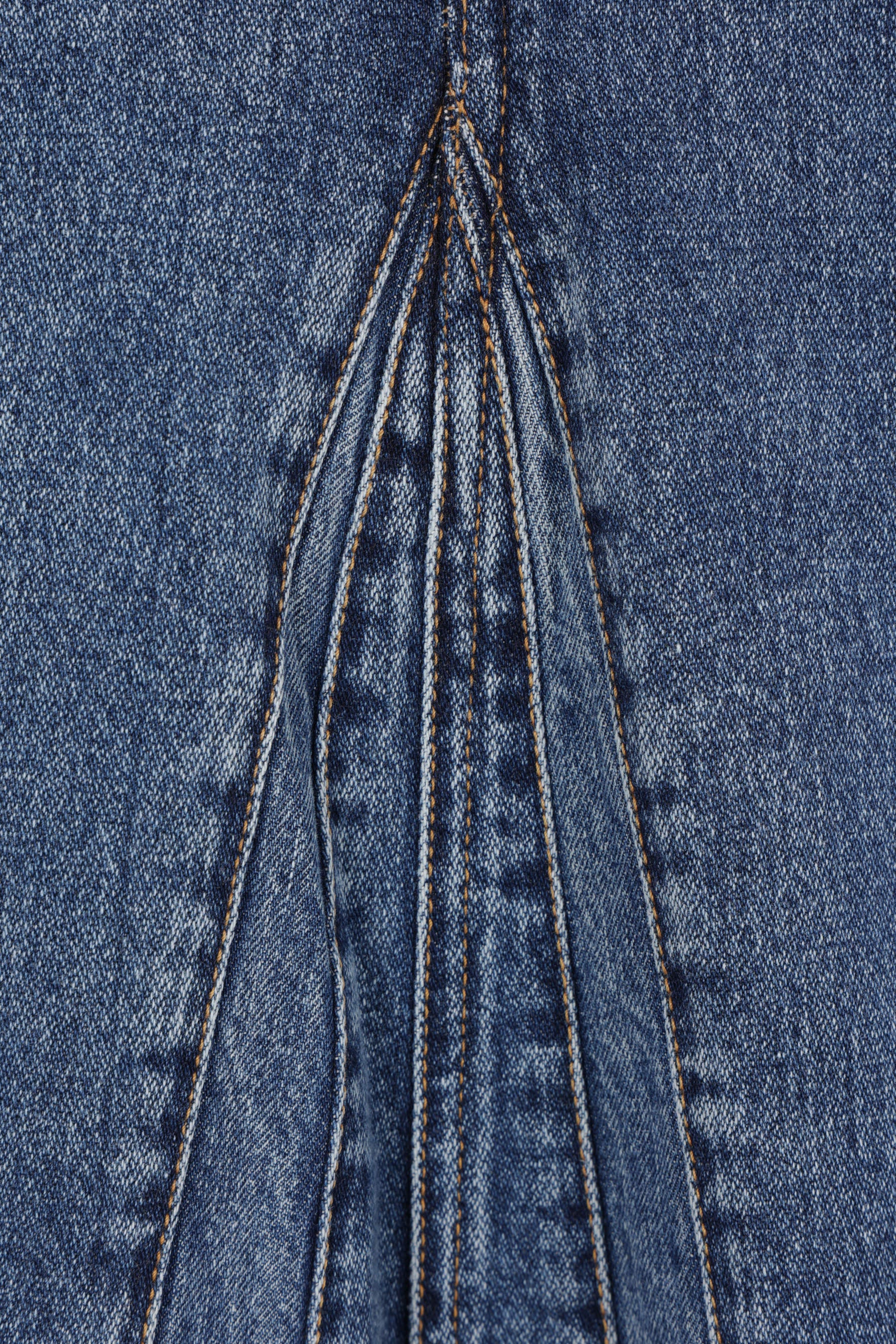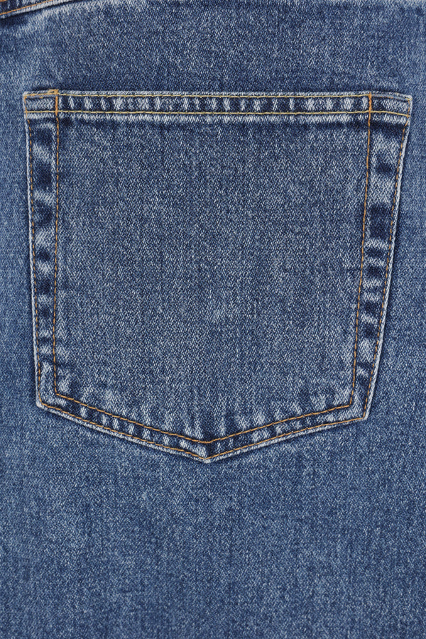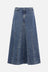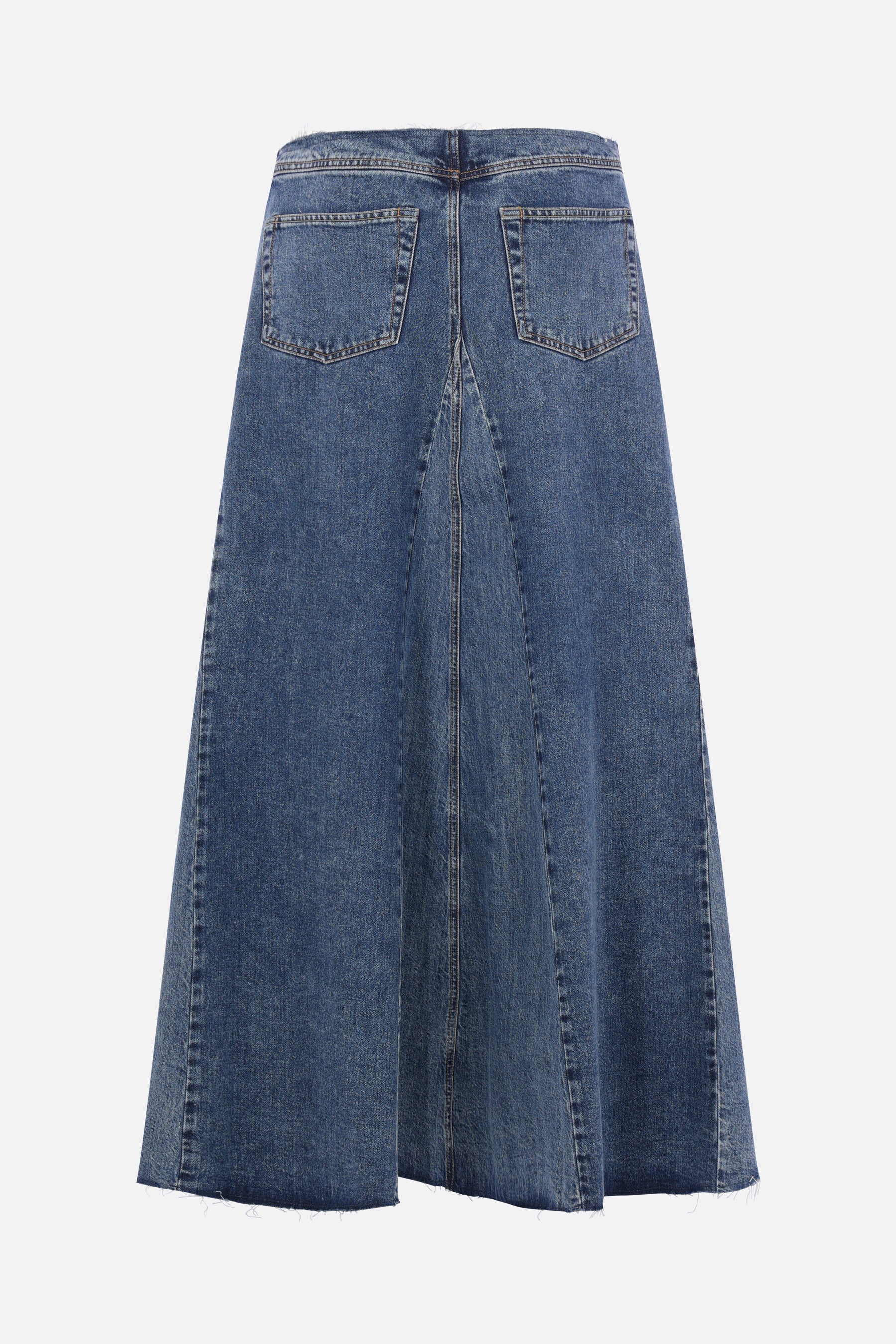 Our Legacy long skirt crafted from indigo blue cotton denim. Featuring a front hook/zip closure, five classic pockets, frayed edges, and a flared hem with panelled construction.
