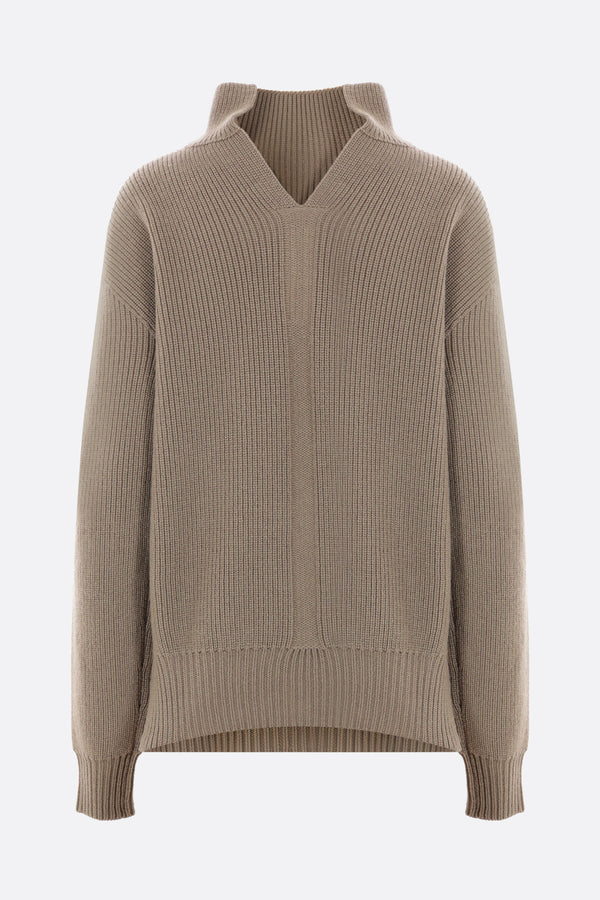 Rick Owens' pullover crafted in dust grey ribbed-knit wool. It features high neck with back V-neckline, long sleeves and straight hem with small side slits.