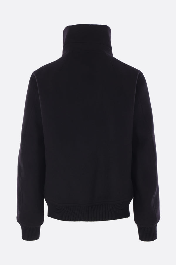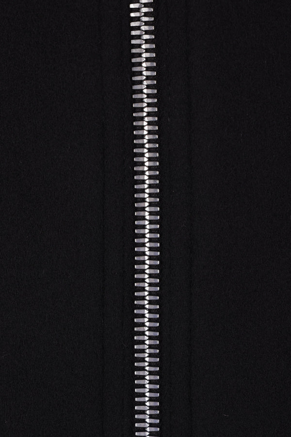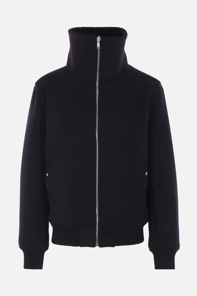 Rick Owens padded bomber made from black wool felt. Features an oversized collar, front zip closure, welt pockets, long sleeves, and ribbed knit trims.