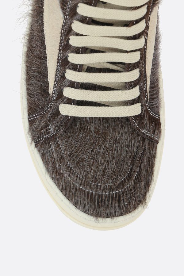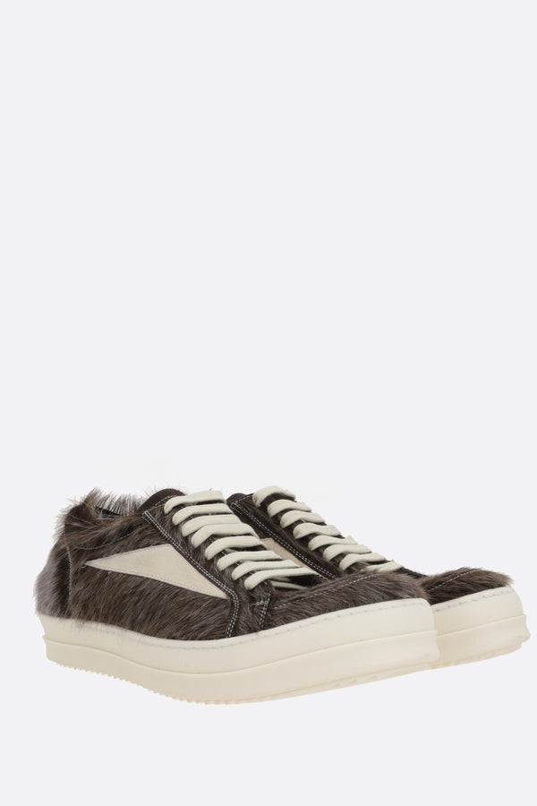 Rick Owens low-top sneakers made of brown pony hair with an ivory suede triangular patch. Featuring lace-up fastening, round toe, leather lining, and a shark-toothed bumper sole.