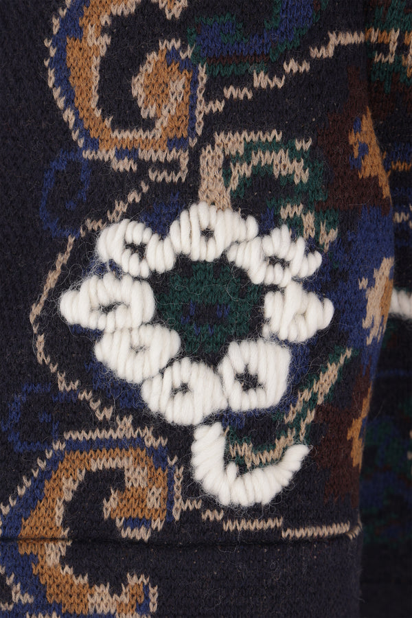 Sacai cardigan crafted from blue wool jacquard with a floral pattern. Features a high collar, asymmetric double-slider zip closure, long sleeves, ribbed edges, and an asymmetric hem.