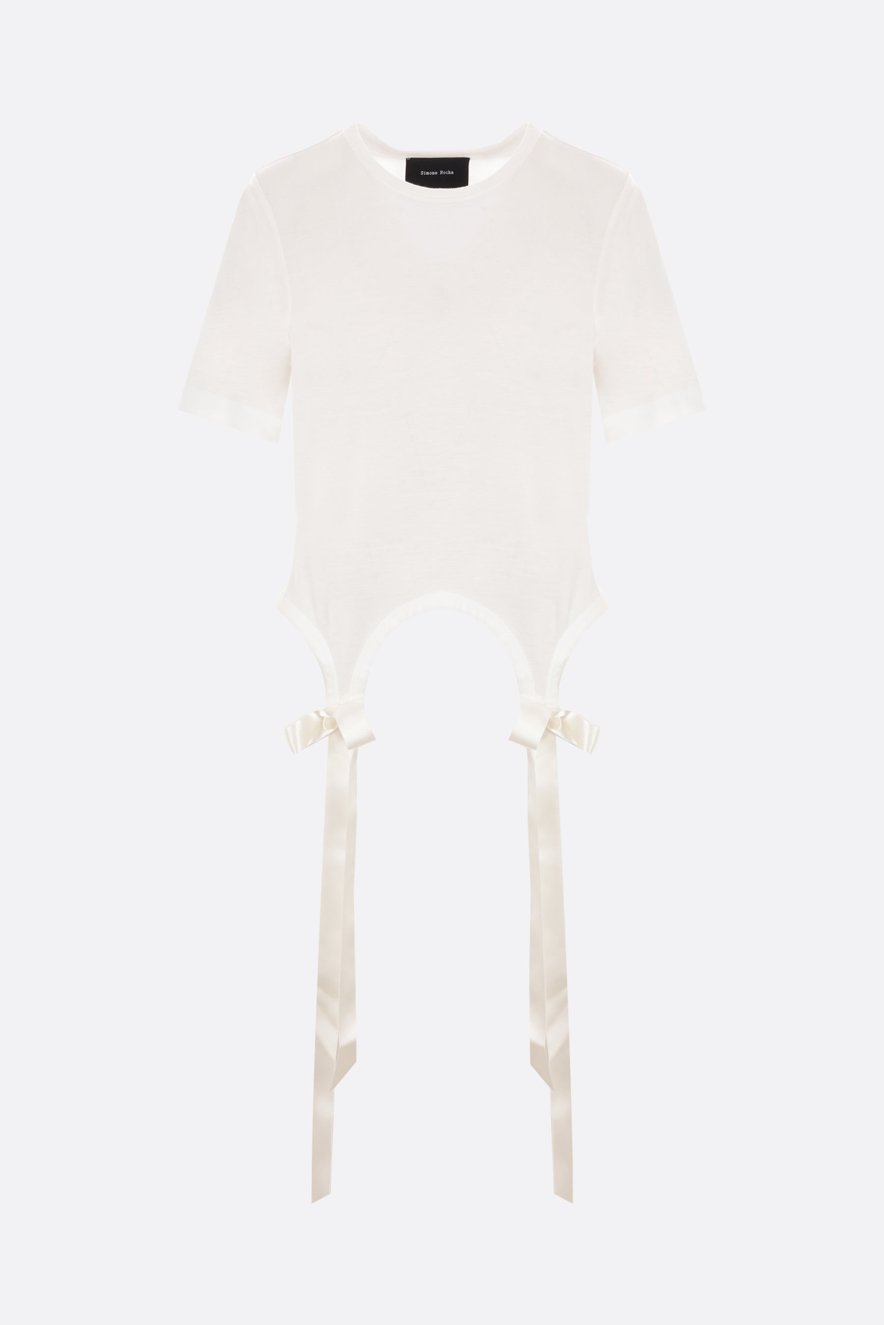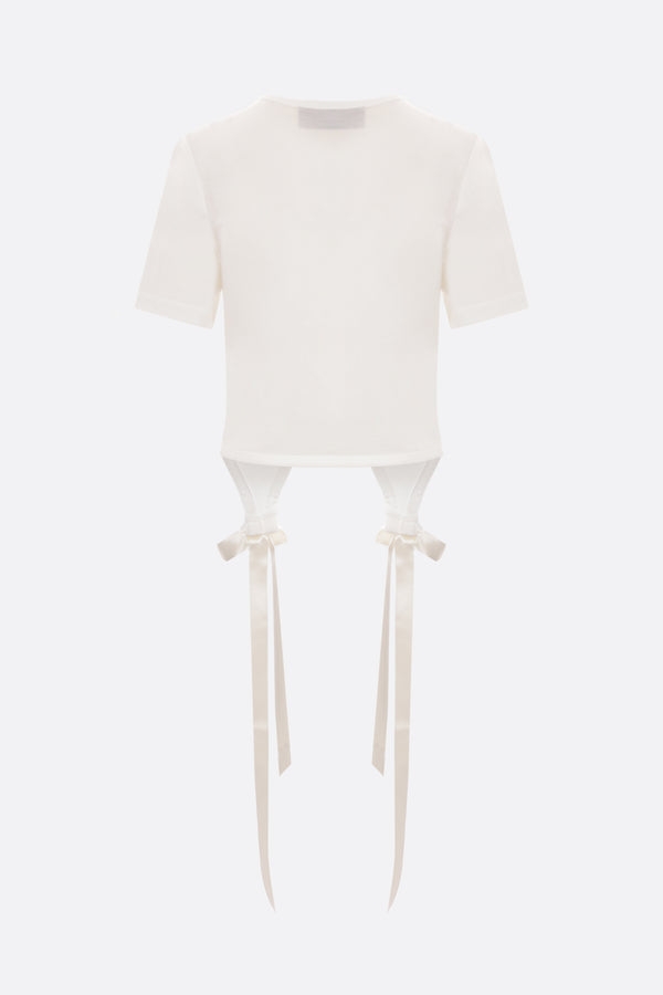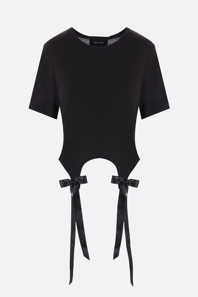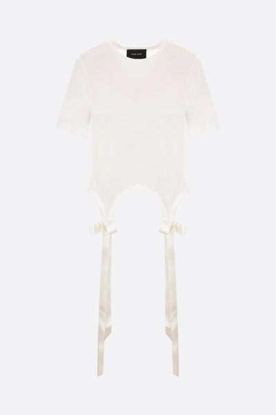 Simone Rocha cropped t-shirt made from ivory cotton jersey. It features a crew neckline, short sleeves, and an asymmetric hem with long satin bows.