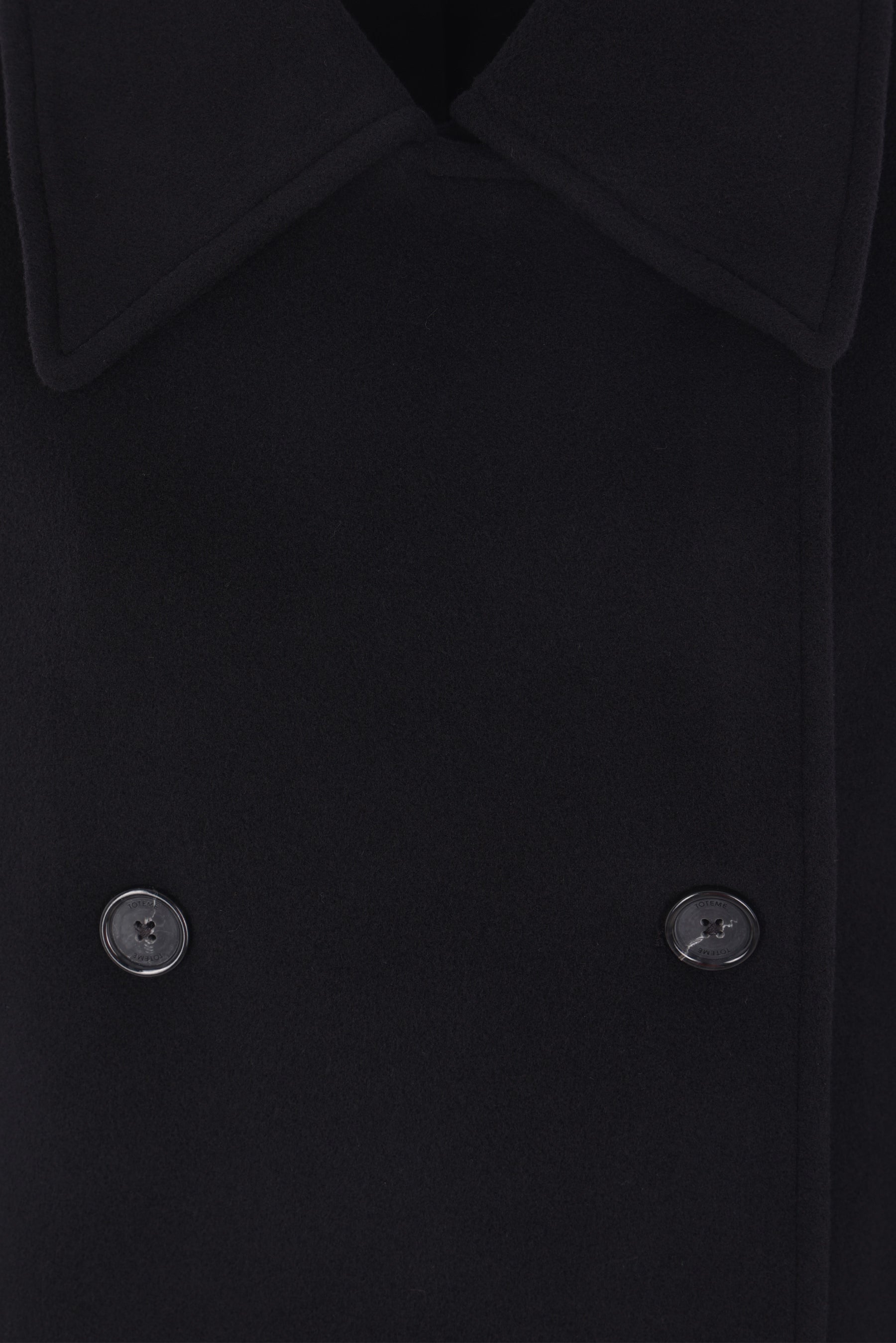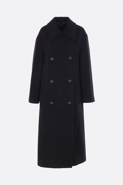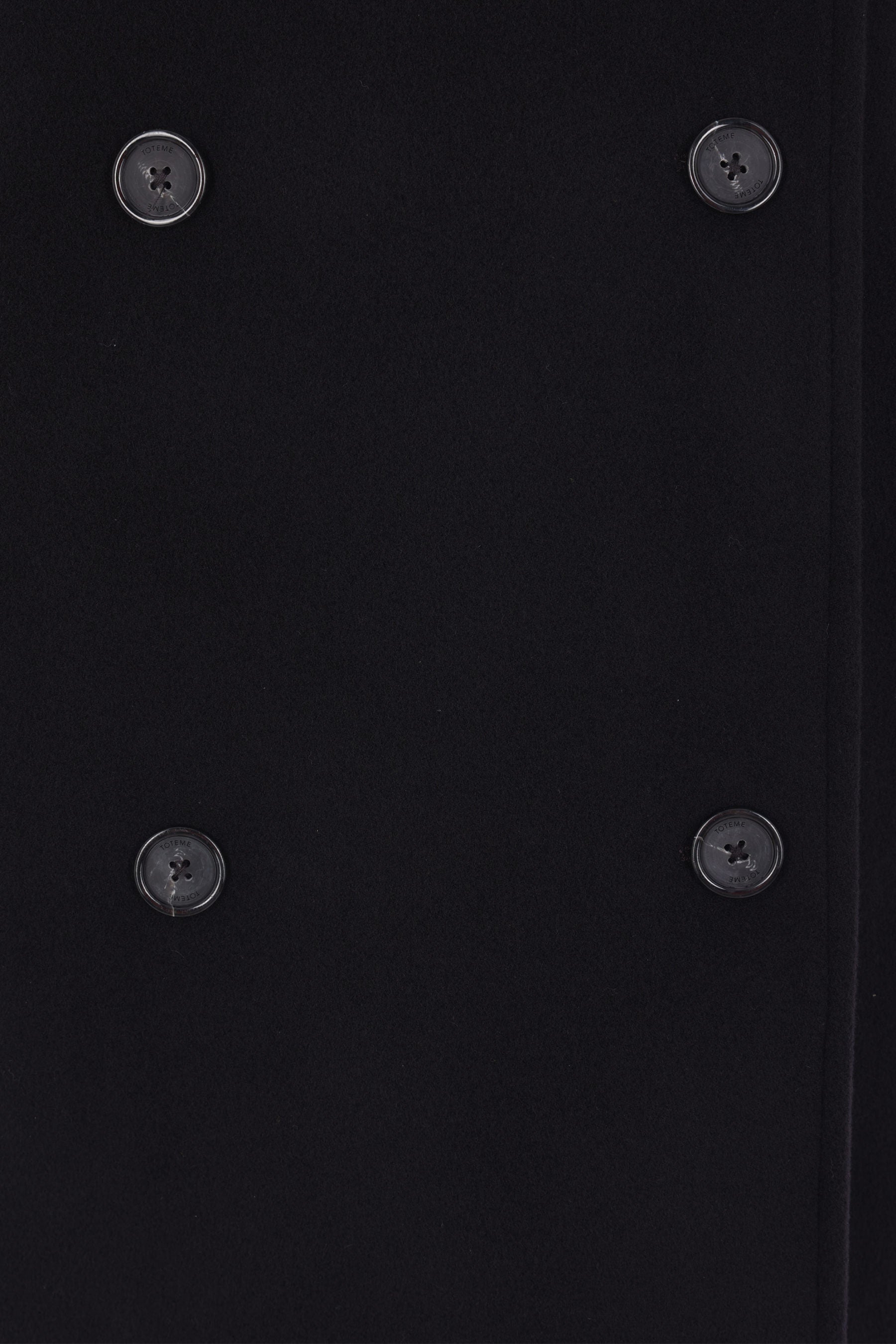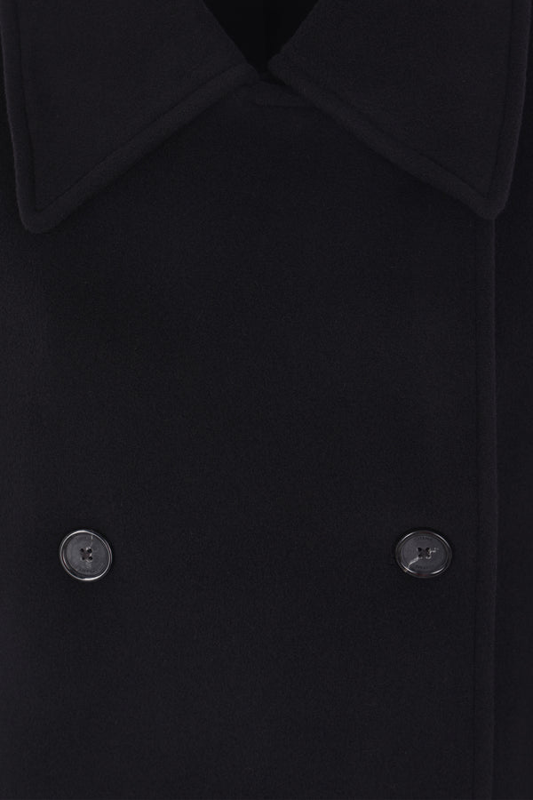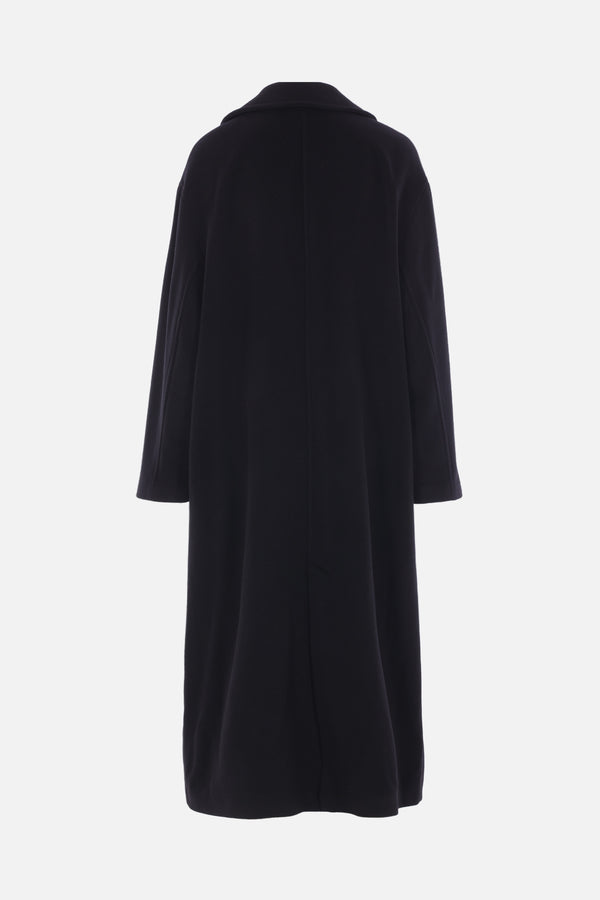 Toteme oversized coat made of black wool and cashmere blend. Featuring a pointed collar, front button closure, welt pockets, long sleeves, central vent, and a fully lined interior.