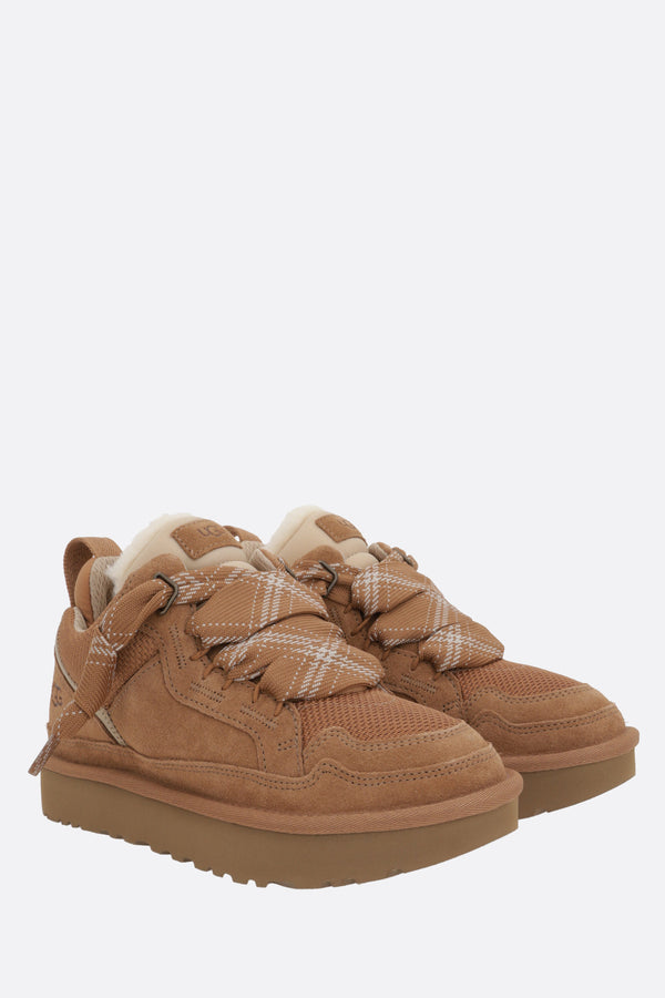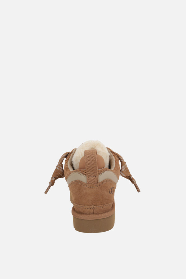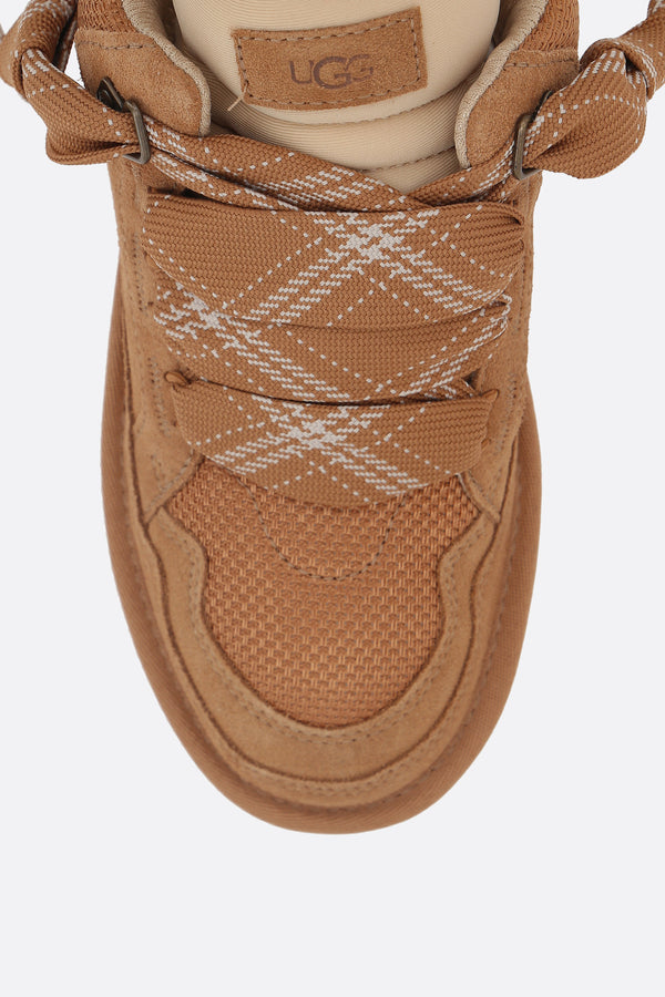Ugg low-top sneakers crafted from recycled woven canvas mesh and light brown suede. Featuring a round toe, lace-up closure, UGGplush™ lining made from repurposed wool and lyocell, and a sugarcane-derived EVA sole. The design is completed with the iconic embossed side logo and an oversized padded tongue with logo patch. Spare laces included.
