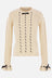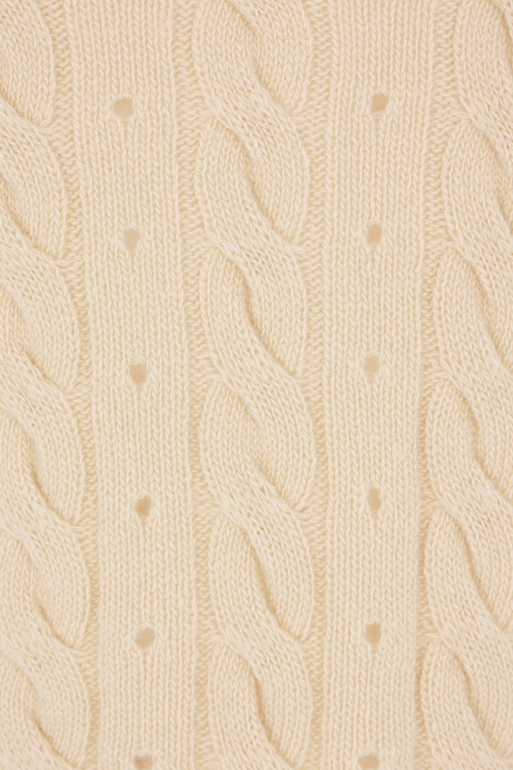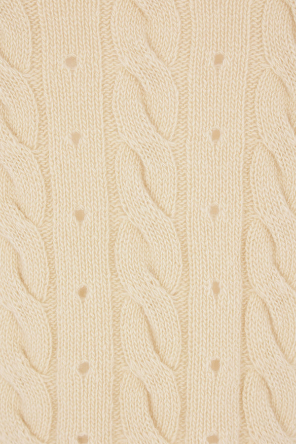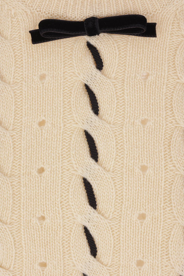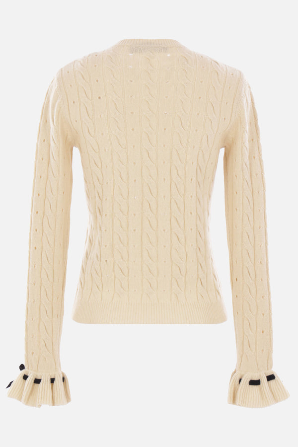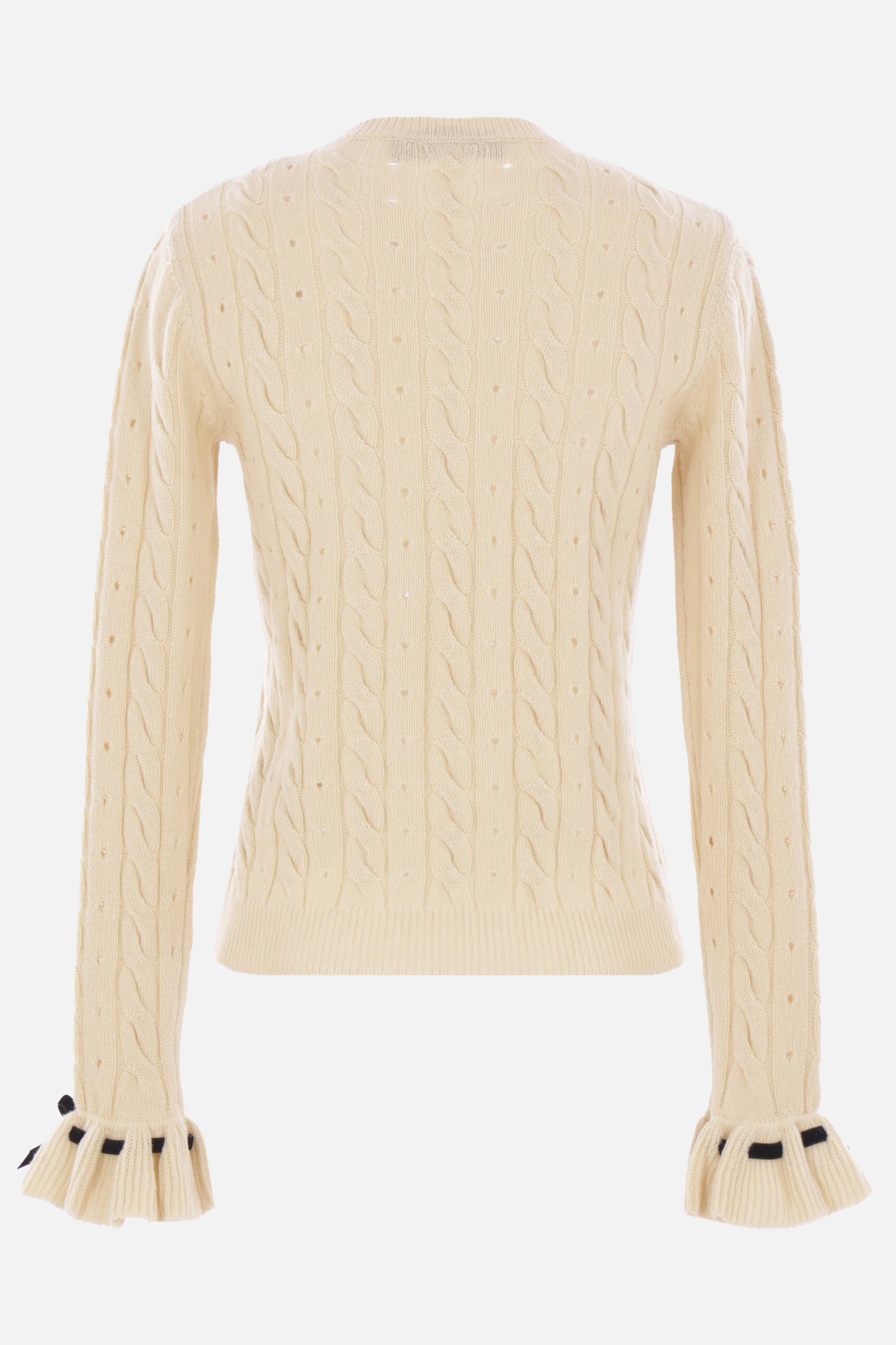 Valentino Garavani sweater crafted from ivory cable-knit wool with contrasting grosgrain ribbons. Featuring a crew neckline, long sleeves, ruffled cuffs, and ribbed trims. The design is completed with velvet bows adorning the cuffs and collar.