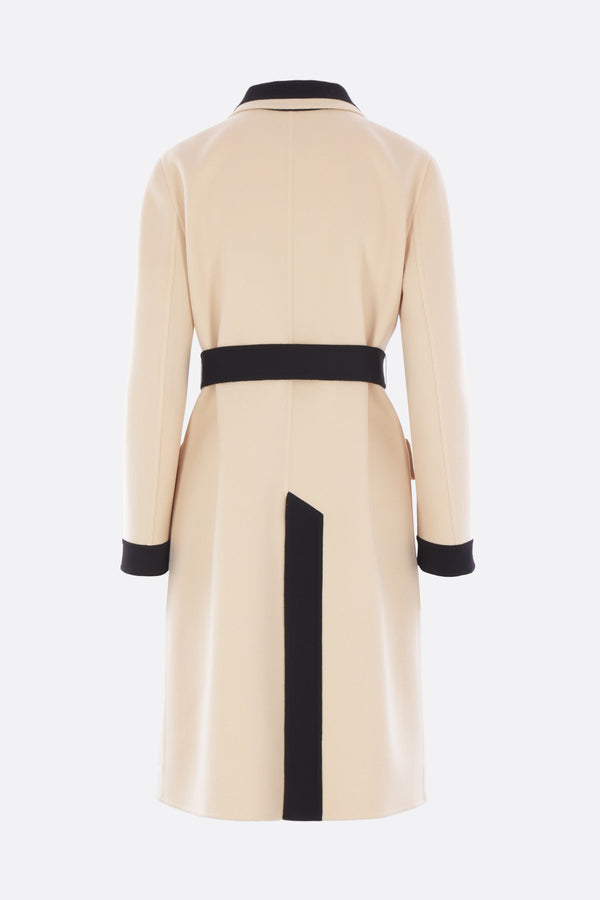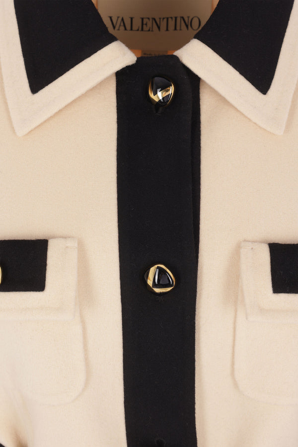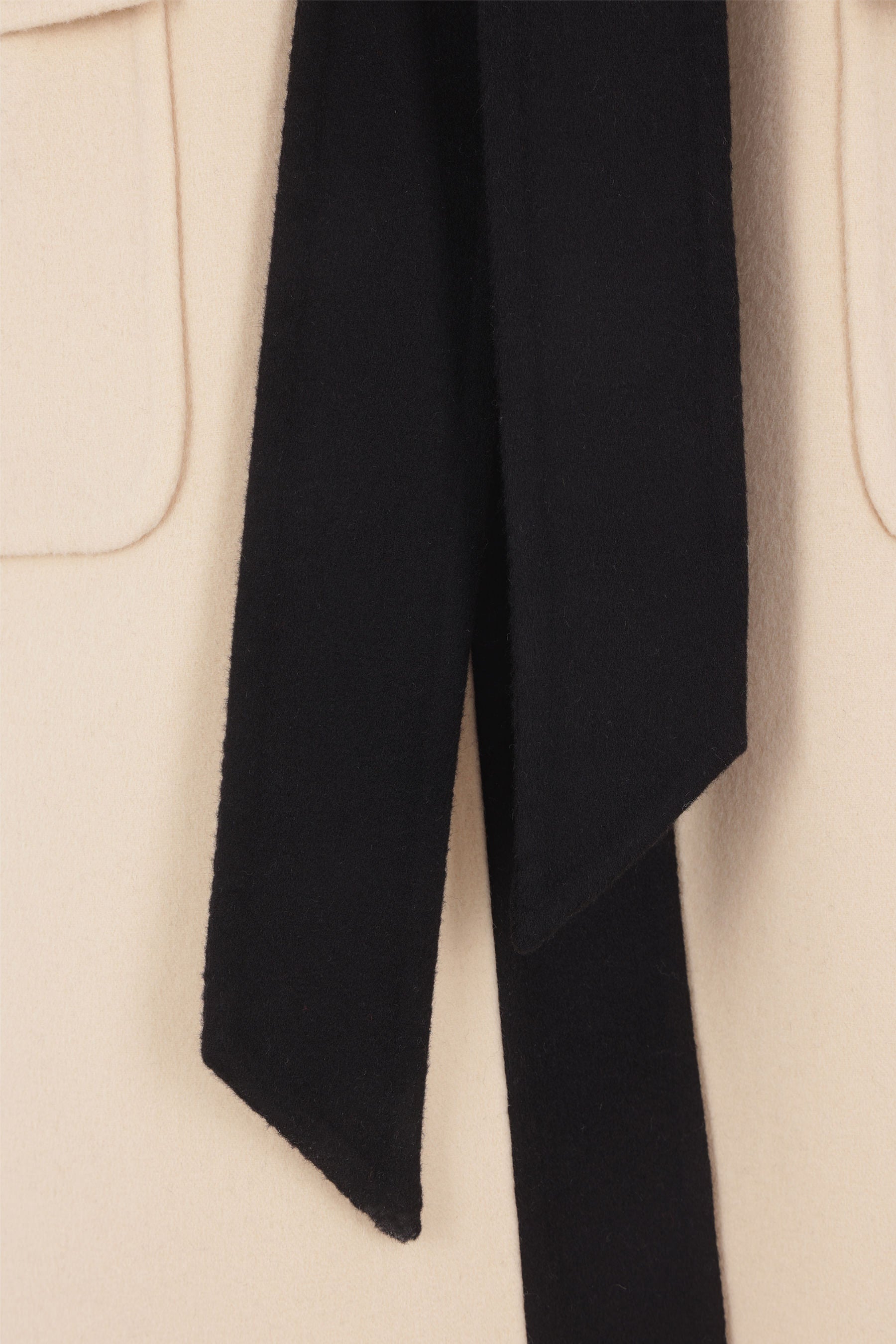 Valentino Garavani single-breasted coat crafted from ivory wool and cashmere with contrasting trims. Featuring a pointed collar, front button closure, contrasting belt, multiple pockets, long sleeves, a central back vent, and an unlined interior.