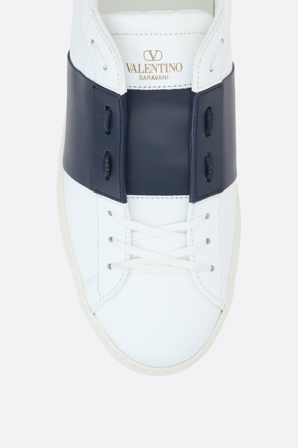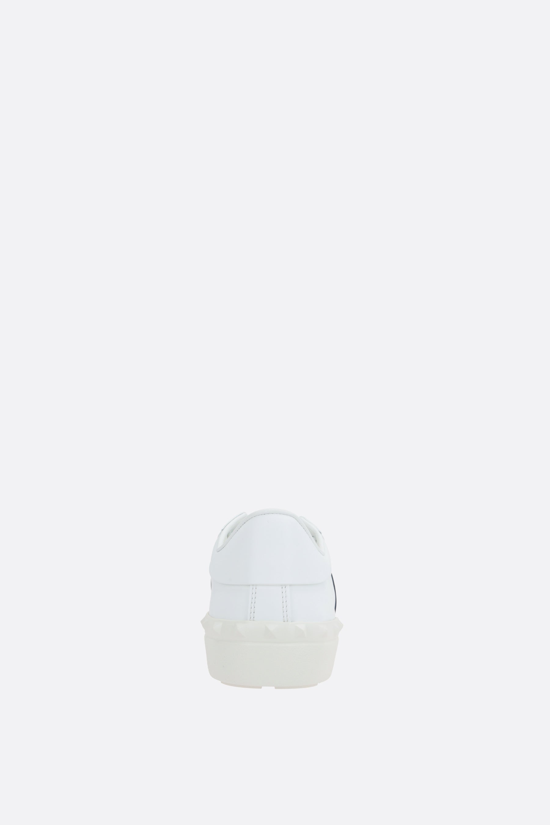 Valentino Garavani low-top sneaker crafted in white smooth leather with contrasting bands in marine blue leather. Featuring lace-up closure, a round-toe silhouette, leather lining and rubber sole. The design is completed by rubber studs around the heel.