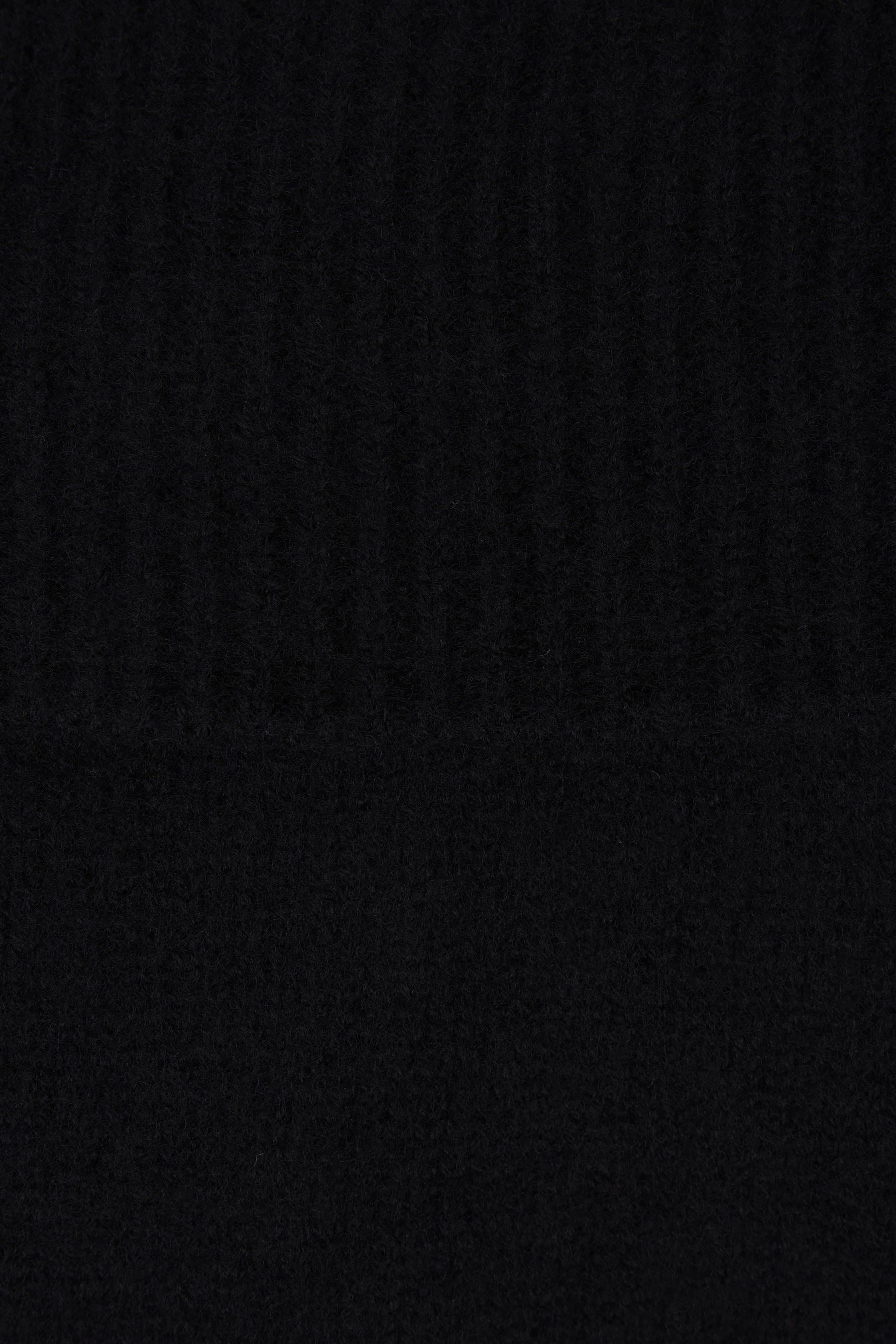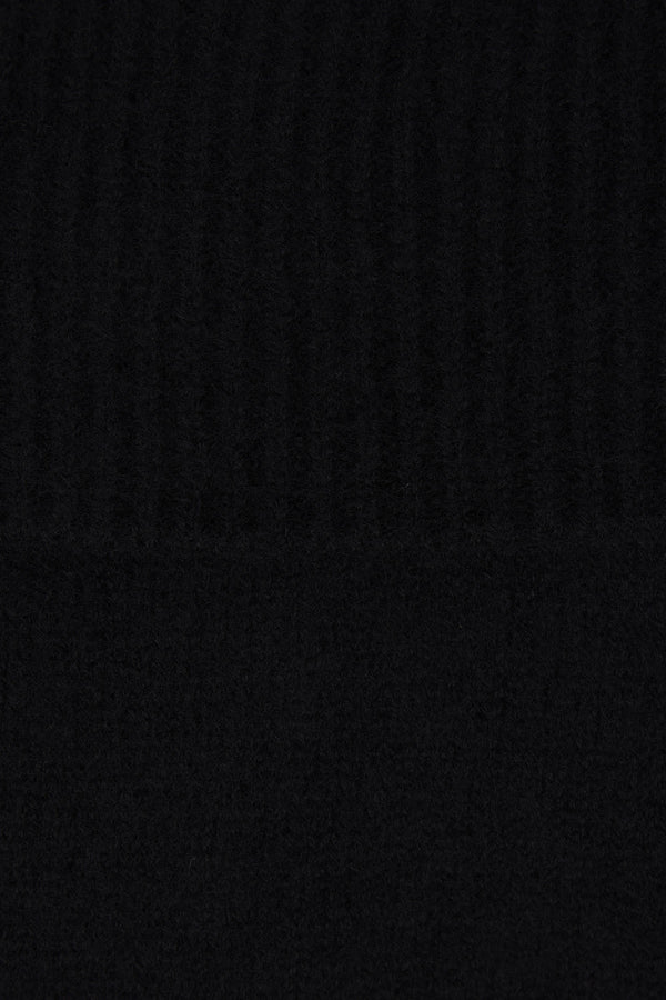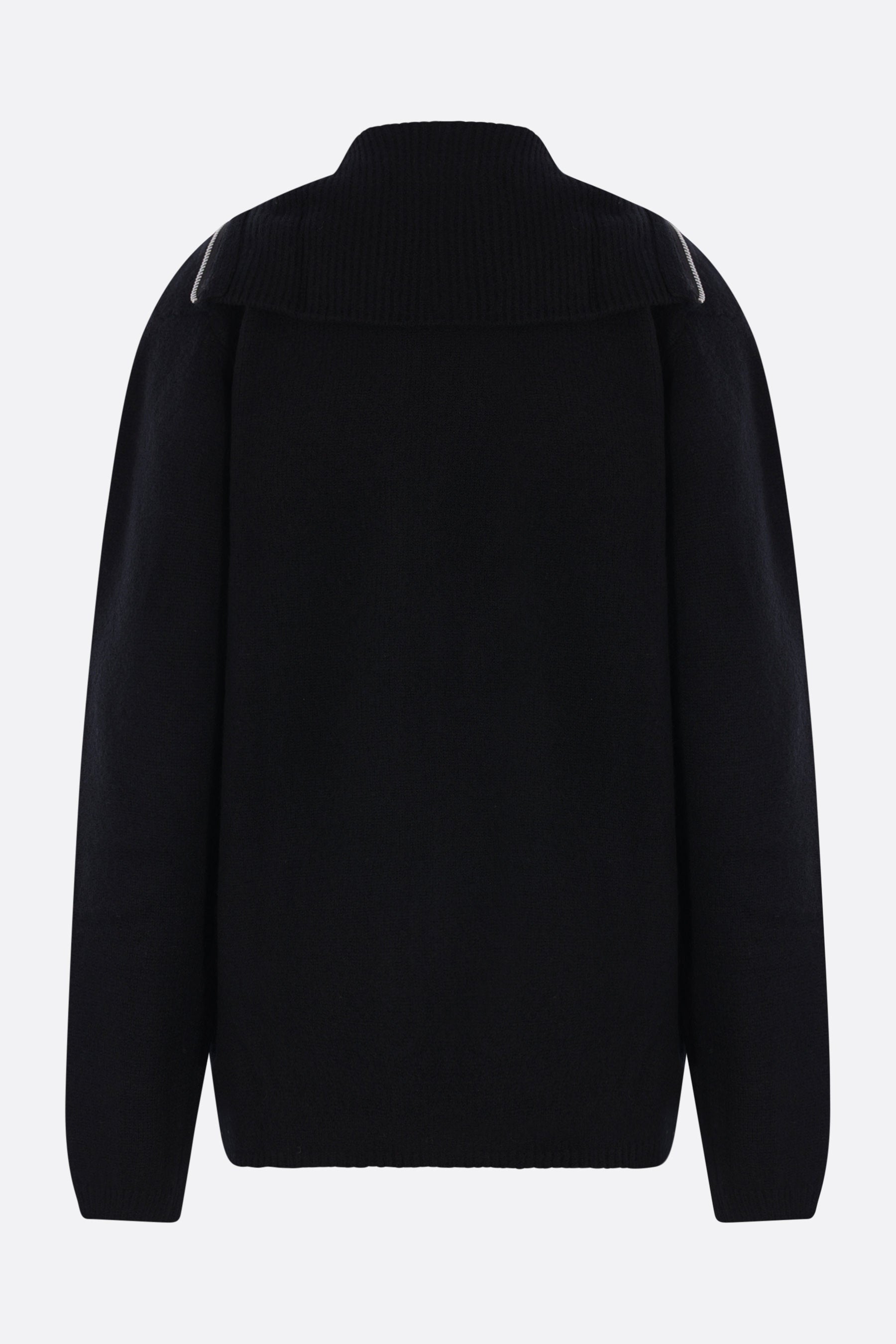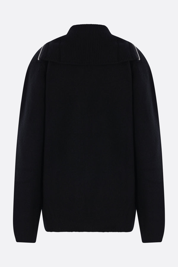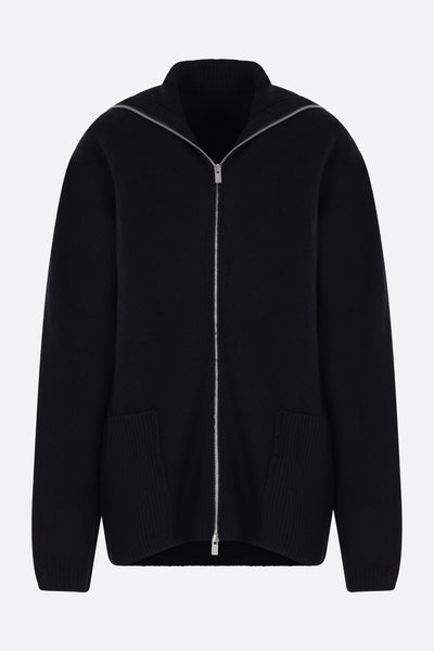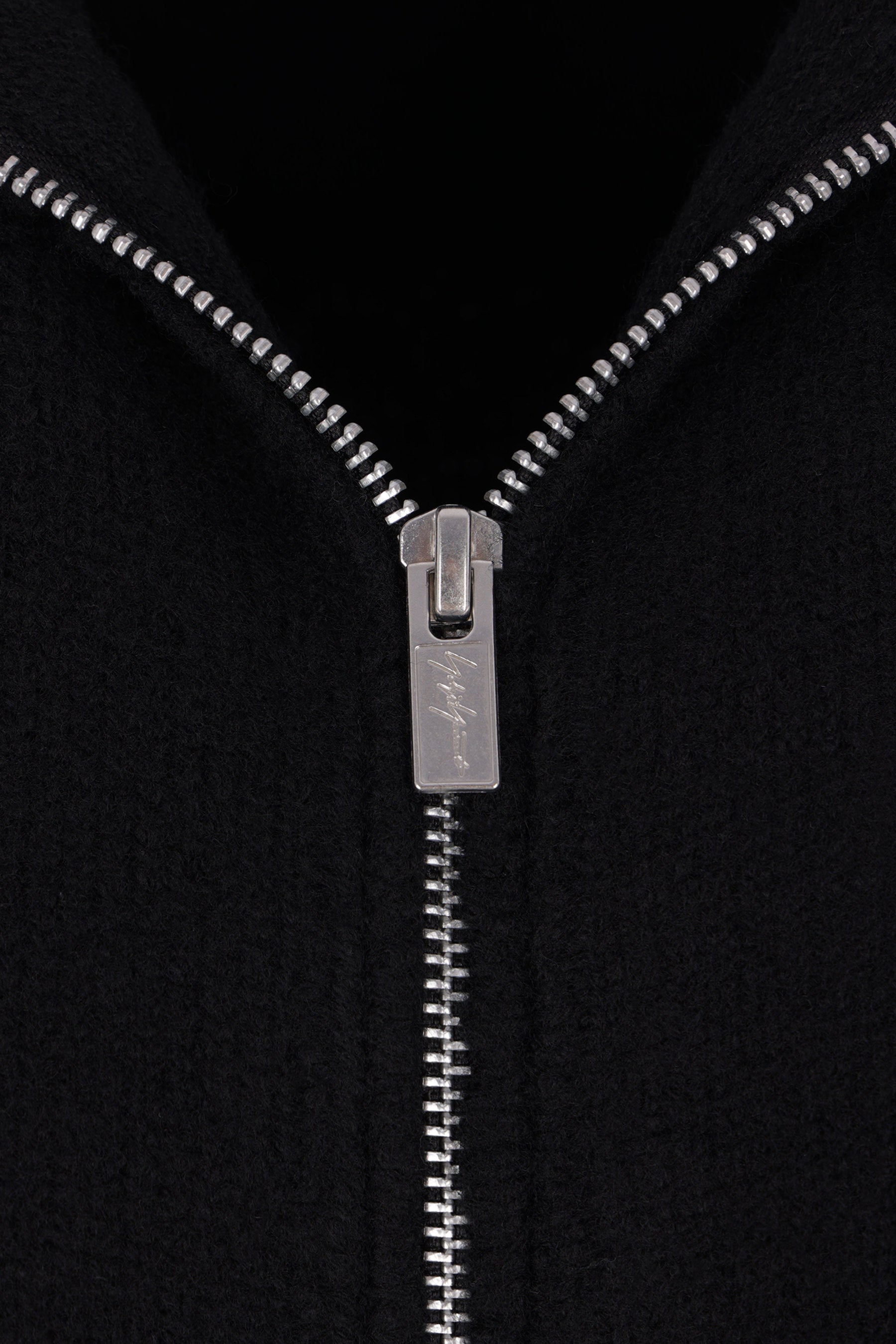Yohji Yamamoto cardigan crafted from black wool knit. Features a high collar, front two-way zip closure, front patch pockets, long sleeves, and ribbed edges.