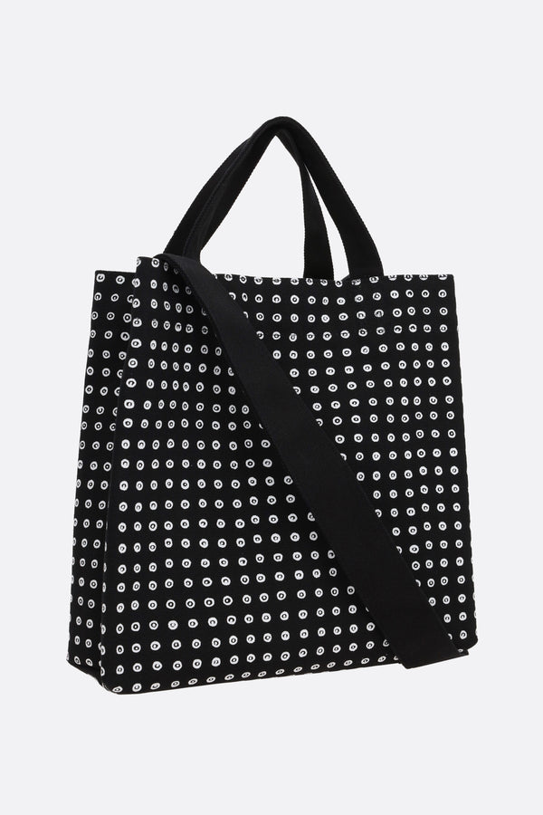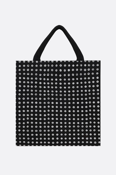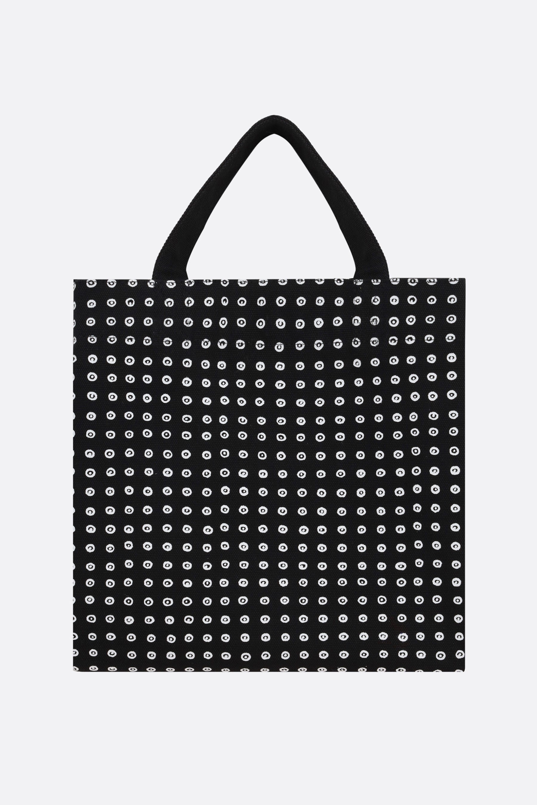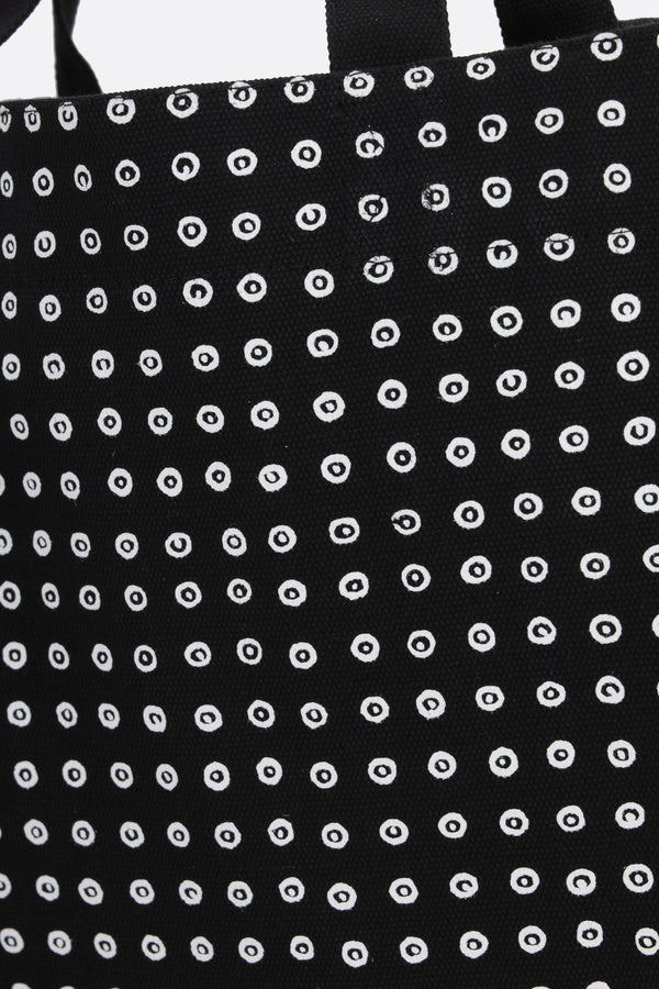 10 Corso Como shopping bag crafted from black cotton canvas with a contrasting signature circle print. Featuring double handles, a fixed shoulder strap, and an unlined interior with a flat pocket.