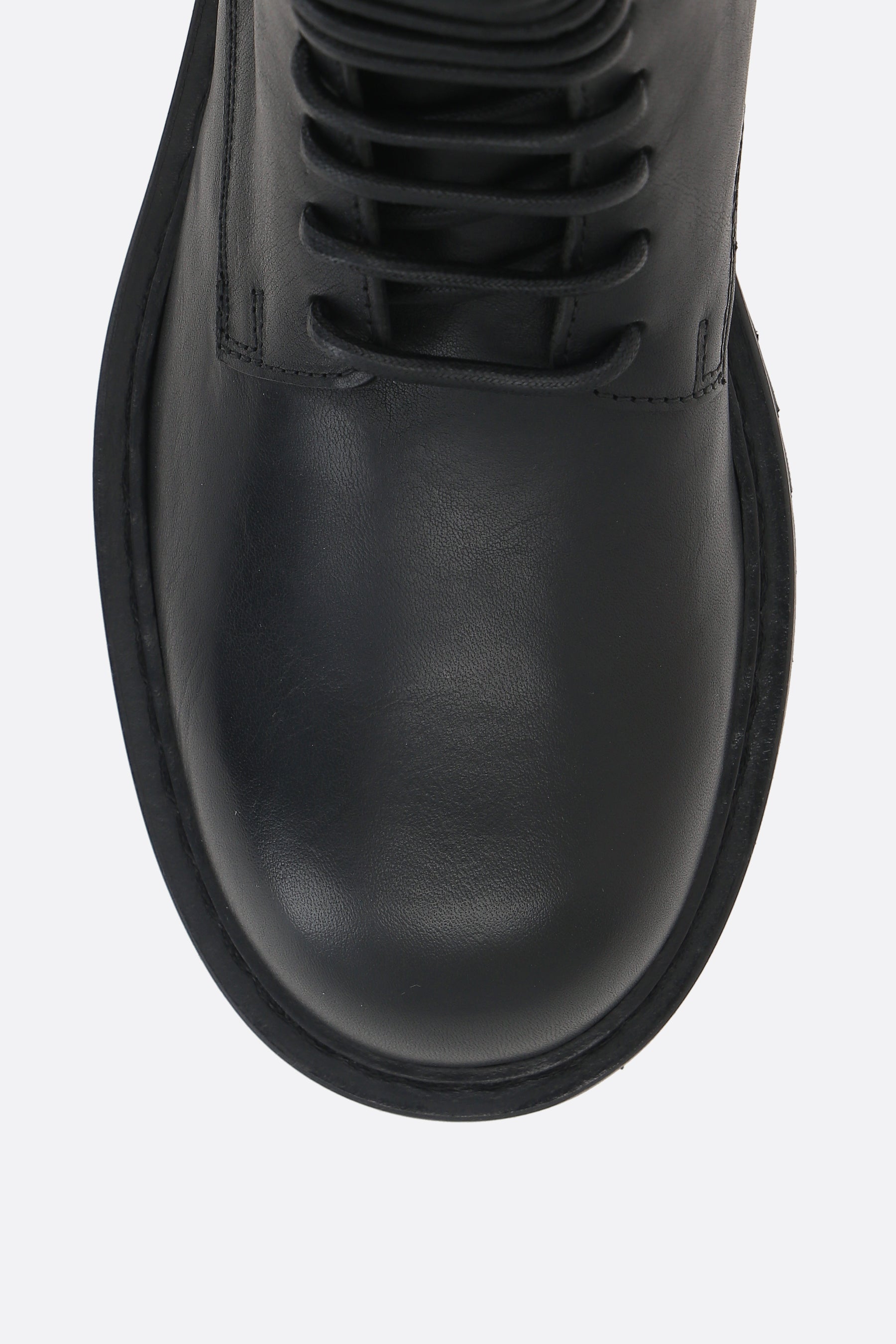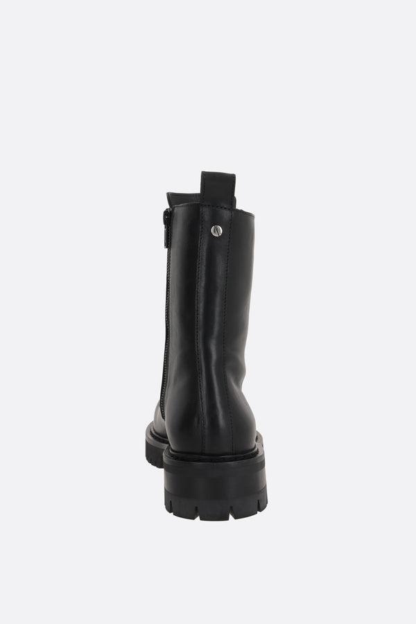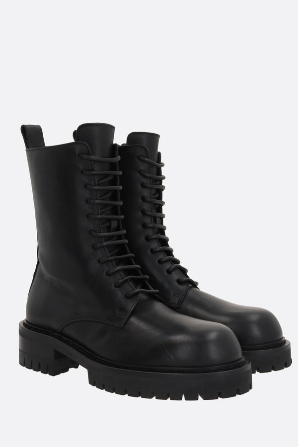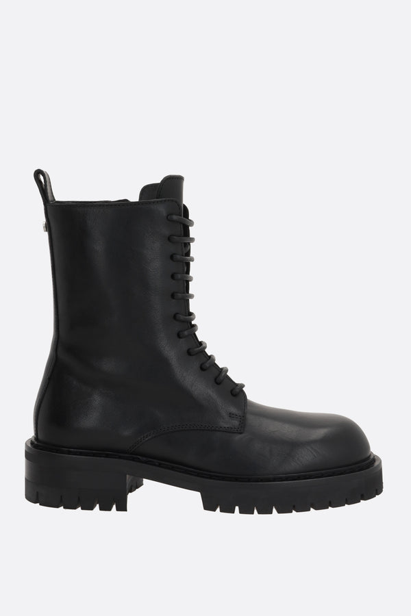 Ann Demeulemeester combat boots crafted from smooth black leather. Featuring a side zip closure, front lacing, round toe, leather lining, and a lugged rubber sole.