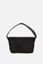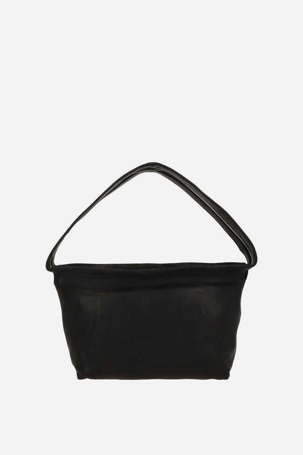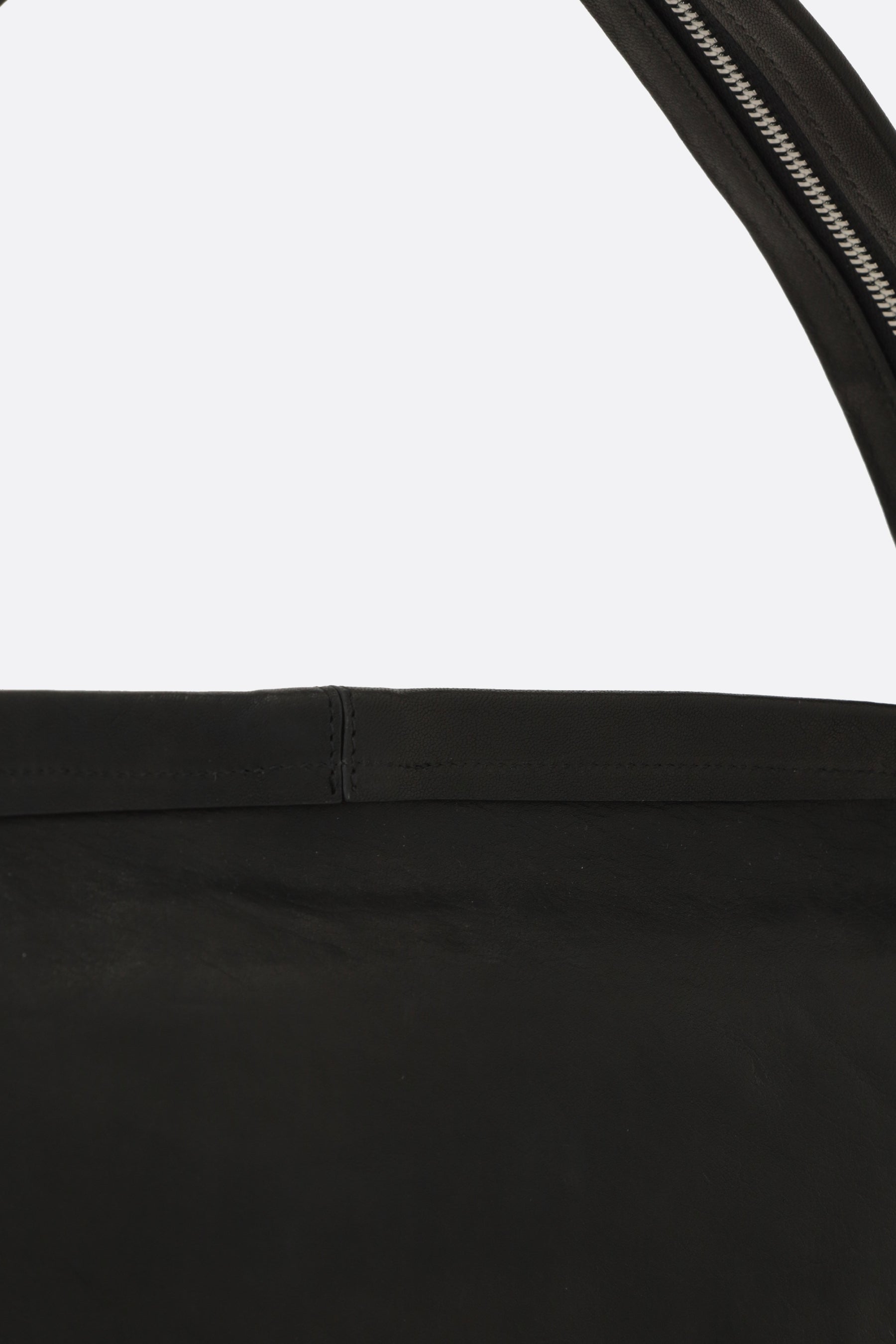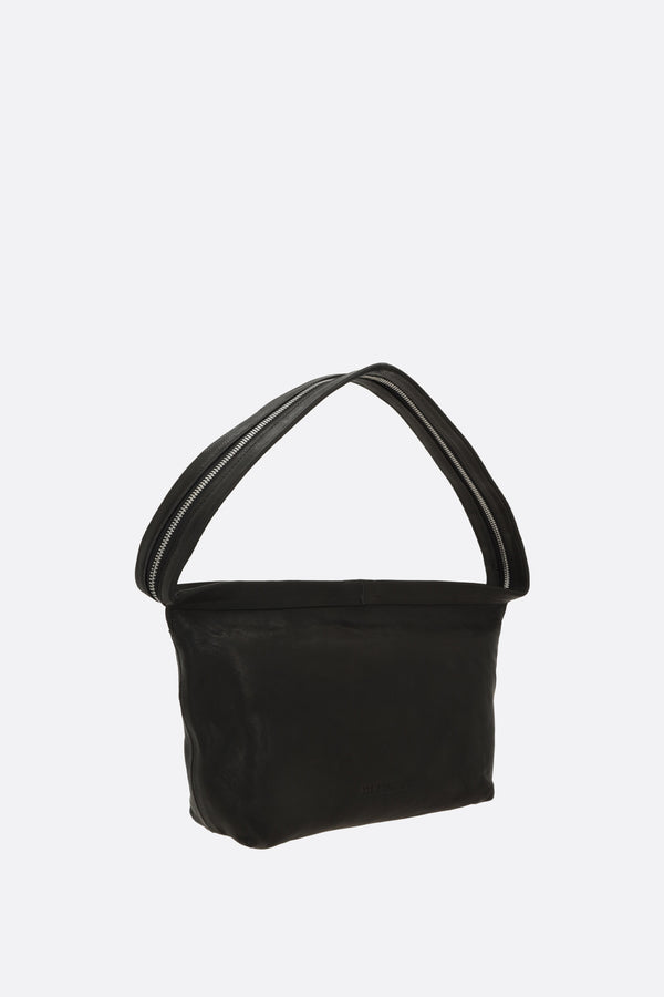 Ann Demeulemeester shoulder bag crafted from smooth black leather. It features silver-tone hardware, a double-slider zip closure, and a flat shoulder strap with a zip detail. The black canvas-lined interior includes a flat pocket. The design is completed with an embossed lettering logo on the front.