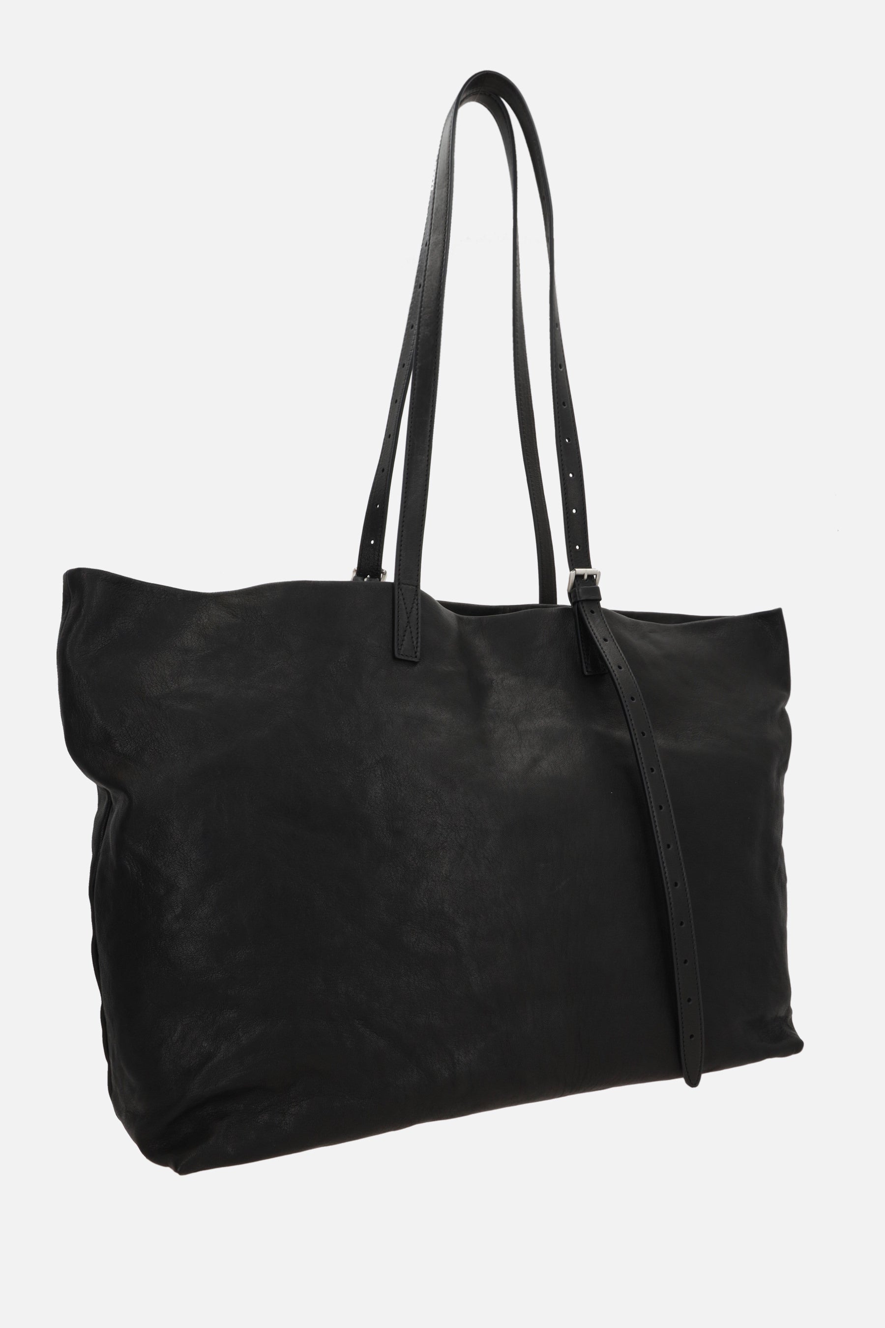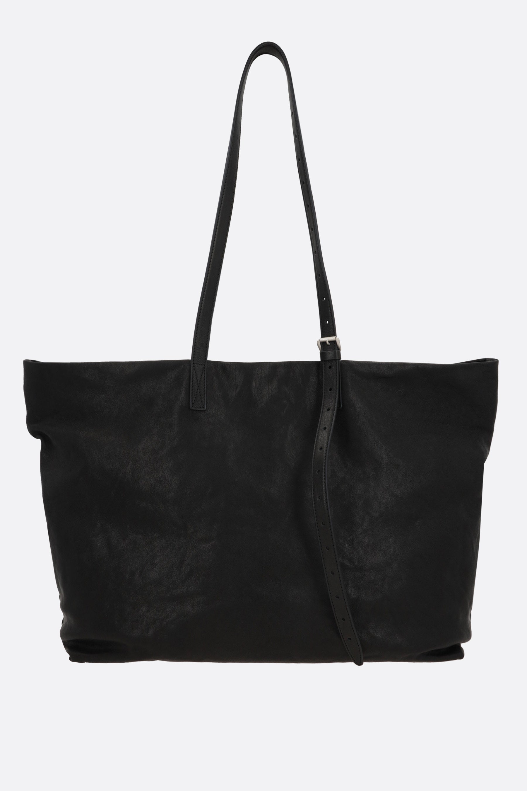 Ann Demeulemeester tote bag made of black nappa leather. Featuring silver-tone hardware, an internal closure with a loop and button, and adjustable handles with a metal buckle. The black fabric-lined interior includes a zip pocket.
