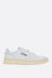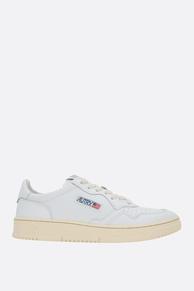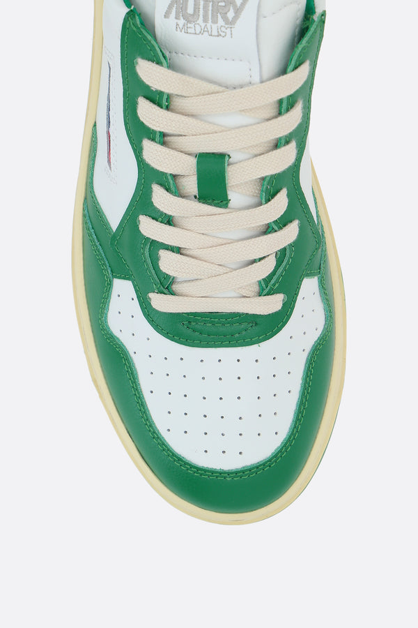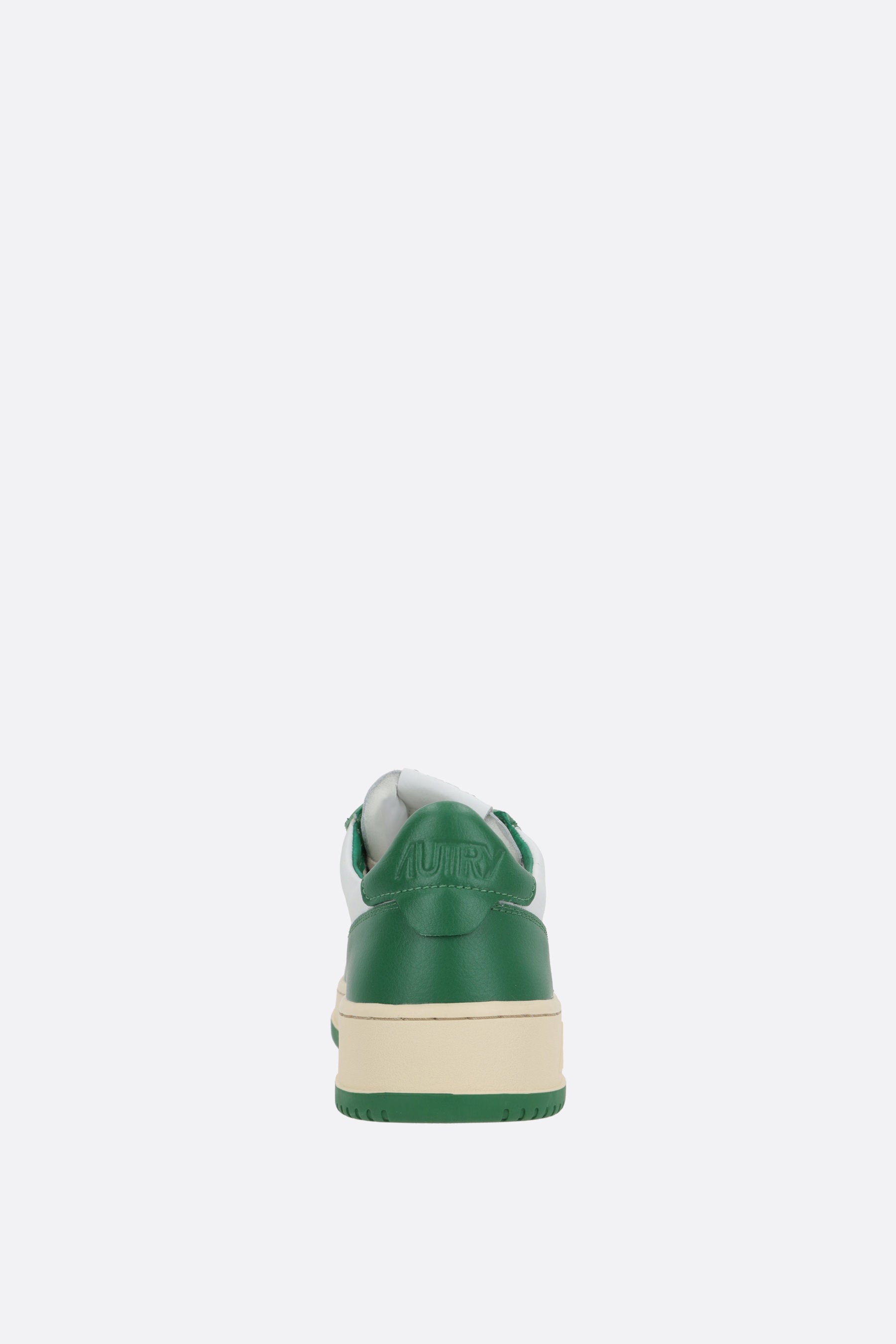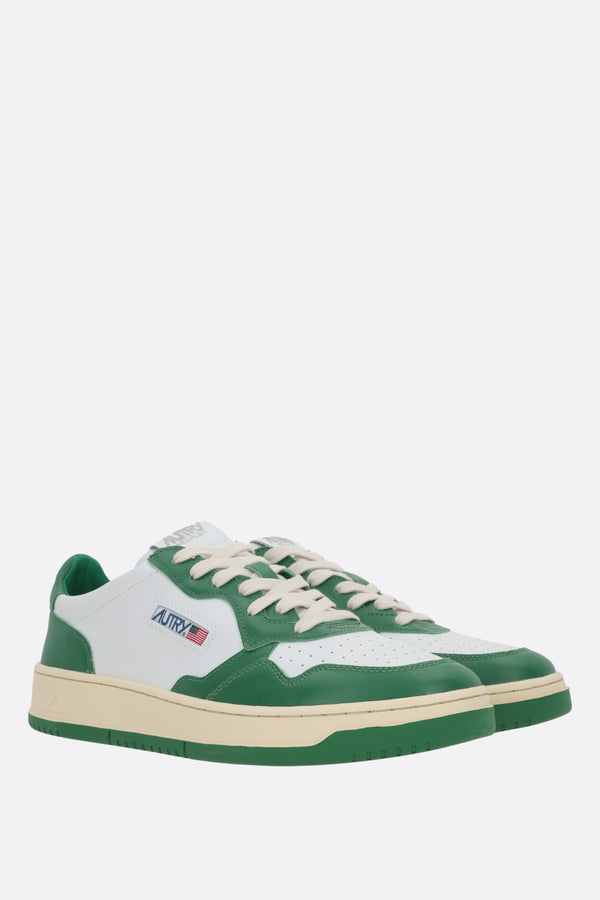 Autry low-top sneakers crafted from white and green smooth leather with perforated detailing on the toe. Featuring lace-up closure, rounded toe, leather and fabric lining, and rubber sole. The design is completed with the signature logo label on the tongue, side logo label, and green leather heel tab with embossed logo.