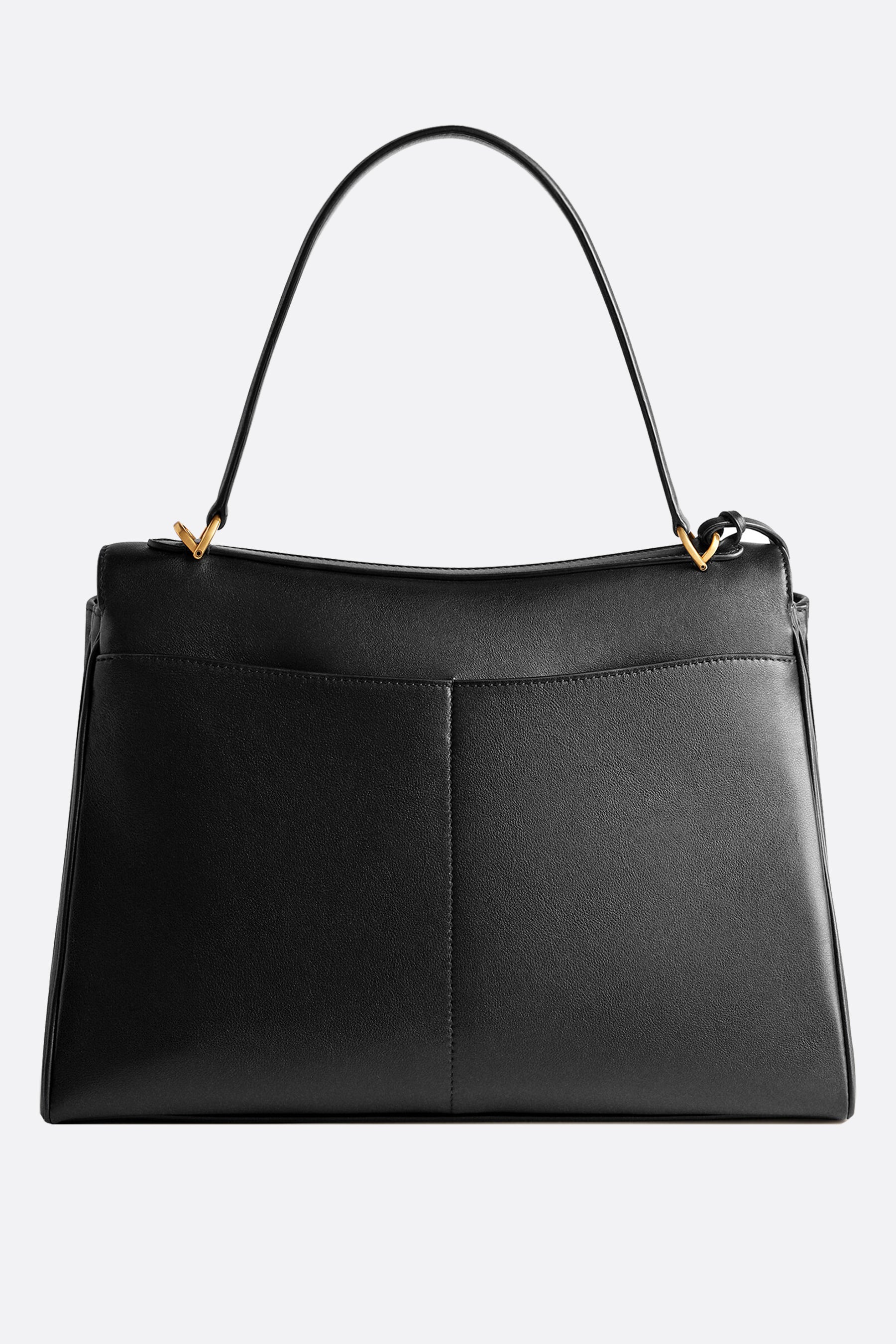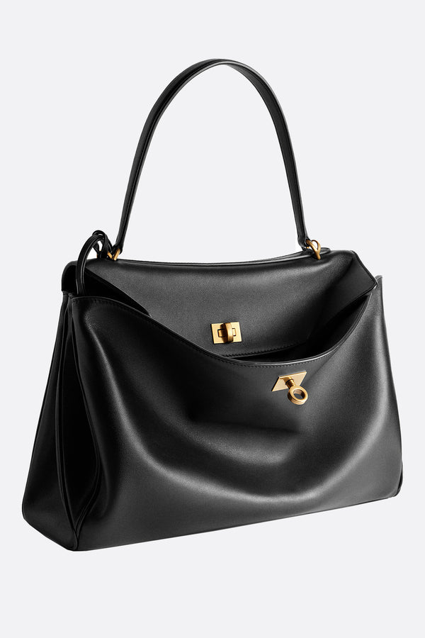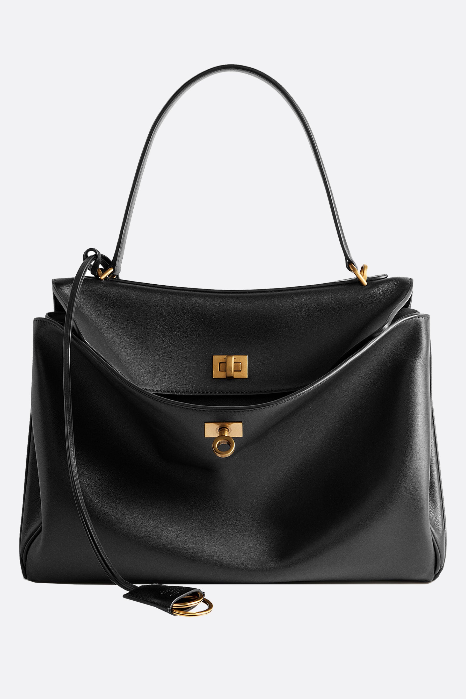 Balenciaga handbag crafted in black smooth leather. It features gold-tone hardware, turn-lock closure, top handle and removable strap. Black nappa-lined interior with zip pocket. The design is completed by protective metal feet, two slip pockets and a removable key holder with two split rings.