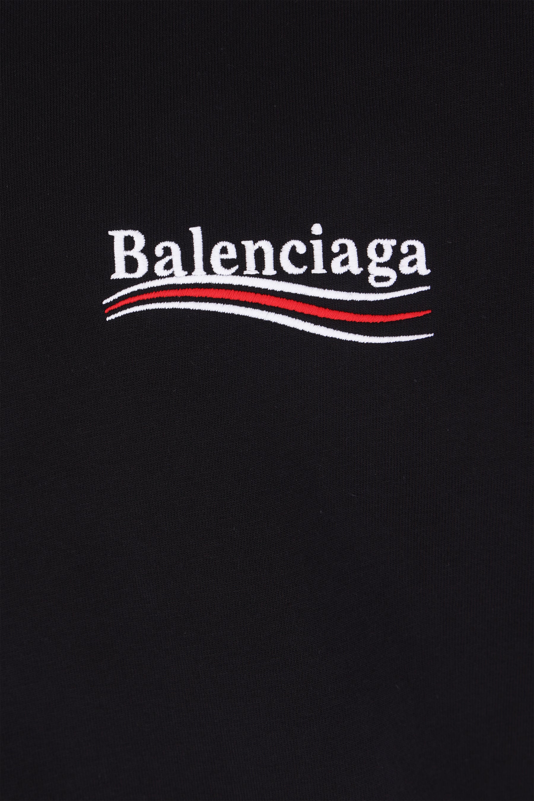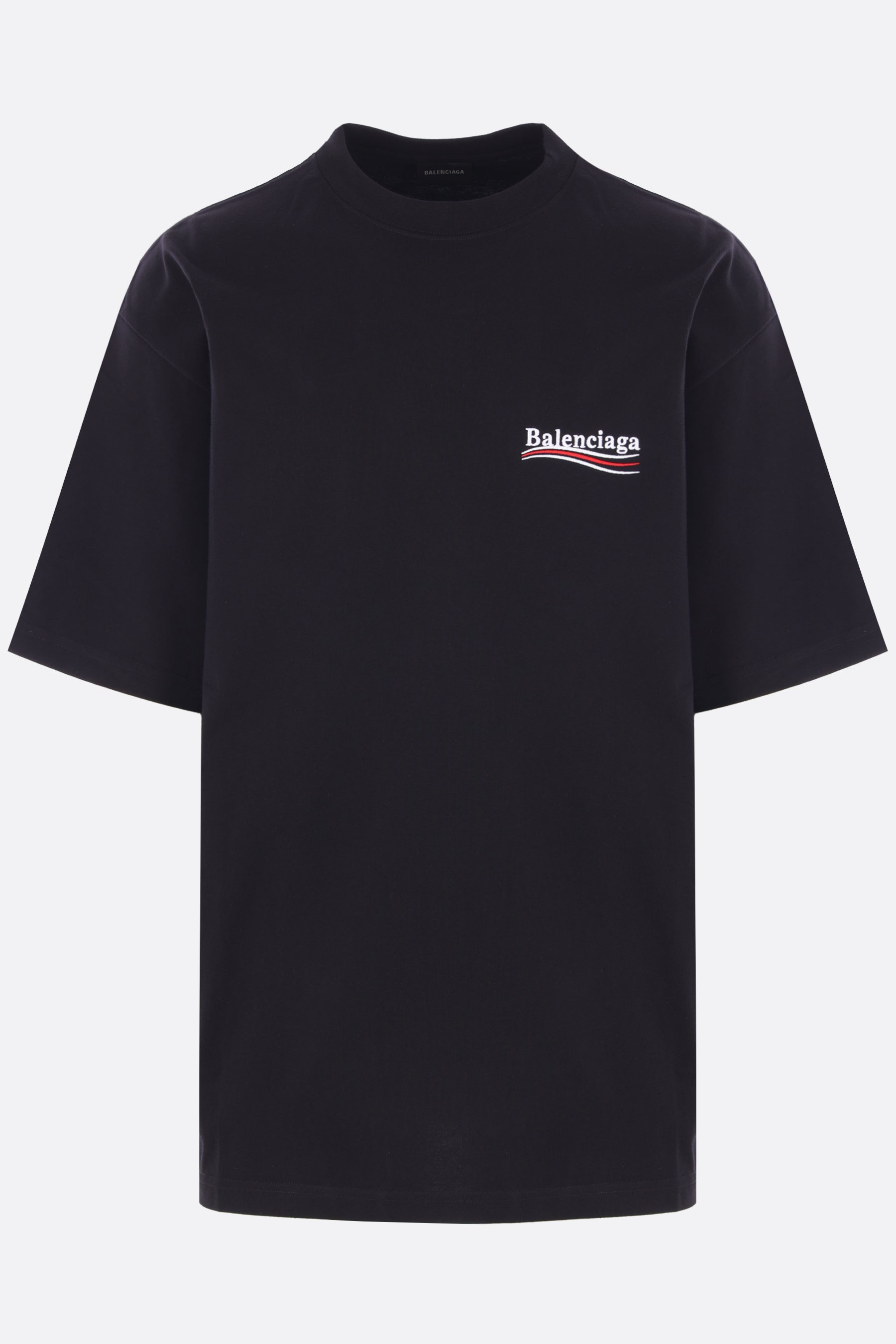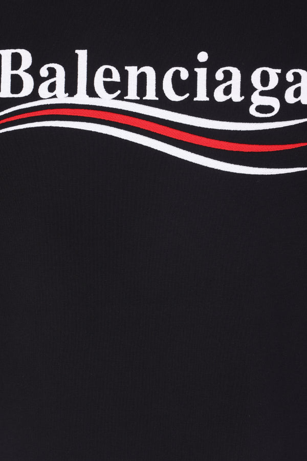 Balenciaga t-shirt made of faded black cotton jersey featuring the Political Campaign motif embroidered on the chest and back. Designed with a crew neckline, short sleeves, and a straight hem.