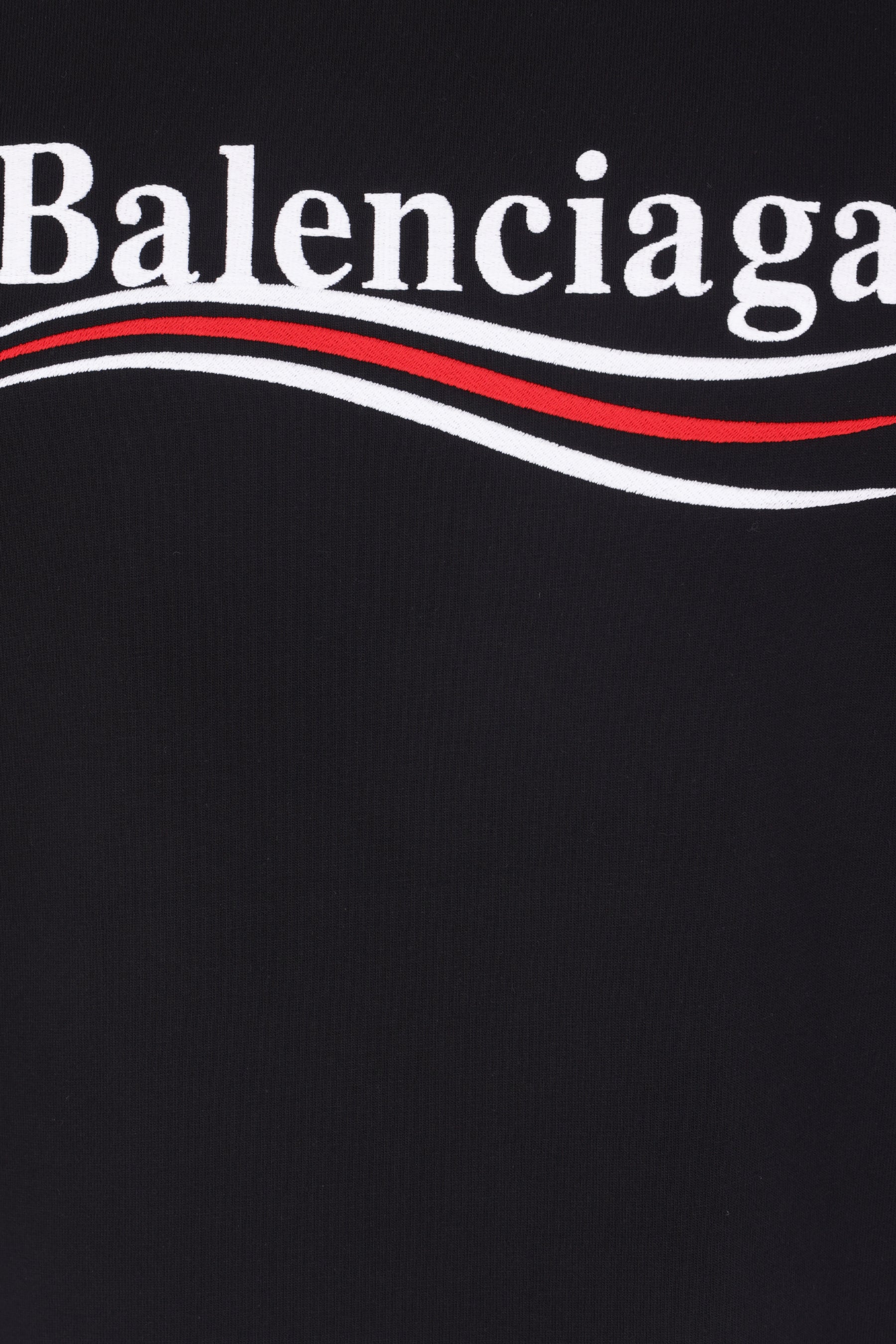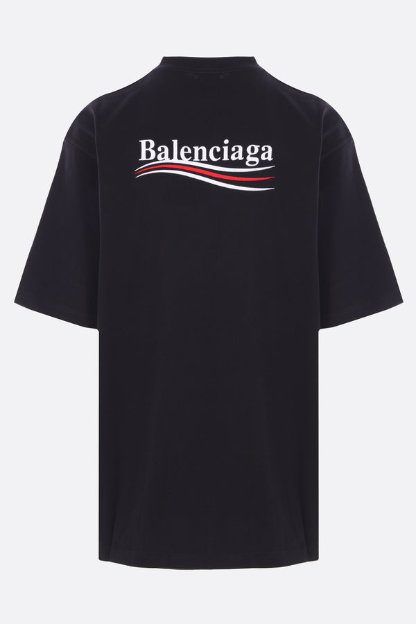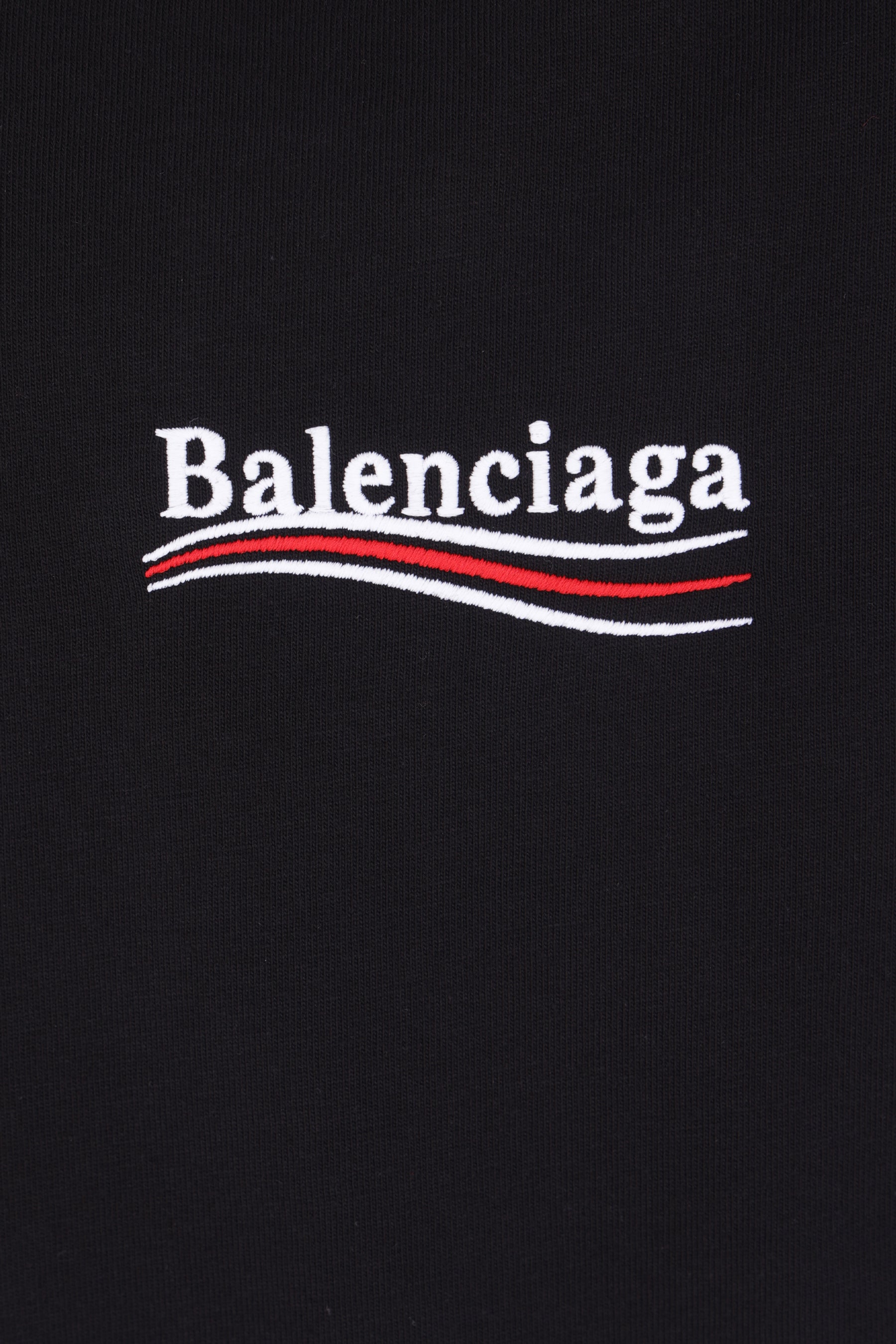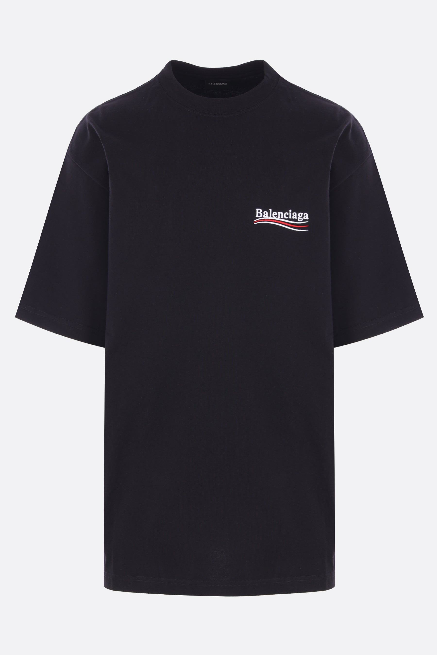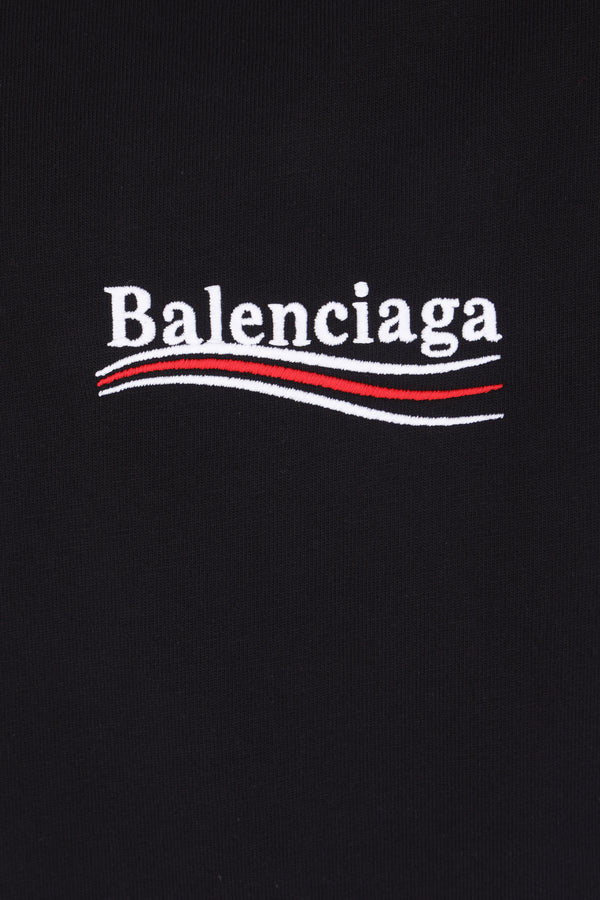 Balenciaga oversized t-shirt made of faded black cotton jersey featuring the Political Campaign motif embroidered on the chest and back. Designed with a crew neckline, short sleeves, and a straight hem.