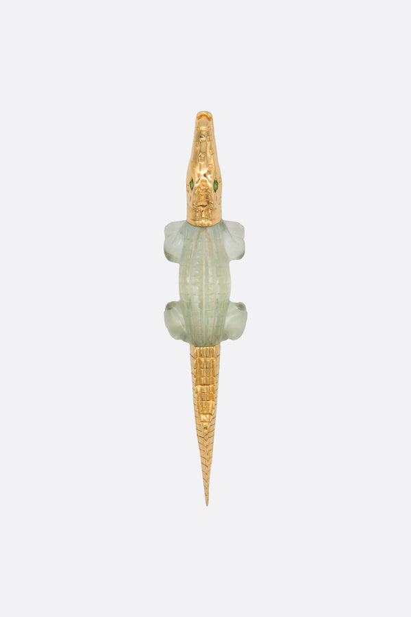 Bibi Van Der Velden's single earring crafted in 18k yellow gold with alligator head-shaped detail embellished by tsavorite eyes and green amethyst body. Featuring a latch back closure for pierced ears.