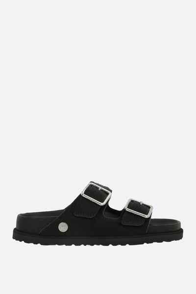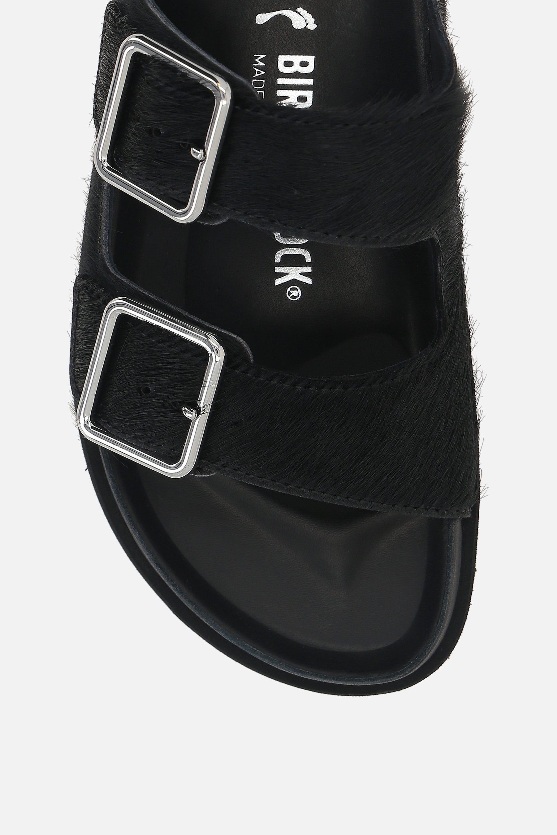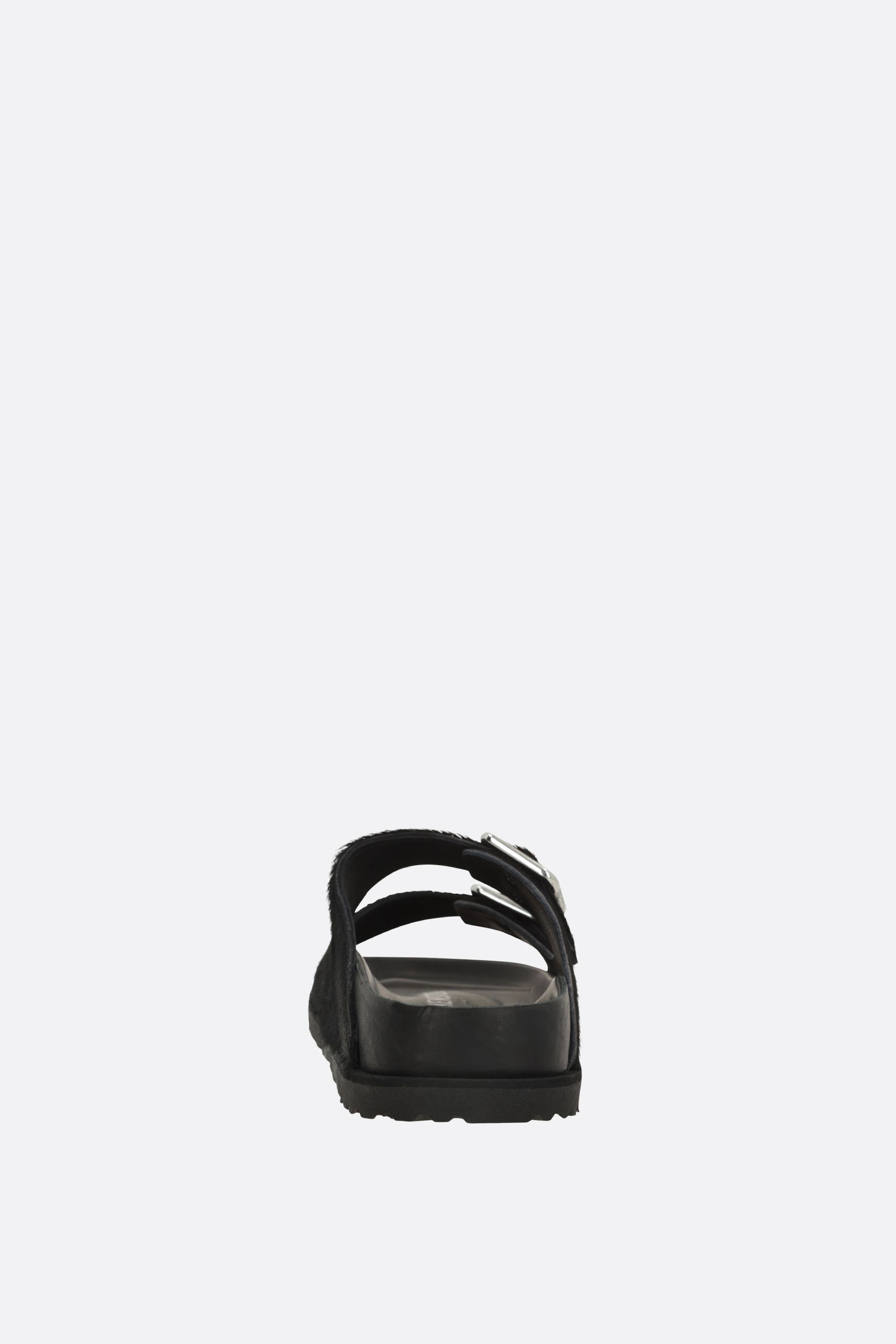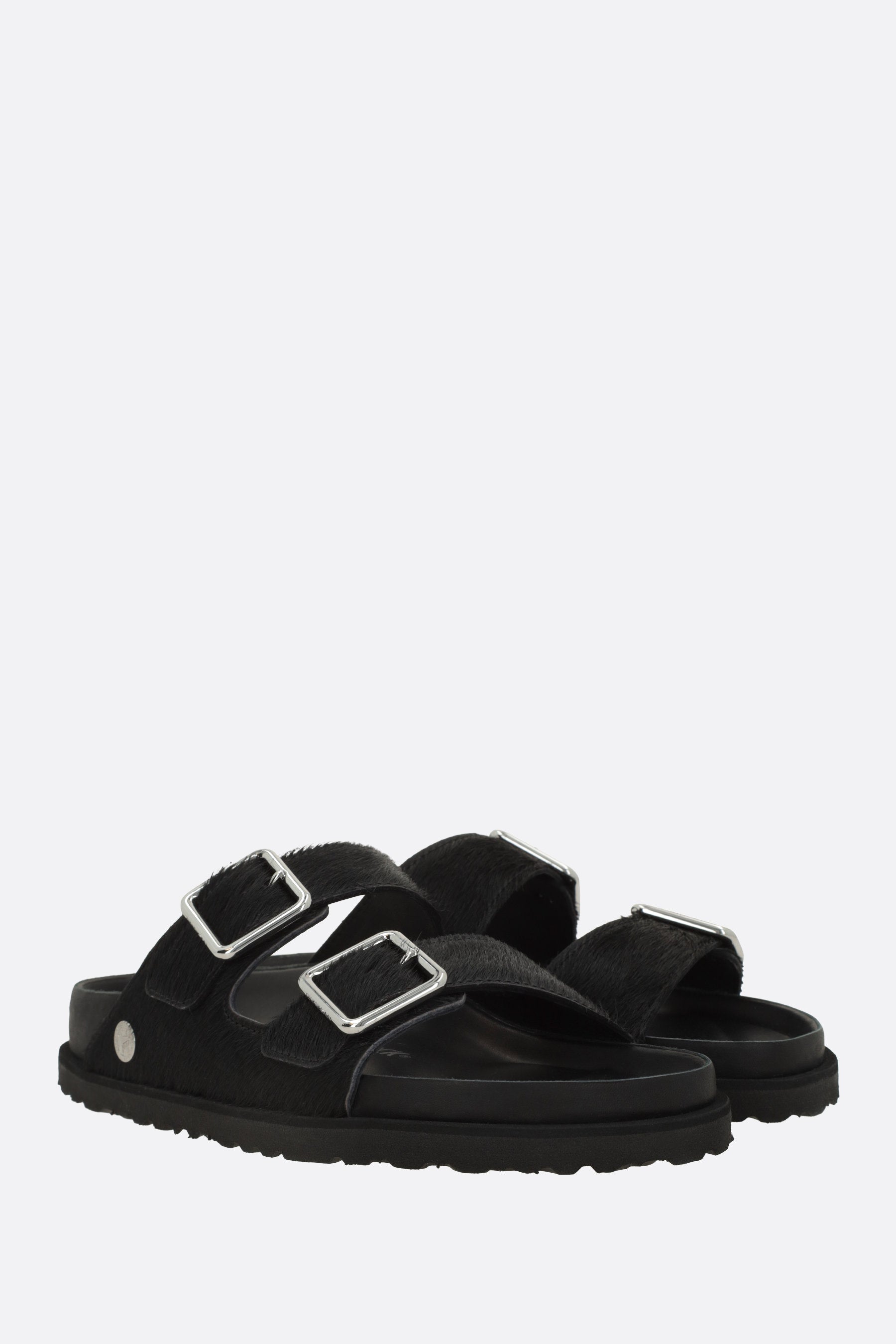 Birkenstock 1774 flat sandals crafted from black pony hair. Featuring a rounded toe, adjustable straps with metal buckles, leather linings, and a lightweight EVA rubber sole. The design is completed by the iconic metal logo applied on the side.