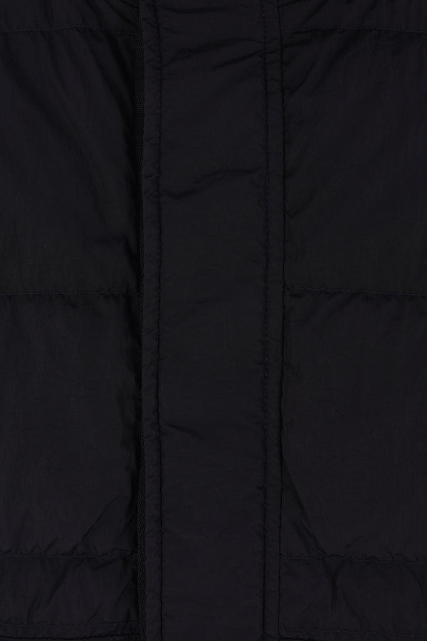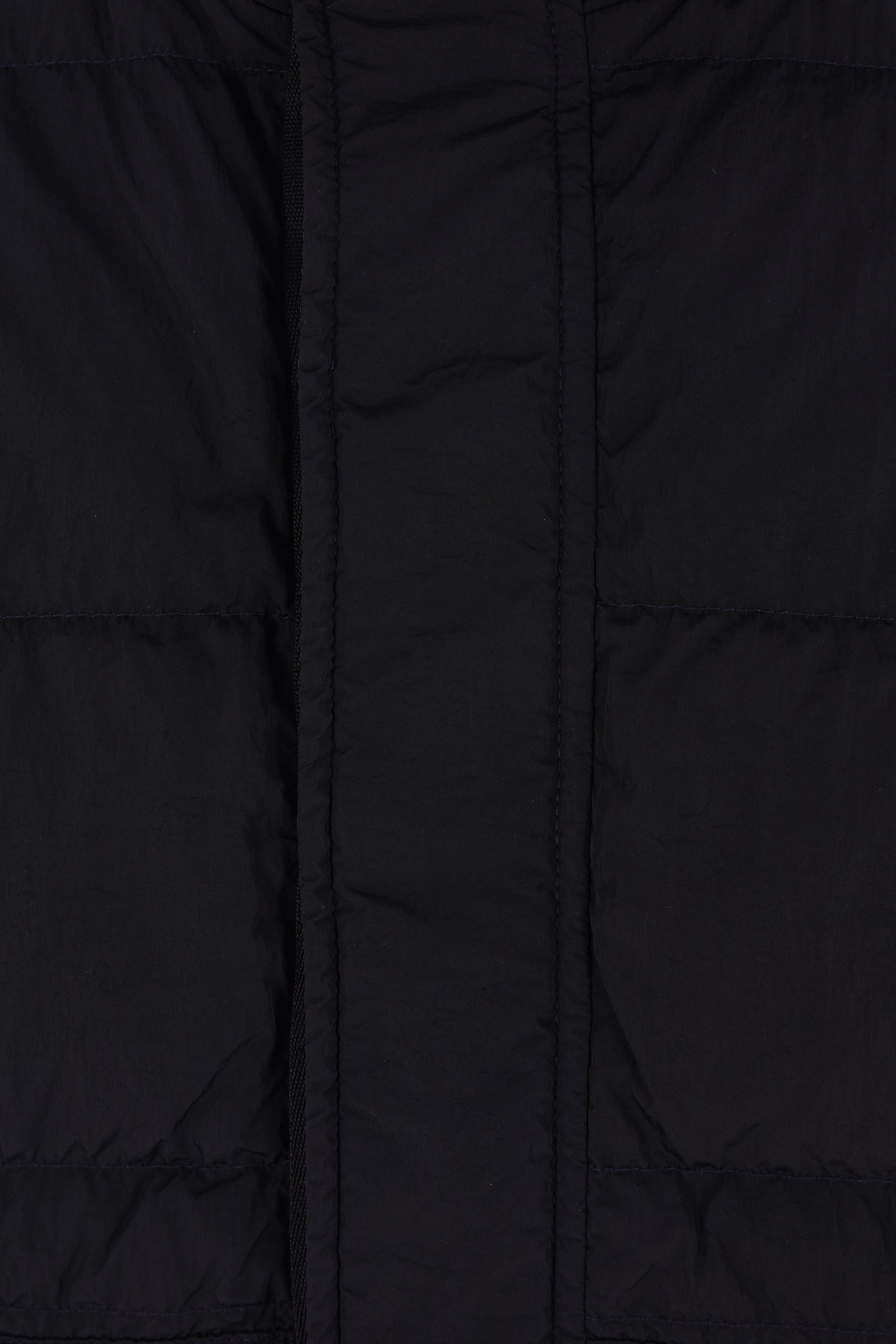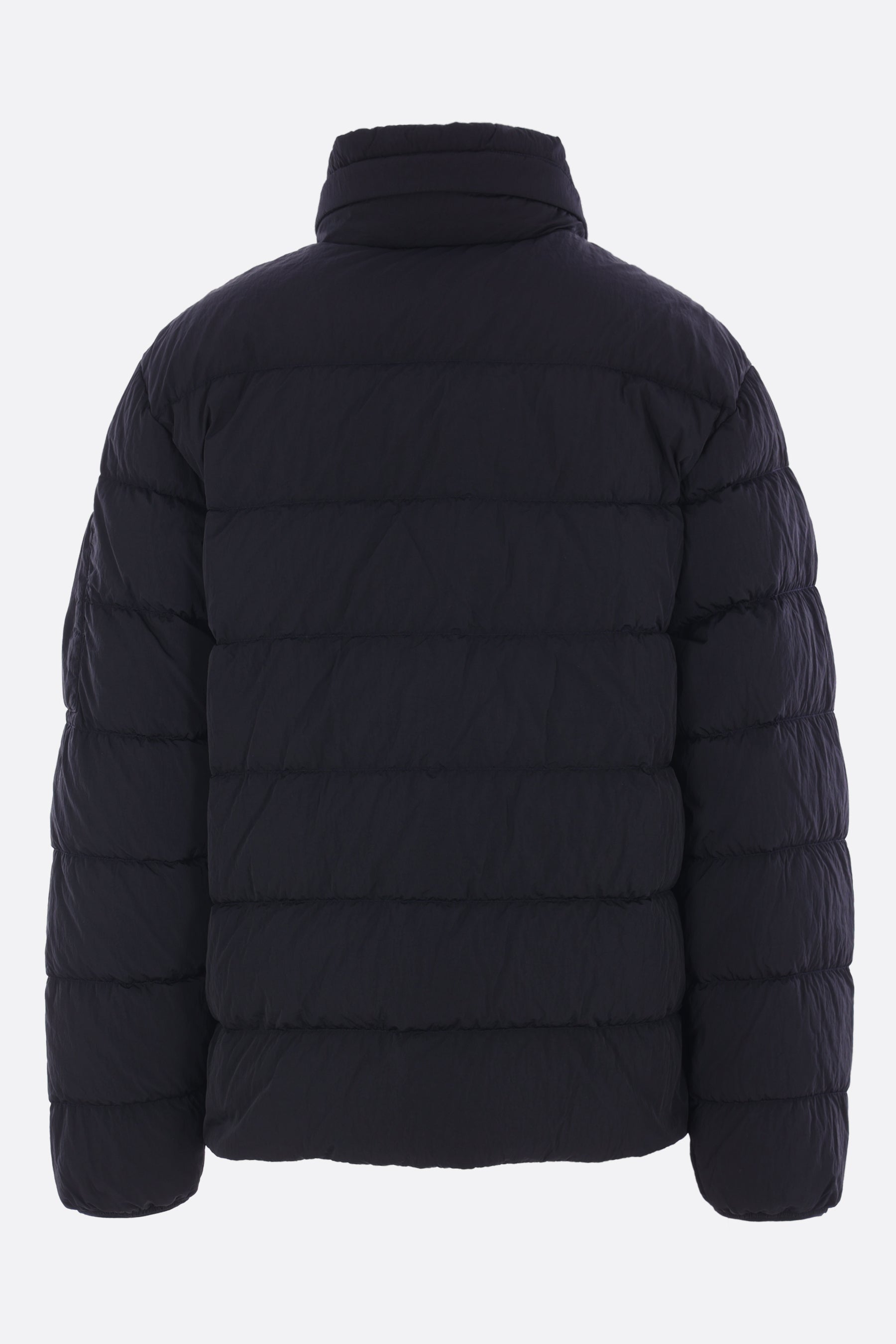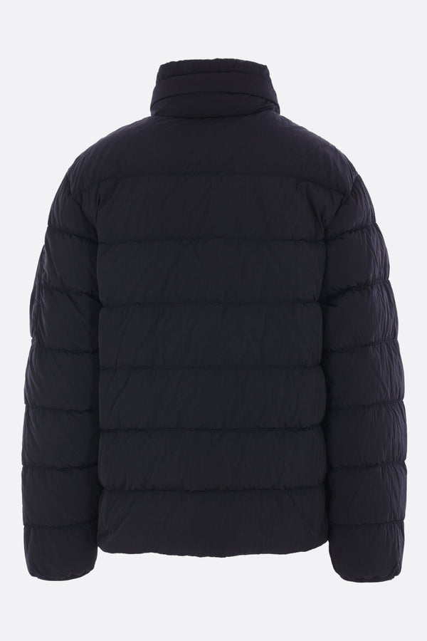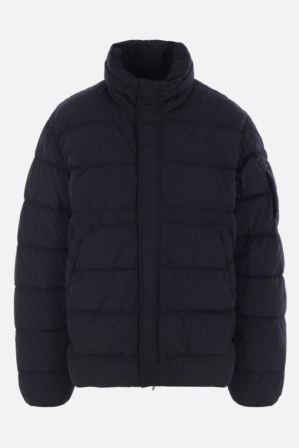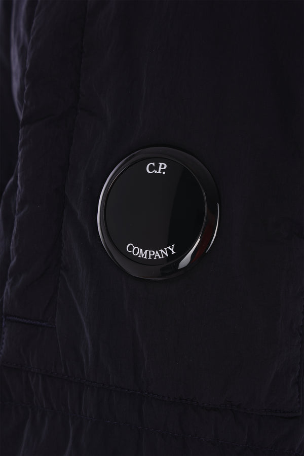 C.P. Company down jacket made of dark blue Chrome-R nylon. Featuring a high collar, packable hood, front closure with two-way zipper and snap buttons, kangaroo pockets, long sleeves with elasticated cuffs, and a straight hem with drawstring. The design is completed by the pocket on the left sleeve adorned with the C.P. Company Lens detail.