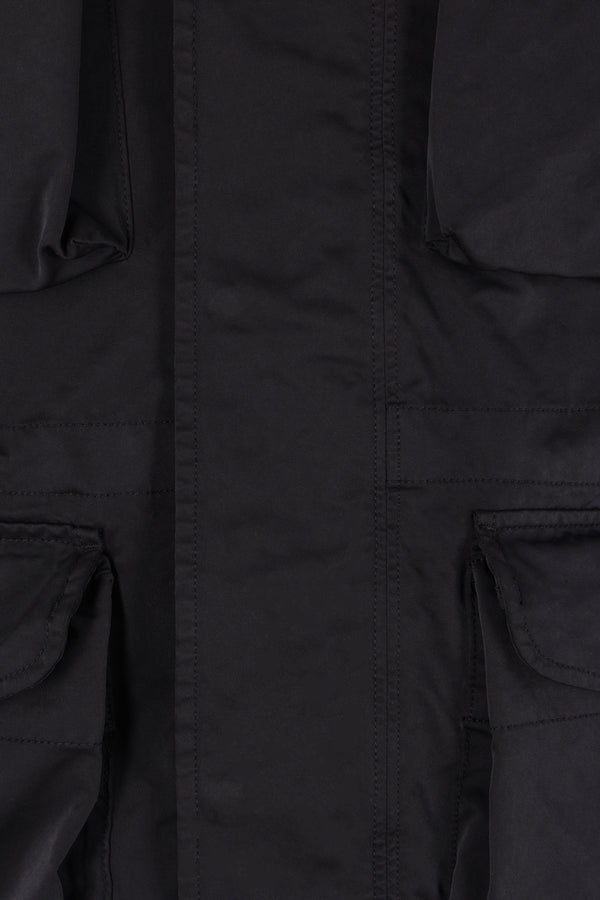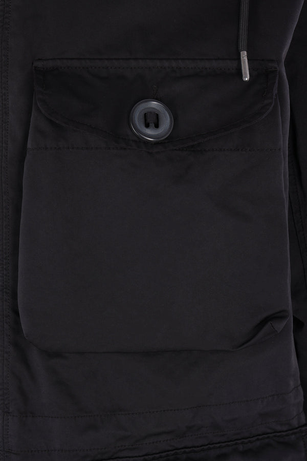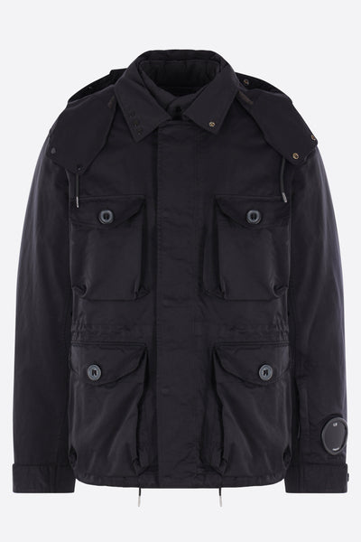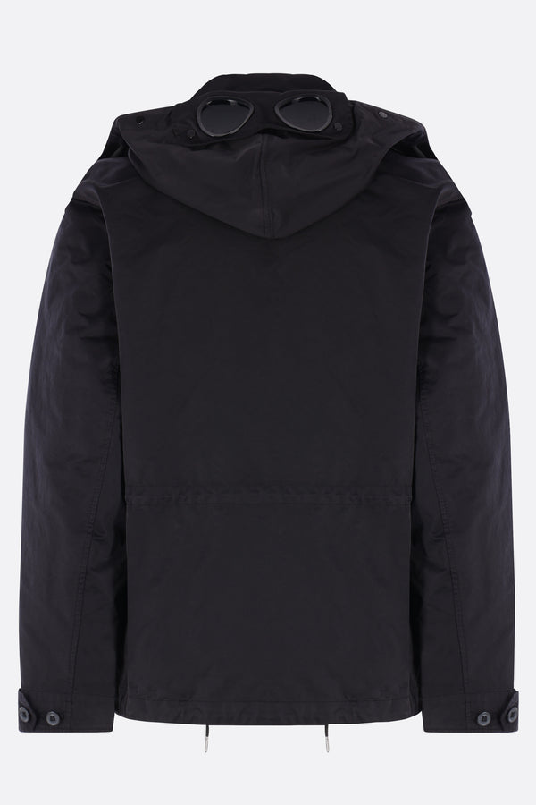C.P. Company down jacket crafted from Micro Kei, a polyester/nylon microfiber. Featuring pointed collar, removable hood with Goggle detail, front zip and snap-button closure, multiple pockets, long sleeves with adjustable tabs, drawstrings at waist and hem, and removable down padding. The design is completed by the C.P. Company Lens detail on the left cuff.