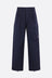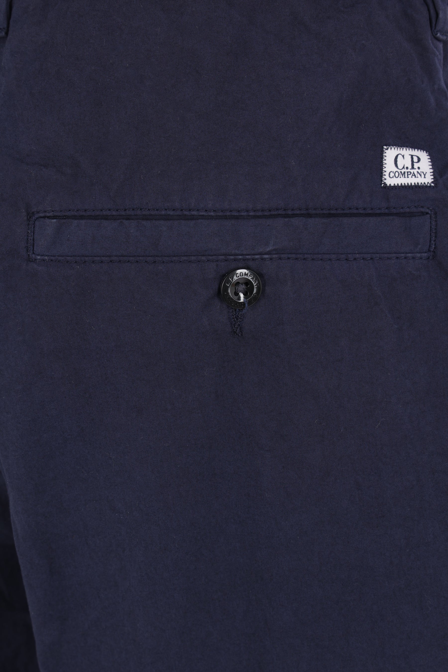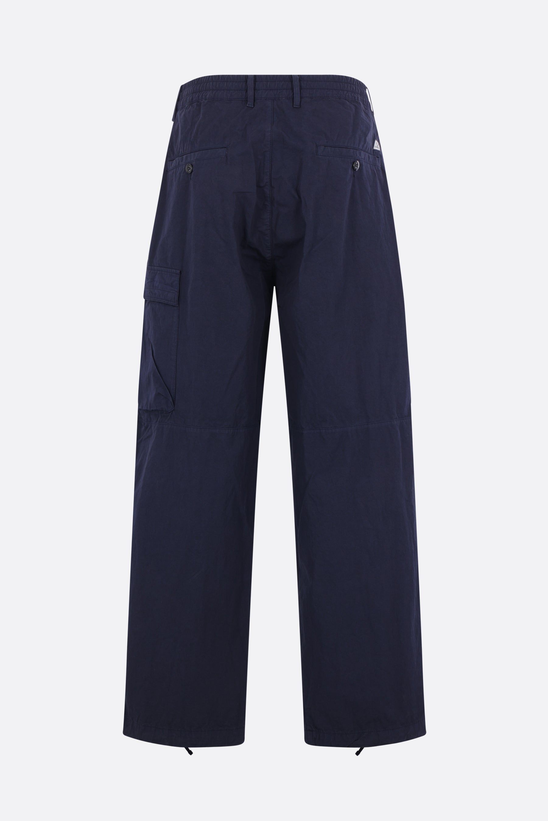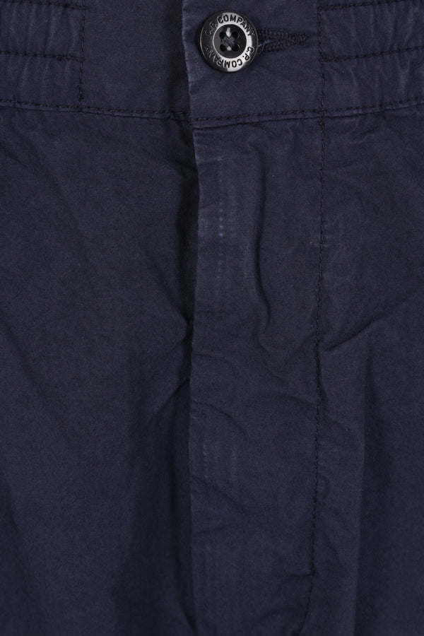 C.P. Company cargo trousers crafted from dark blue Micro-Reps cotton. Features an elasticated waistband with drawstring, front metal button and zip closure, belt loops, multiple pockets, and adjustable hems with drawstring. The design is completed with the signature C.P. Company Lens detail.