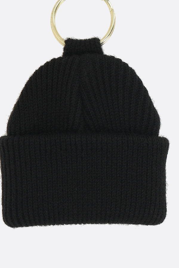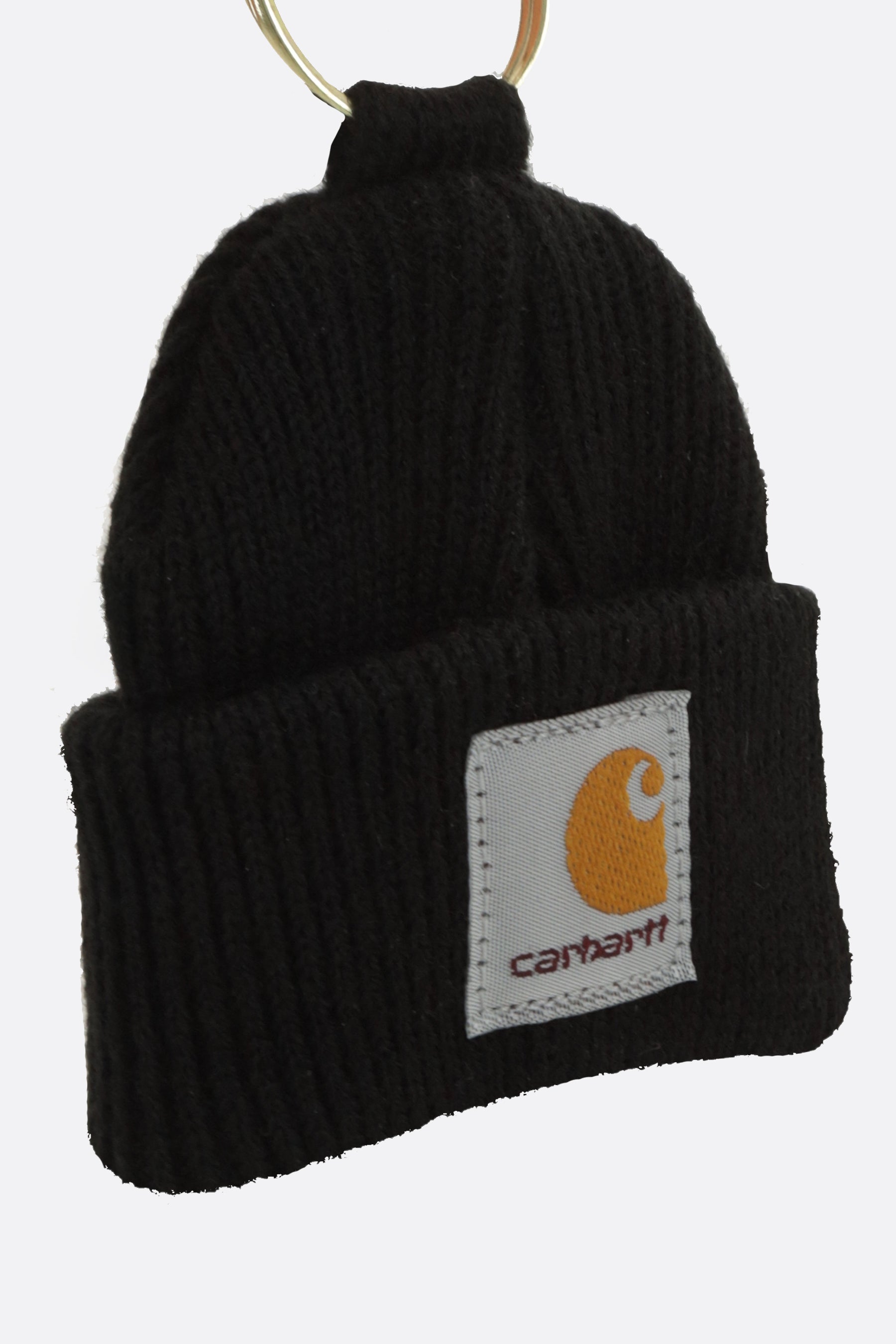 Carhartt WIP keychain made of black ribbed knit with a logo patch and gold-tone metal spiral ring.