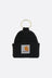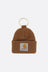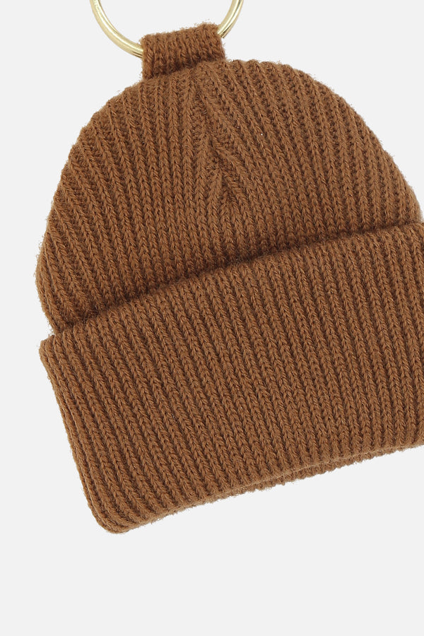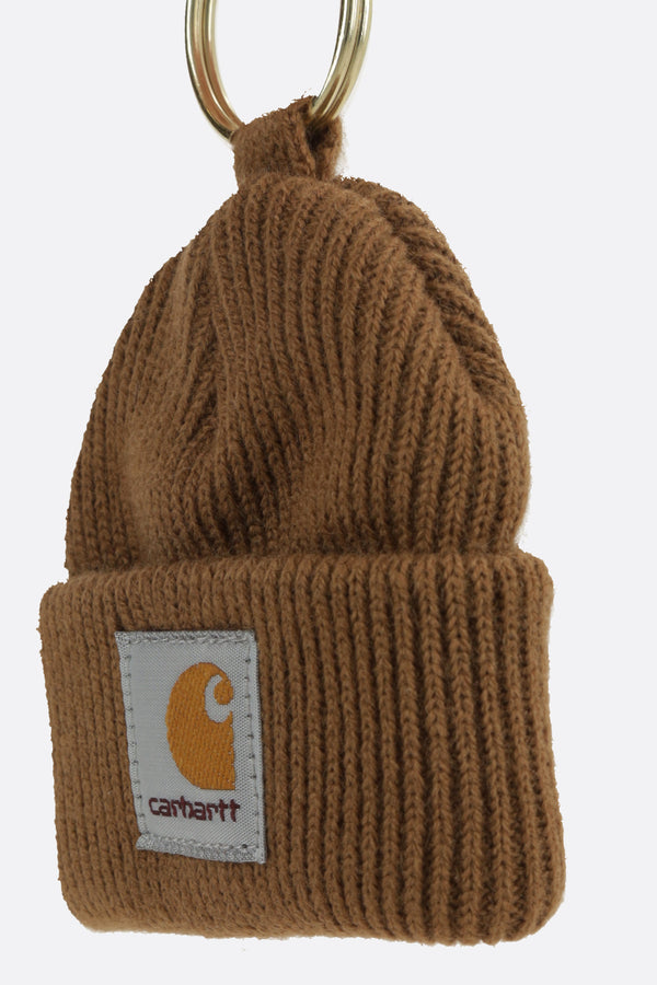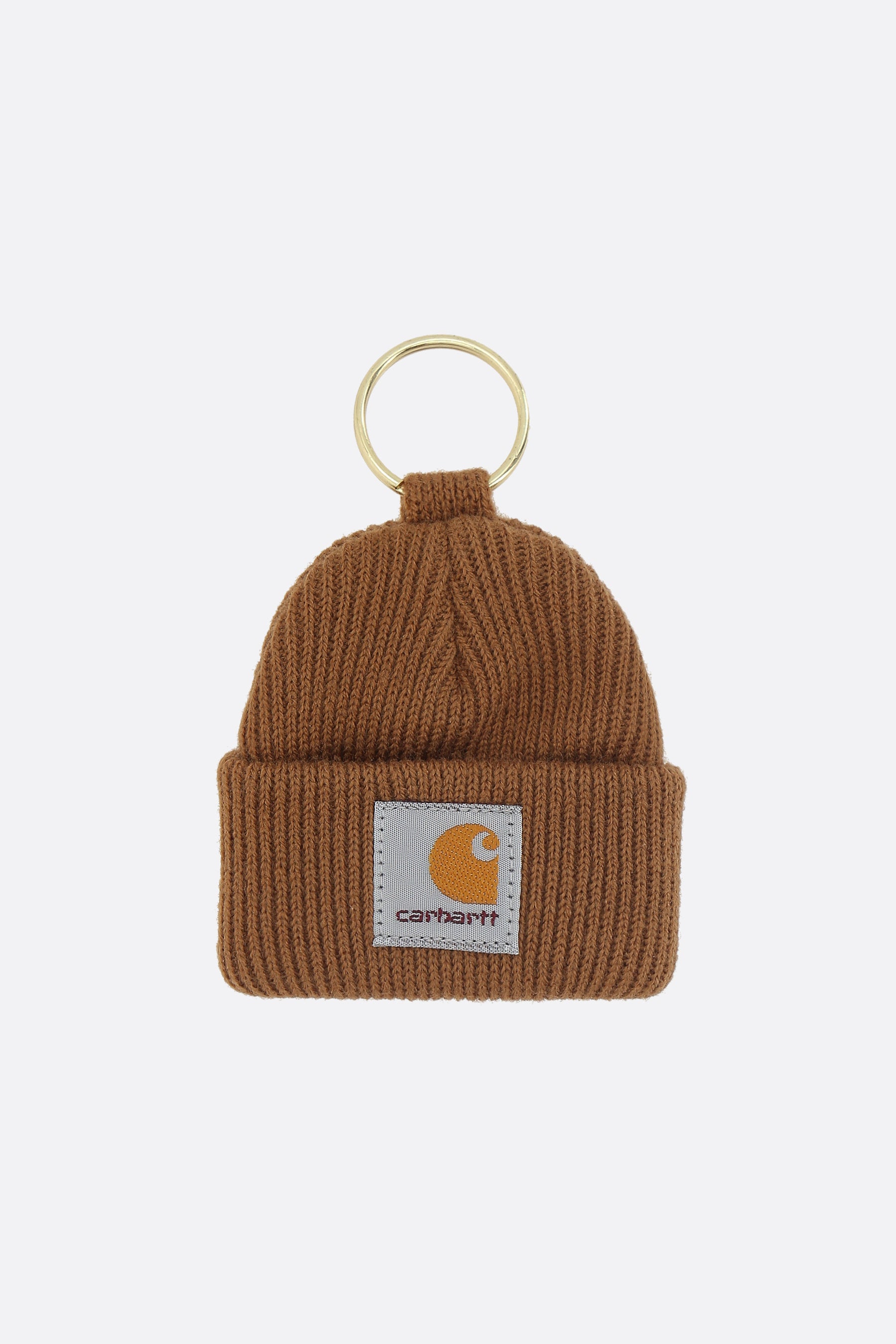 Carhartt WIP keychain made of brown ribbed knit with a logo patch and gold-tone metal spiral ring.
