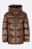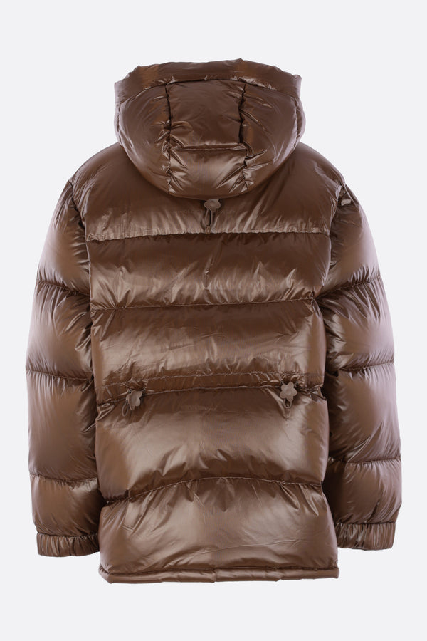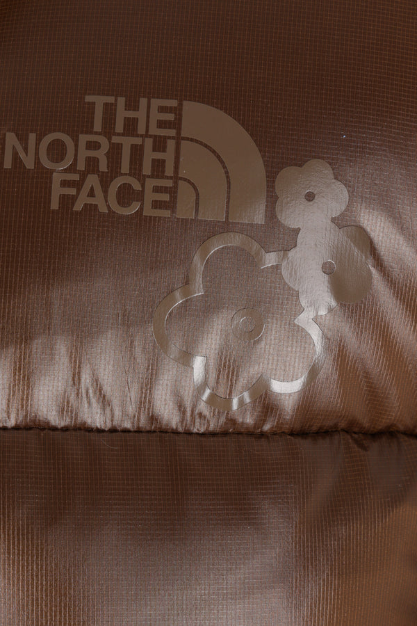 Down jacket by Cecilie Bahnsen designed in collaboration with The North Face, made of brown nylon. Features a drawstring hood, two-way zip closure, multiple pockets, long sleeves with buttoned cuffs, and a straight hem.