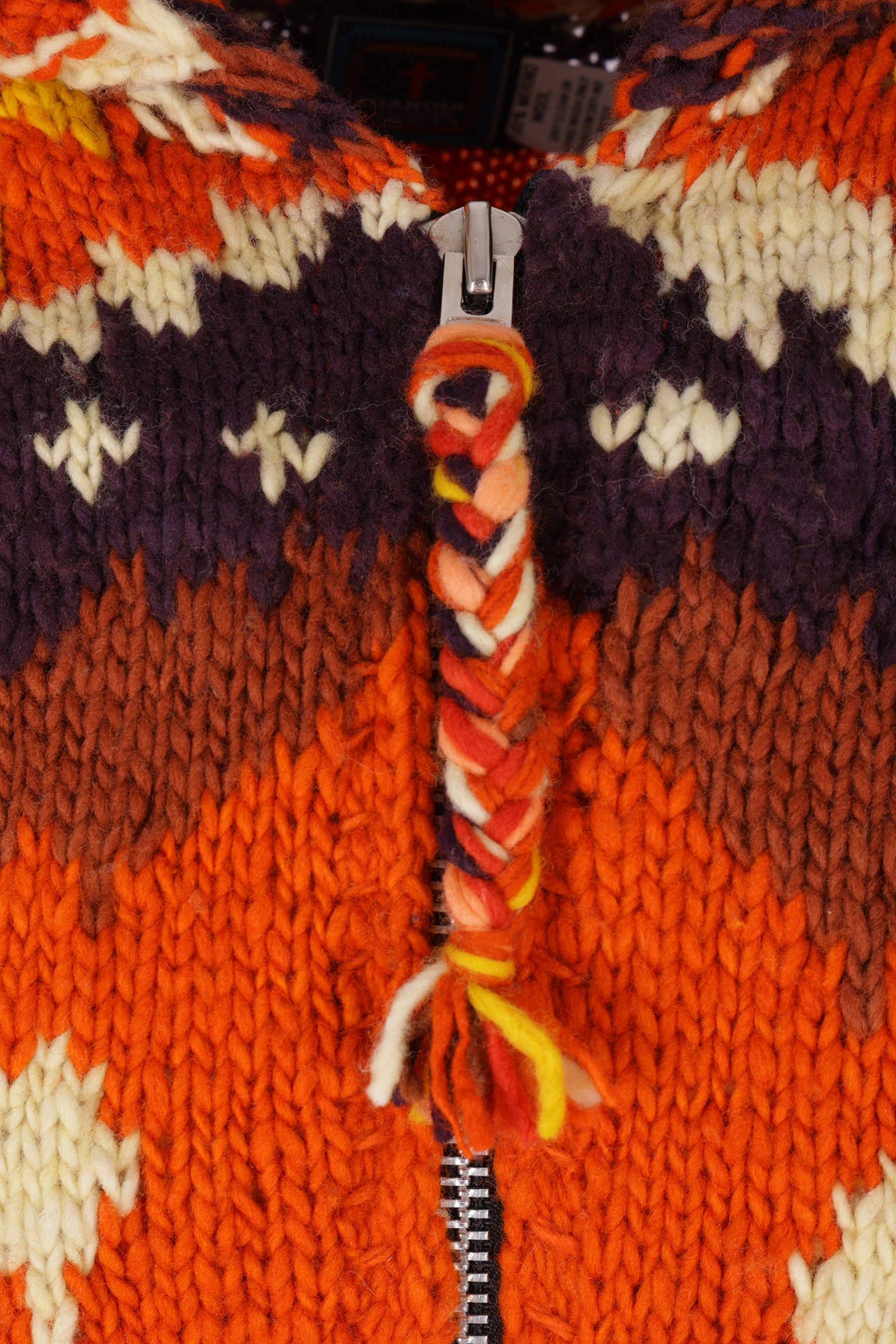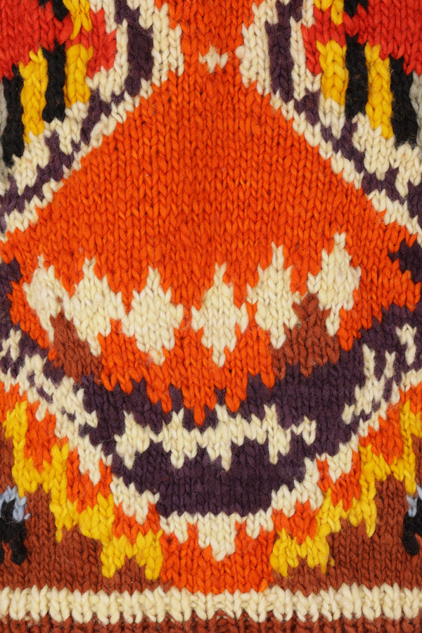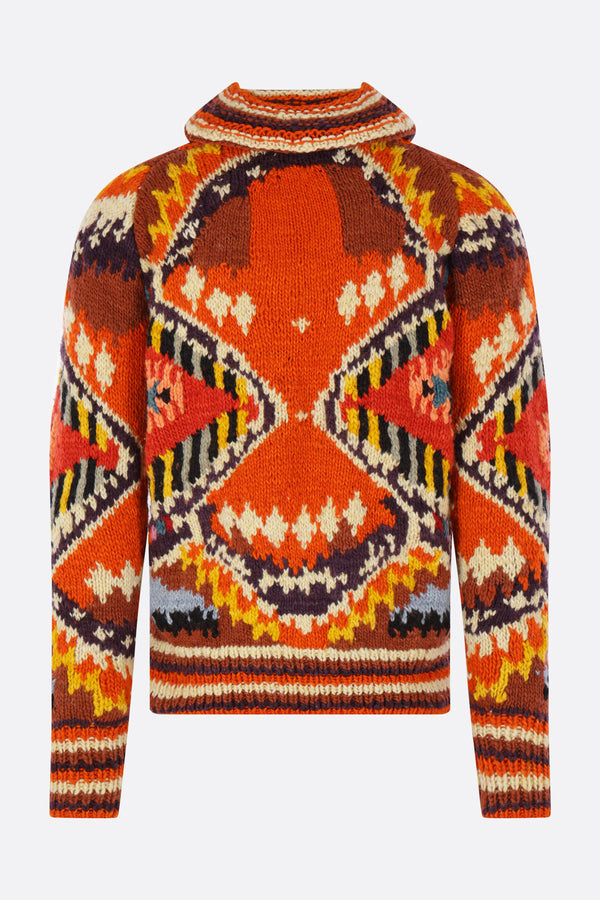 Chamula cardigan handknitted from multicolor merino wool with a geometric pattern. Featuring a hood, front zip closure, welt pockets, long sleeves, and ribbed edges.