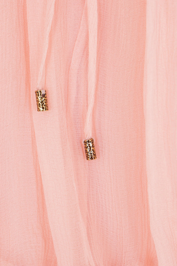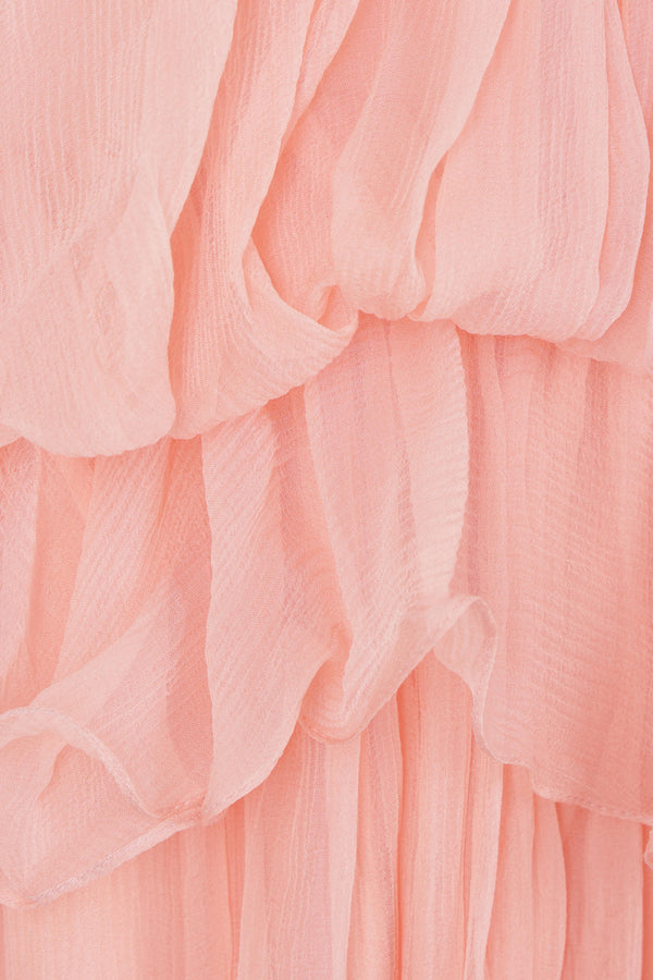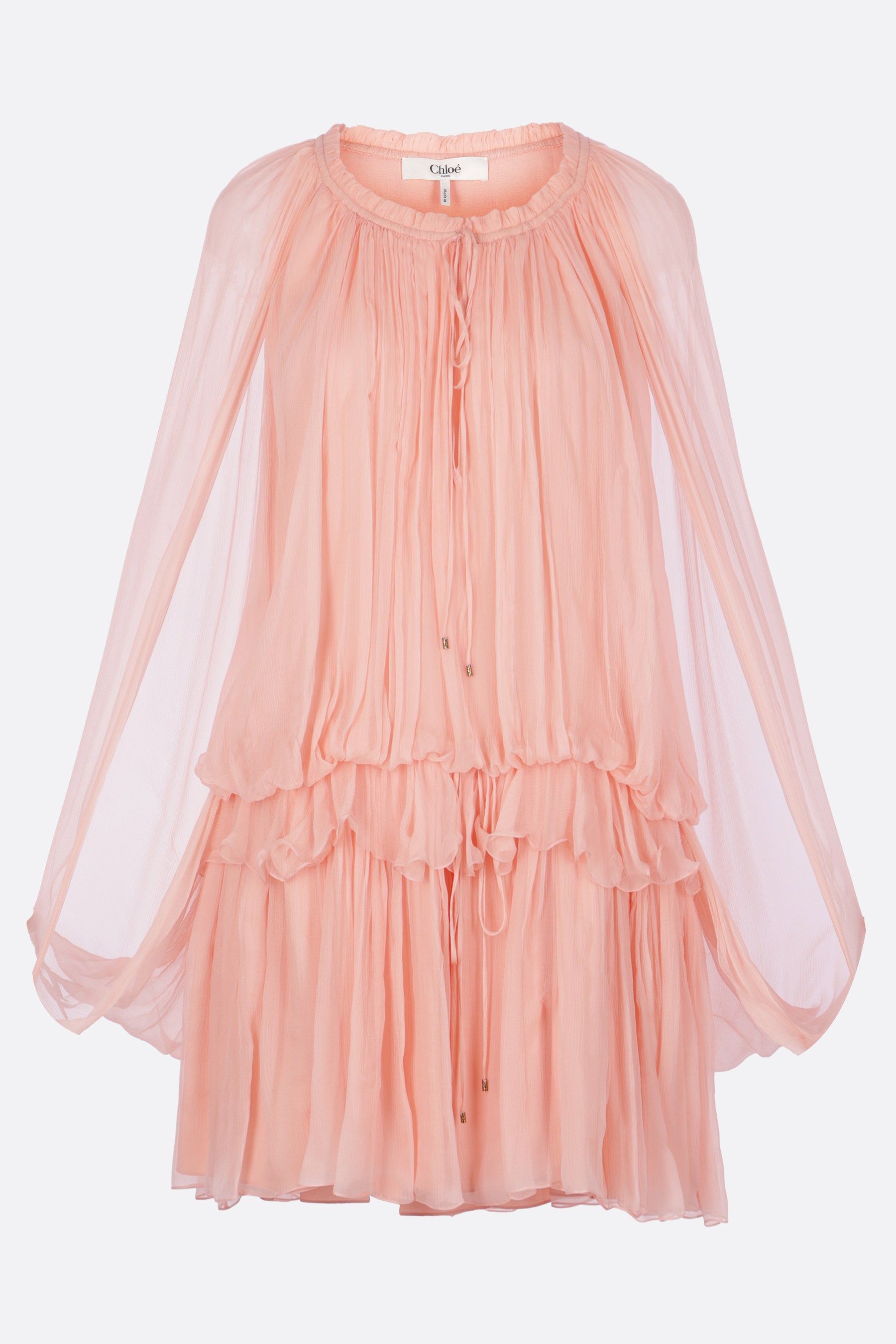 Chloé mini dress in pink silk mousseline with drawstring detailing at the waist and neckline. Featuring a gathered wide neckline, waist ruffles, integrated cape detail, and lined interior.