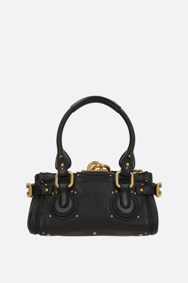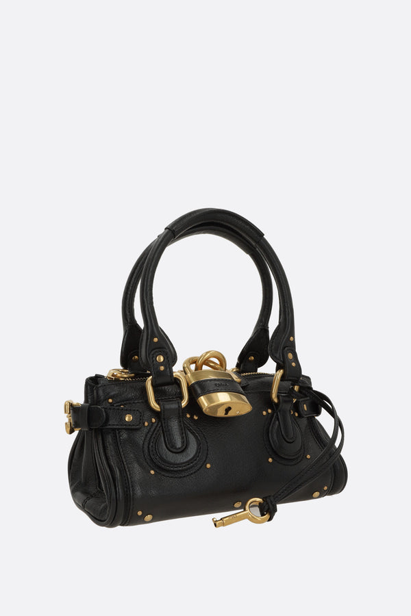 Chloé handbag crafted from black grained leather with metal studs. Featuring gold-tone hardware, zip closure, double handles, side buckles, and an oversized decorative padlock with keys. The black canvas-lined interior includes a zip pocket. The design is completed with flat pockets on both sides.