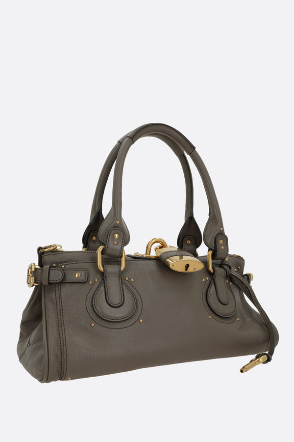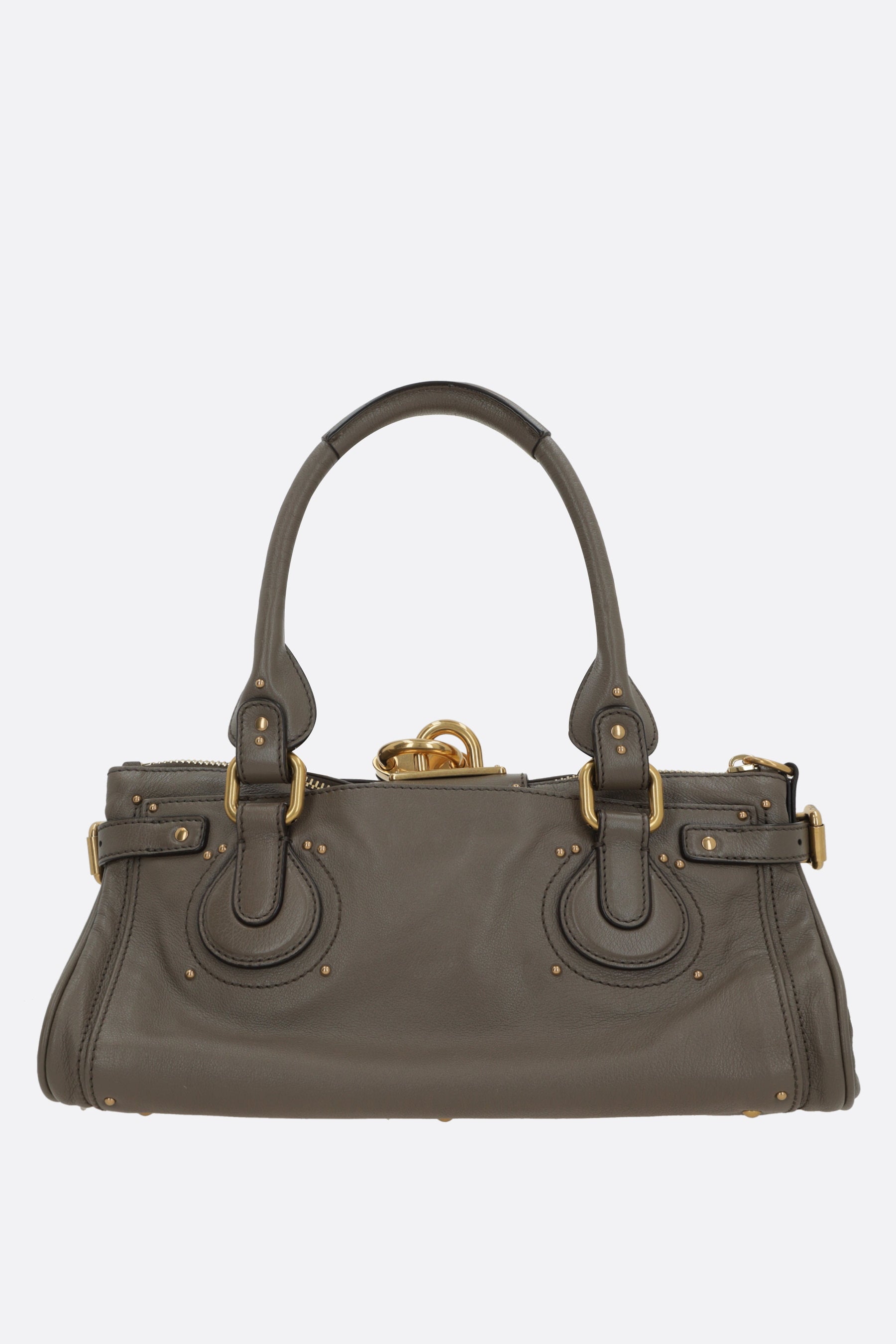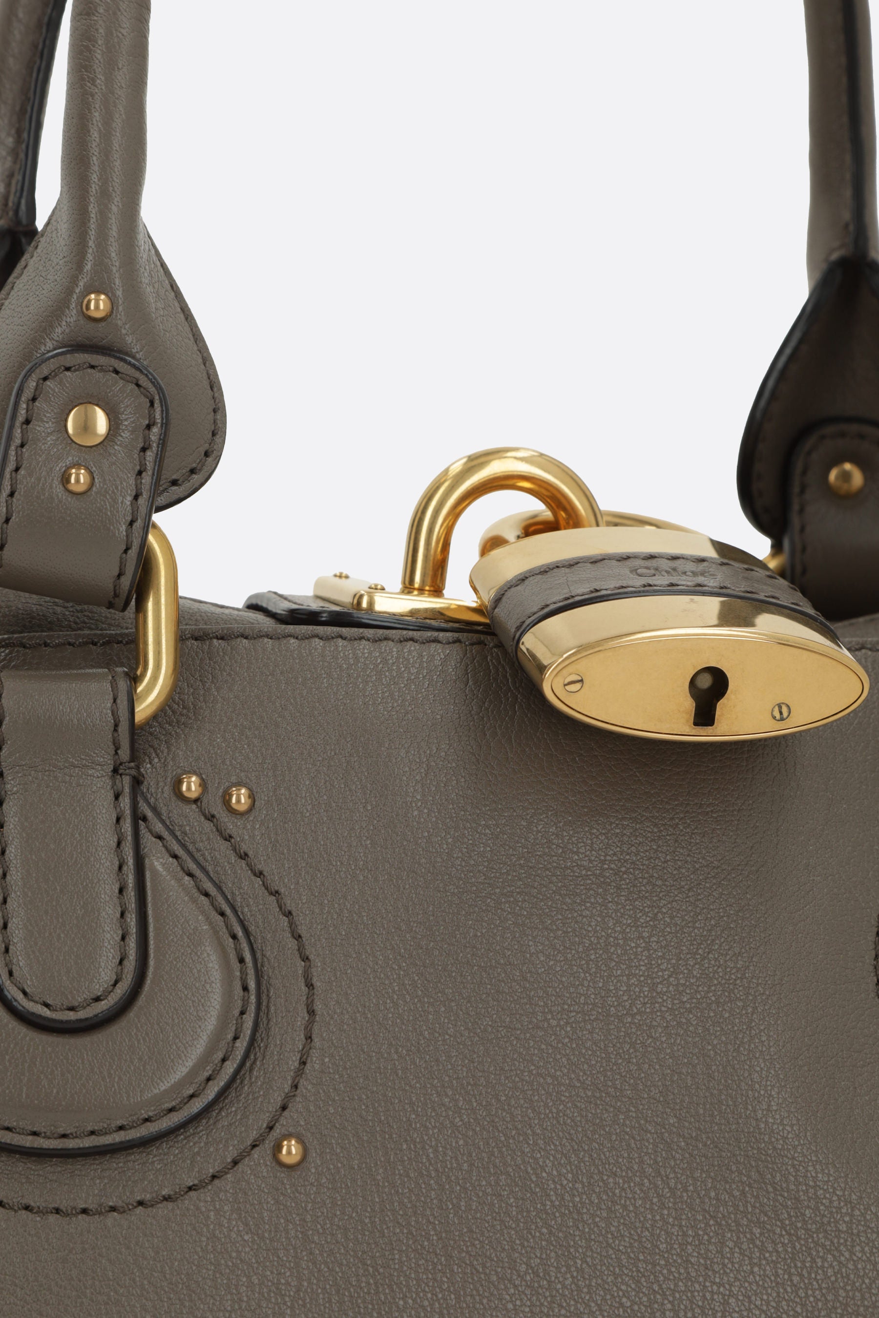 Chloé handbag crafted from taupe grey grained leather with metal studs. Featuring gold-tone hardware, zip closure, double handles, side buckles, and an oversized decorative padlock with keys. The black canvas-lined interior includes a zip pocket. The design is completed with flat pockets on both sides.
