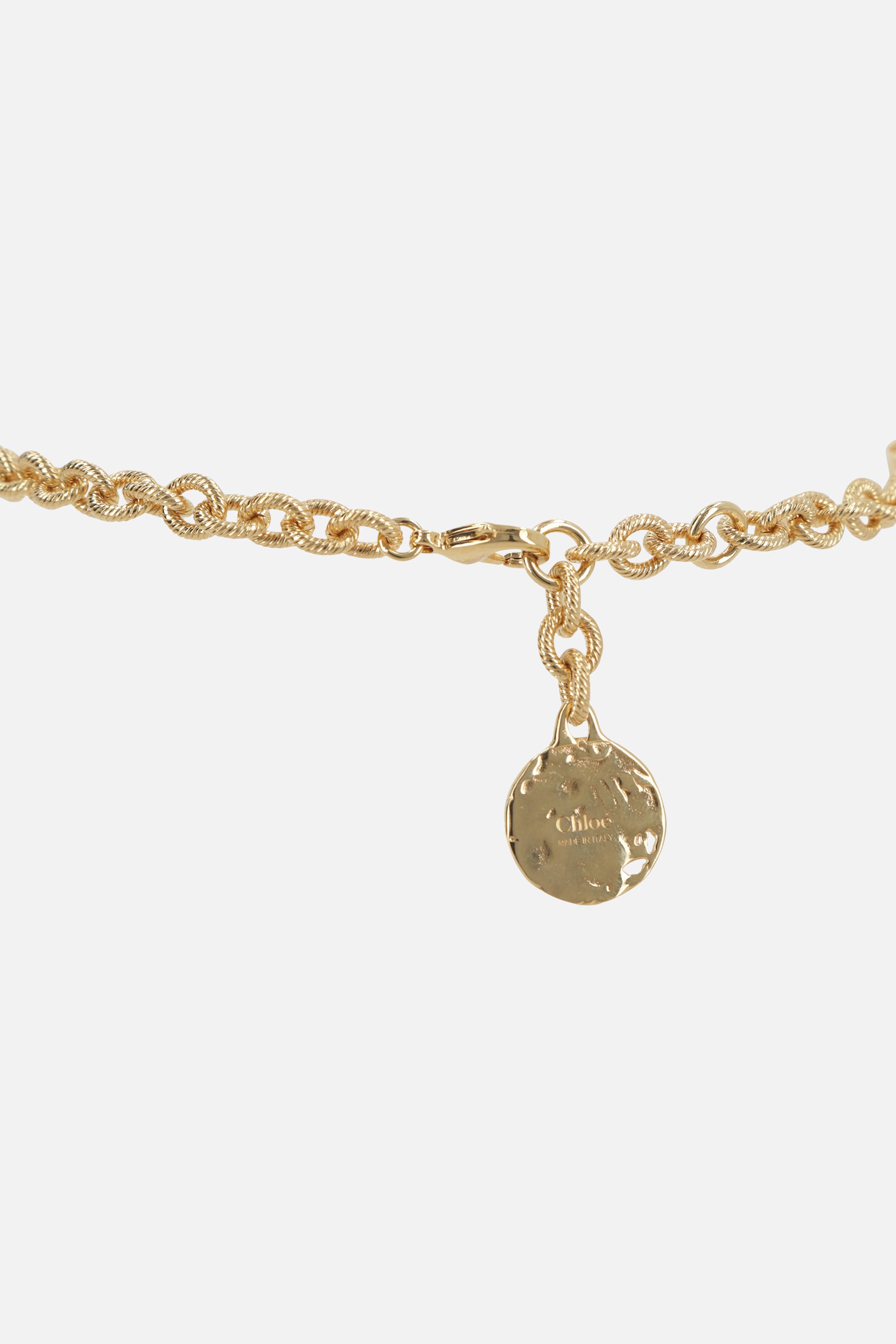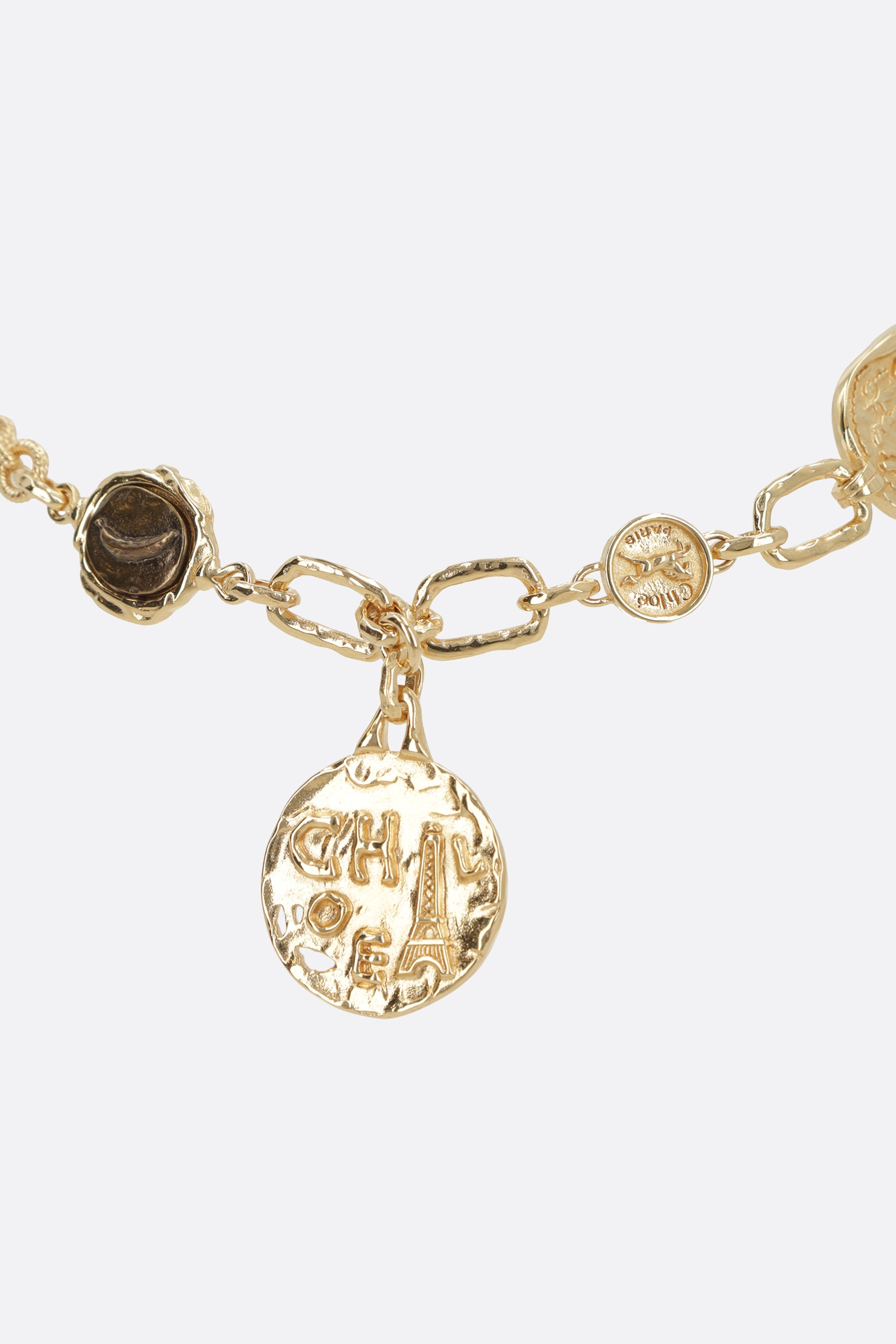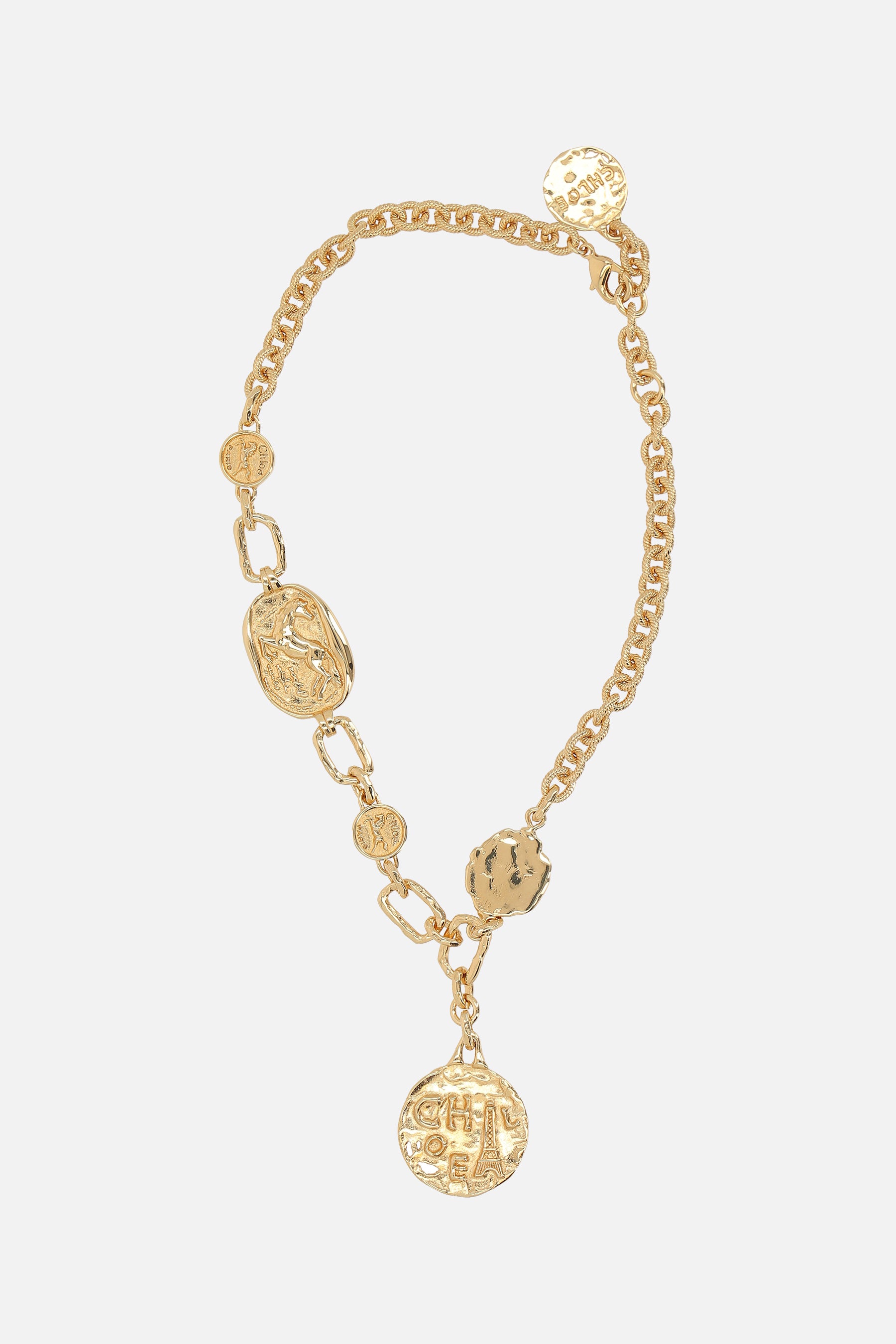 Chloé choker crafted in gold-finish brass, featuring a series of logo-engraved medals in various shapes and designs. It is completed with an adjustable hook closure.